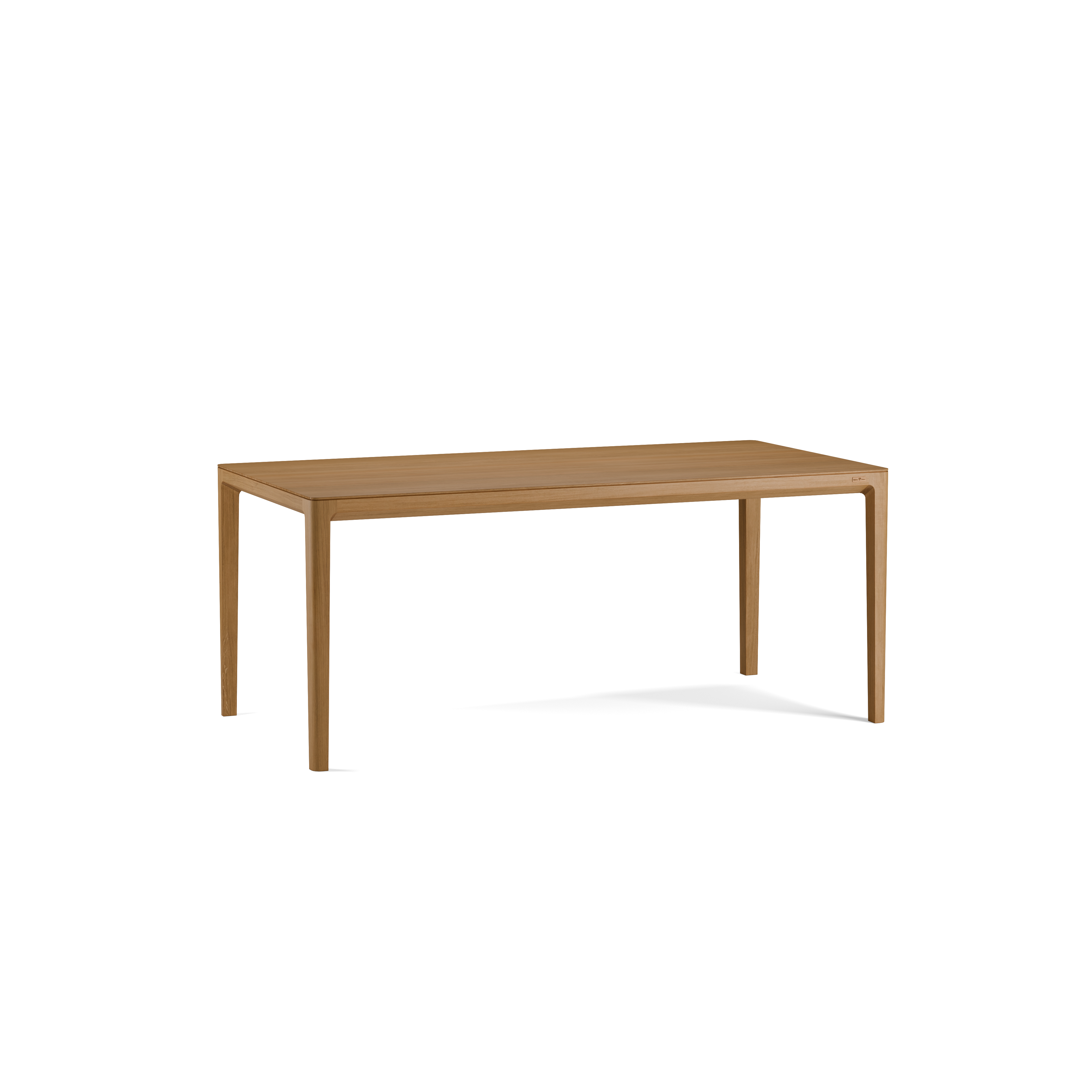 Was sofort ins Auge fällt, ist die tänzerische Leichtigkeit und Eleganz dieses – scheinbar – schlichten Tisches. Denn bei genauerem Hinsehen offenbaren sich viele raffinierte Details. Etwa die außen gerundeten, innen kantigen, schlanken Tischbeine. Sie sind an den äußersten Ecken positioniert, was Tenso Tiefe und Weite verleiht. An ihrem oberen Ende gehen die Beine mit einem schönen Bogenschwung in die niedrige, abgeschrägte Zarge über. Darauf sitzt, durch eine reizvolle Schattenfuge abgesetzt und scheinbar schwebend, die optisch zart wirkende, in Wahrheit aber fast 2 cm starke Tischplatte mit abgerundeten Ecken.