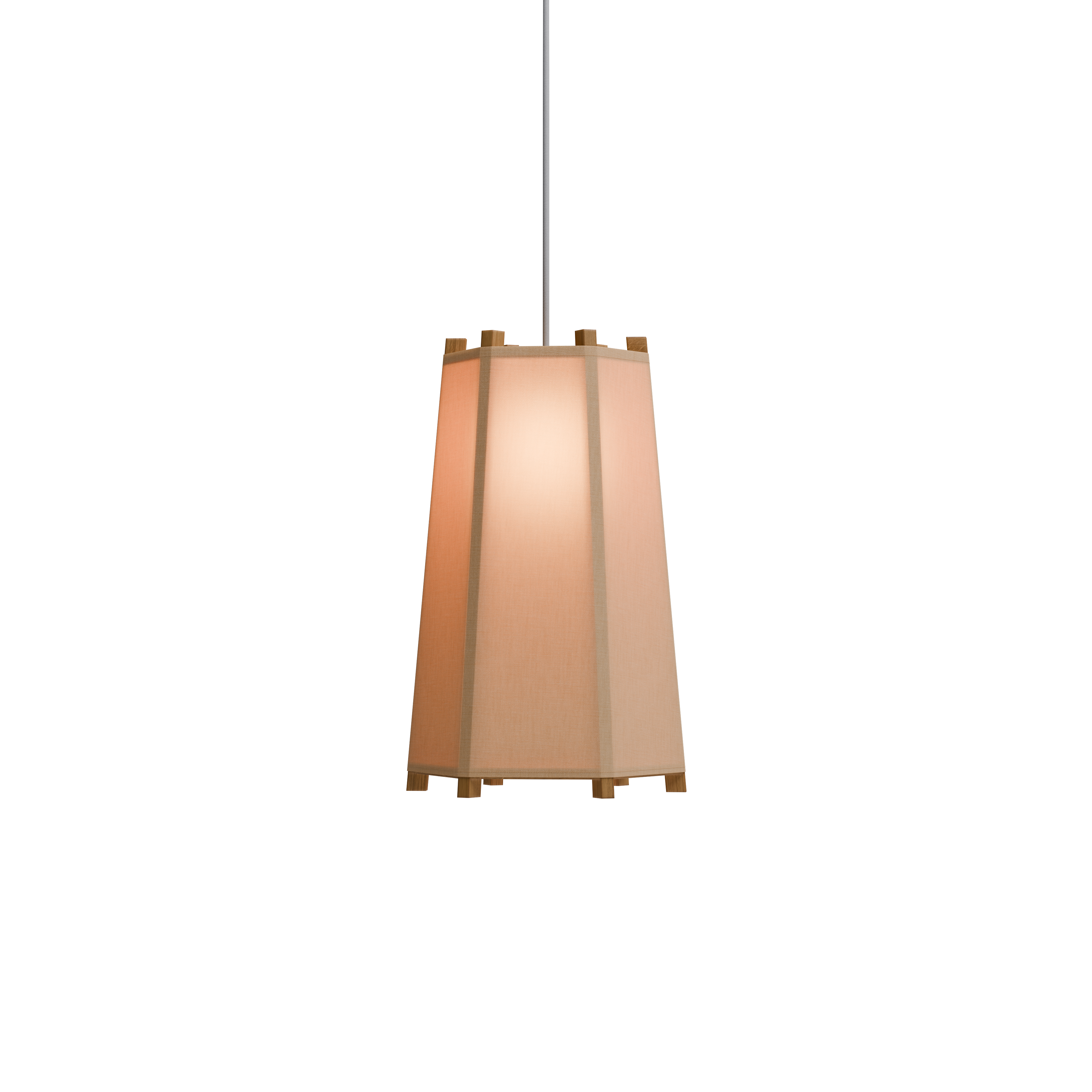 Das hölzerne Gestell des Leuchtenschirms besteht aus einem 6-eckigen Ring und einer 6-eckigen Platte, die durch 6 Spanten miteinander verbunden sind. Der über das Gestell gestülpte, straff sitzende Leuchtenschirm aus Baumwollgewebe sorgt für warmes, angenehmes Licht.