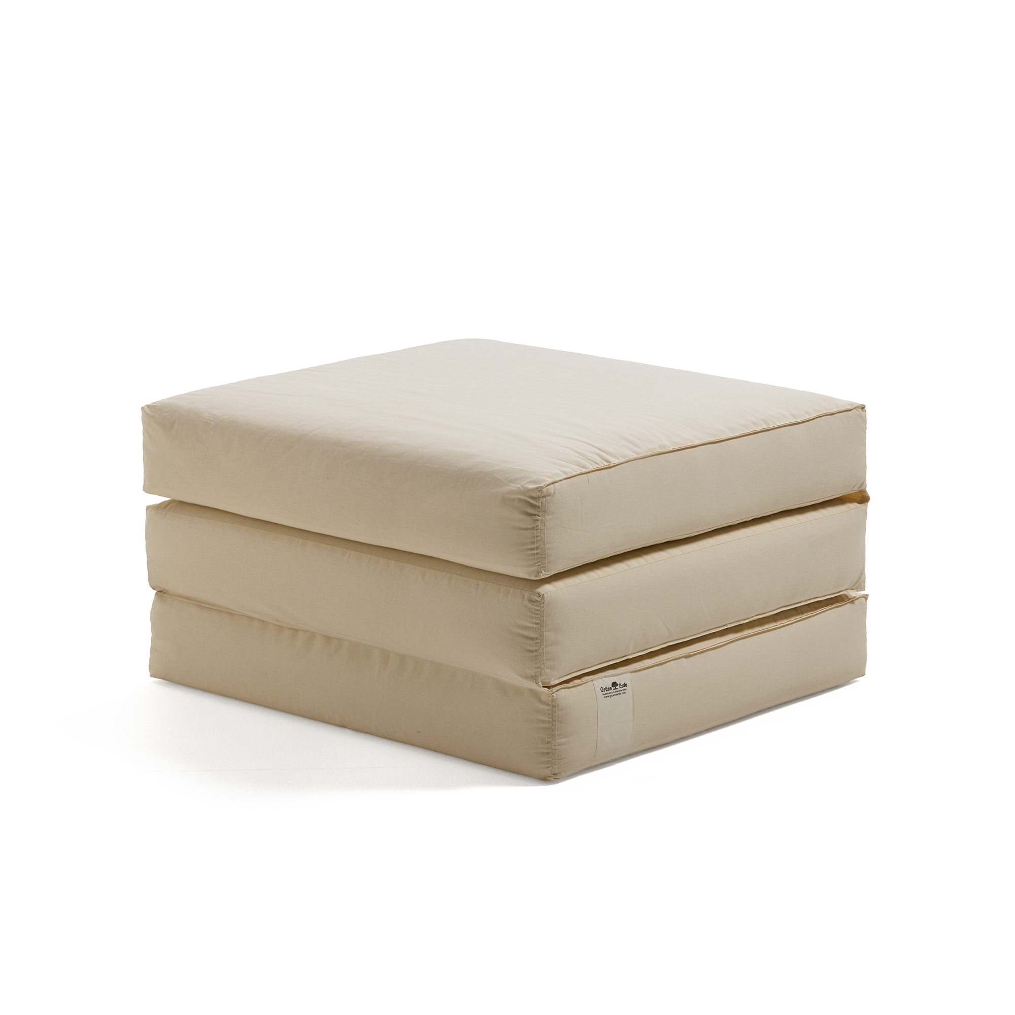 Tamu wird in unserer Textilwerkstätte in der Grüne Erde-Welt (Oberösterreich) zu 100 % aus Naturmaterialien handwerklich gefertigt. Der 40 cm hohe Hocker besteht aus drei gleich großen, aneinandergenähten Polsterteilen (jeweils 75 x 67 x 13 cm), die sich auseinanderklappen lassen.