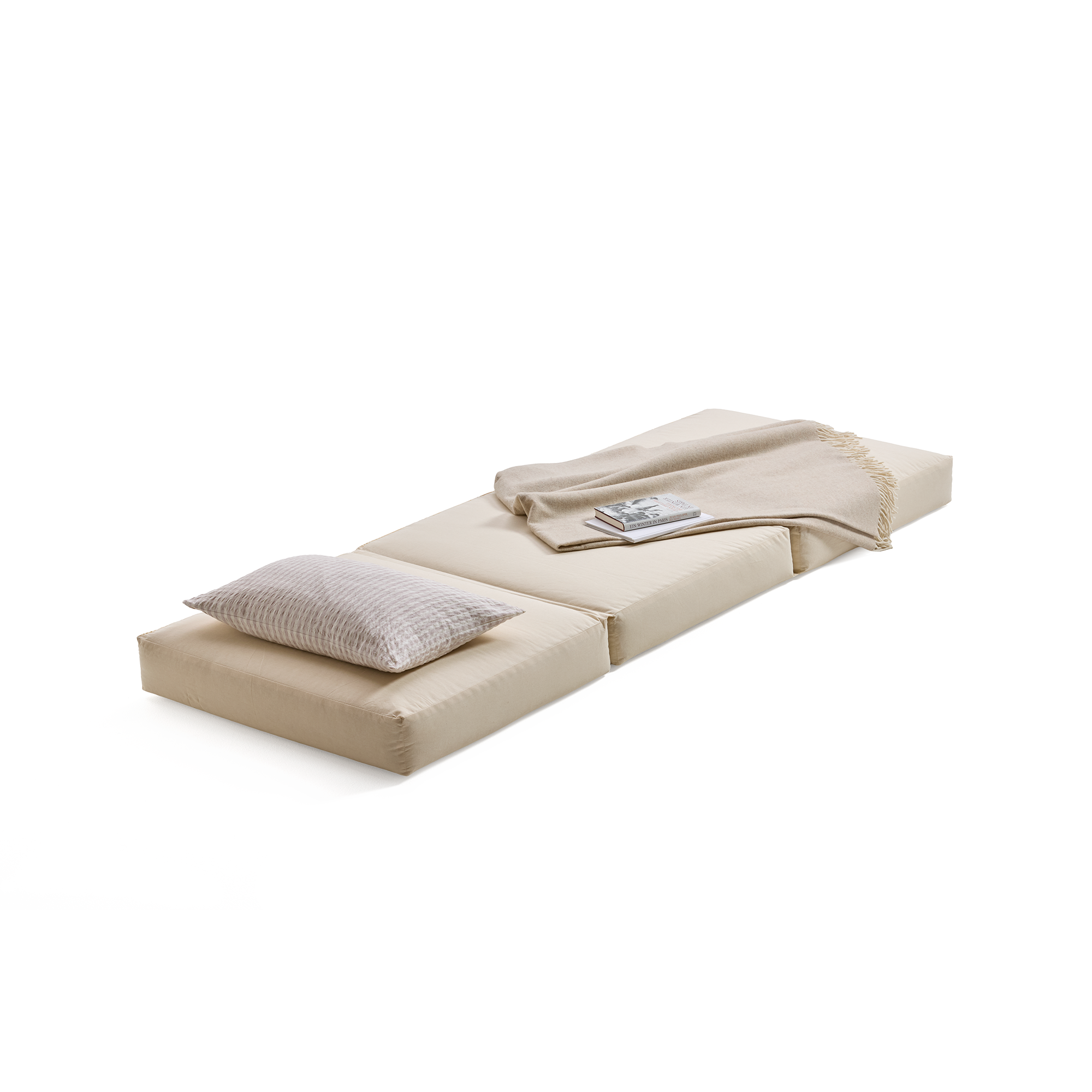 Tamu Pur ist ein komfortables Sitz-, Liege- und Wohnmöbel mit weichem, spielerischem, informellem Charakter: Zusammengeklappt dient der Hocker als All-Zweck-Sitzgelegenheit im Wohn- oder Kinderzimmer. Auseinandergeklappt ist er eine 201 x 75 x 13 cm große, komfortable Liege für den Tag bzw. eine Matratze für die Nacht.