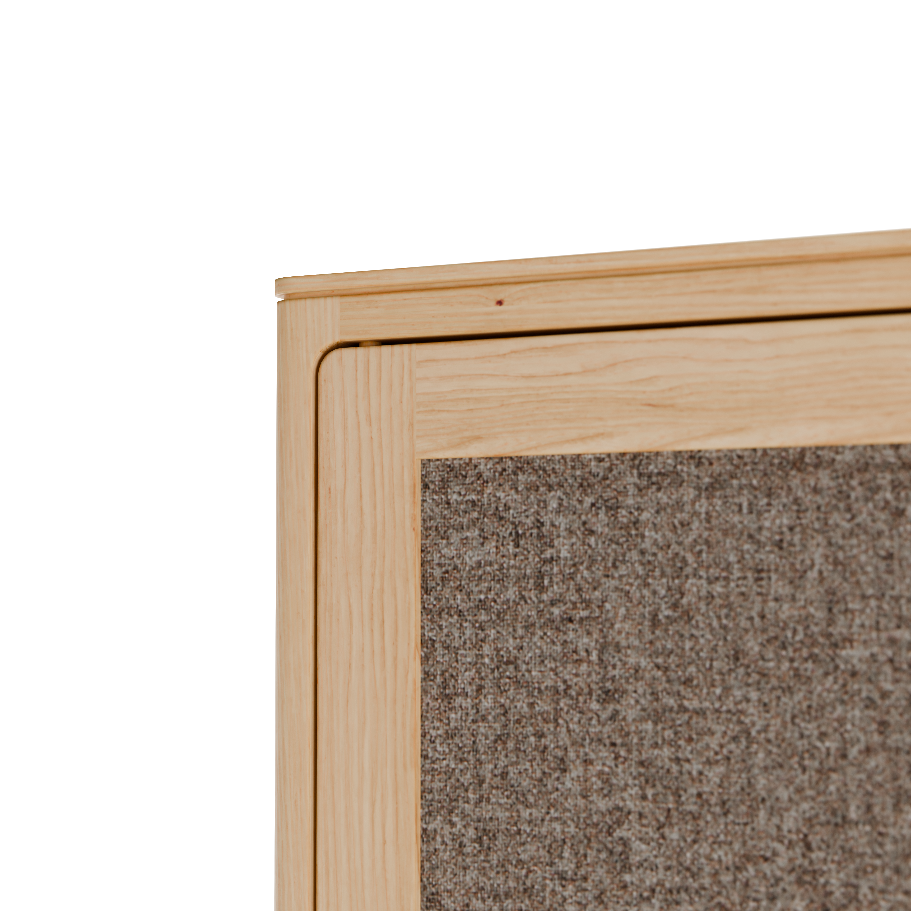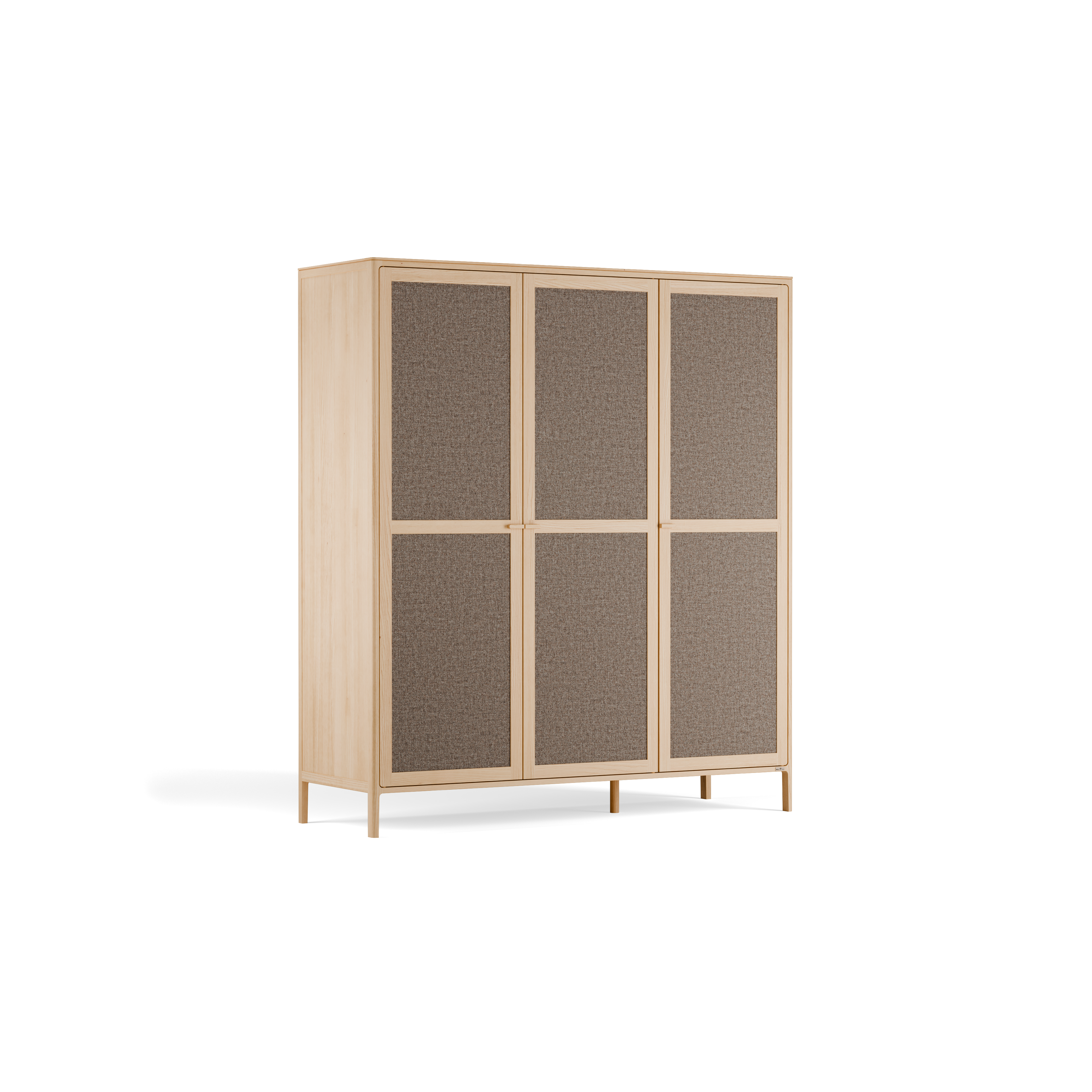 Rahmen und Füße: Massivholz; Holzfüllungen der Türen, sowie Seiten- und Rückwände: verwindungsfestes Schichtholz (Pappel), Deckfurnier in der Holzart des Rahmens; Stofffüllungen: 100 % Schurwolle (Schaf), IVN NATURTEXTIL BEST-zertifiziert.