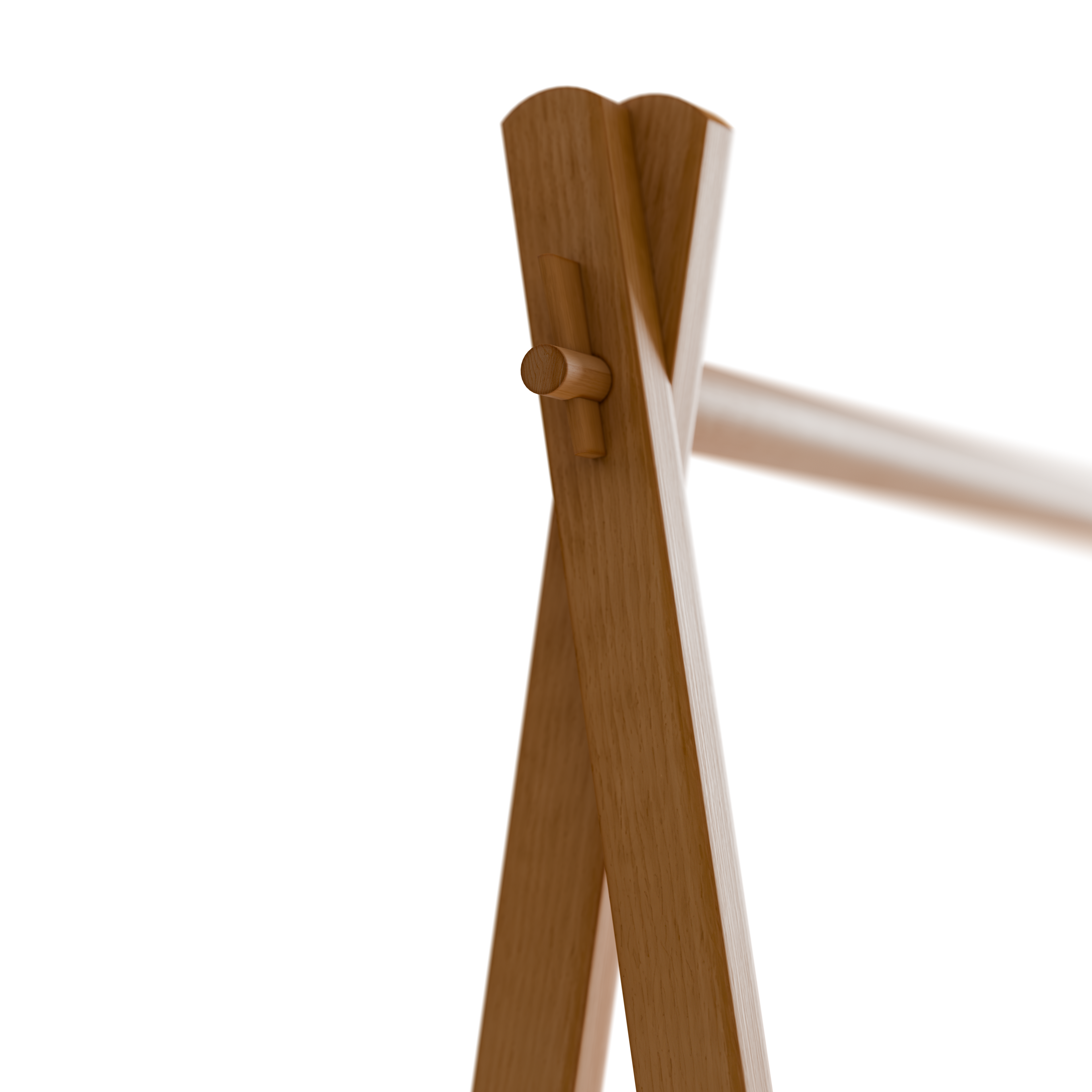 Die Bauteile werden von genial einfachen, im Prinzip uralten, bei Bedarf wieder lösbaren Zapfen & Keil-Steckverbindungen sowie reißfesten Baumwollgurten fest zusammengehalten. Der Kleiderständer kann ohne Qualitäts- und Funktionsverlust wiederholt montiert und zerlegt werden, etwa bei einem Wohnungswechsel.