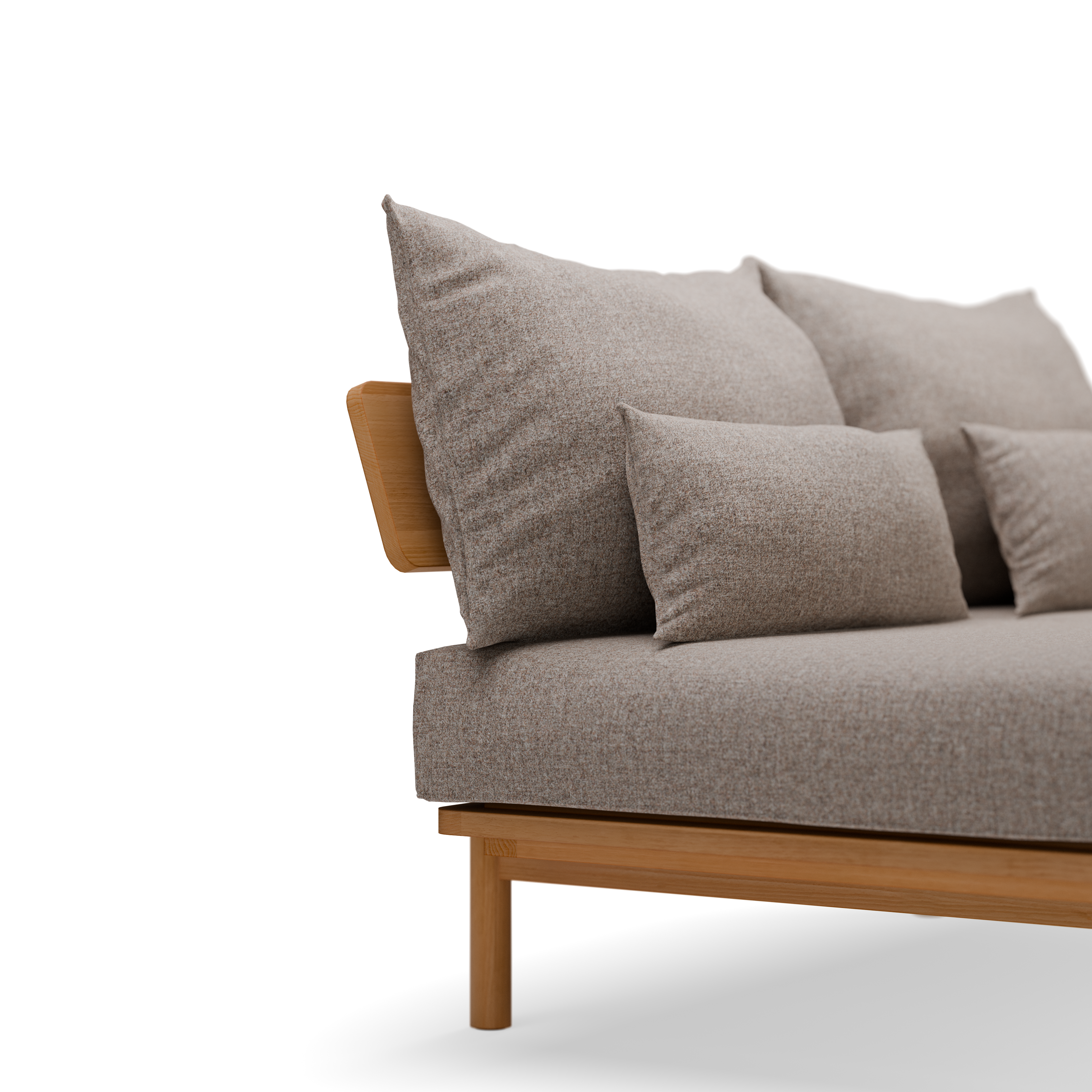 An der Unterseite der Polsterung aufgenähte Stofflaschen nehmen Federleisten aus Buchenholz auf, die wie ein elastischer Lattenrost wirken. Die Sitzpolster liegen passgenau und unverrückbar im Rahmen des Unterbaus. Die Rückenpolster lehnen lose an einem breiten Massivholzsteg, der Lana eine schöne Rückenansicht verleiht.