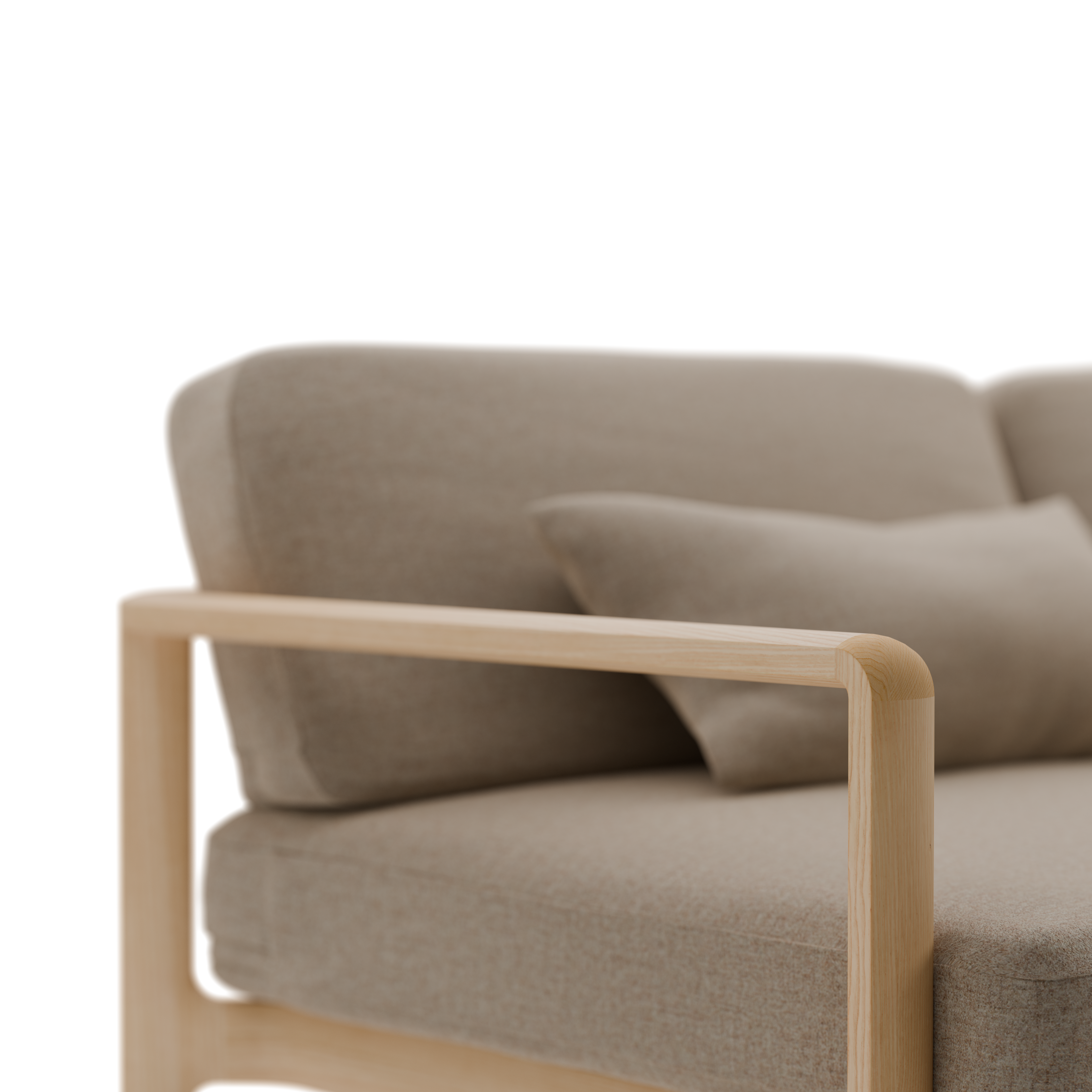 Der elegante, schlanke, feinsinnige Sofarahmen aus fix verleimtem Massivholz – mit sanften, verrundeten, fließenden Übergängen und Verbindungen – umfängt die Polsterelemente relingartig und gibt dem Sofa auch eine reizvolle Rückenansicht.