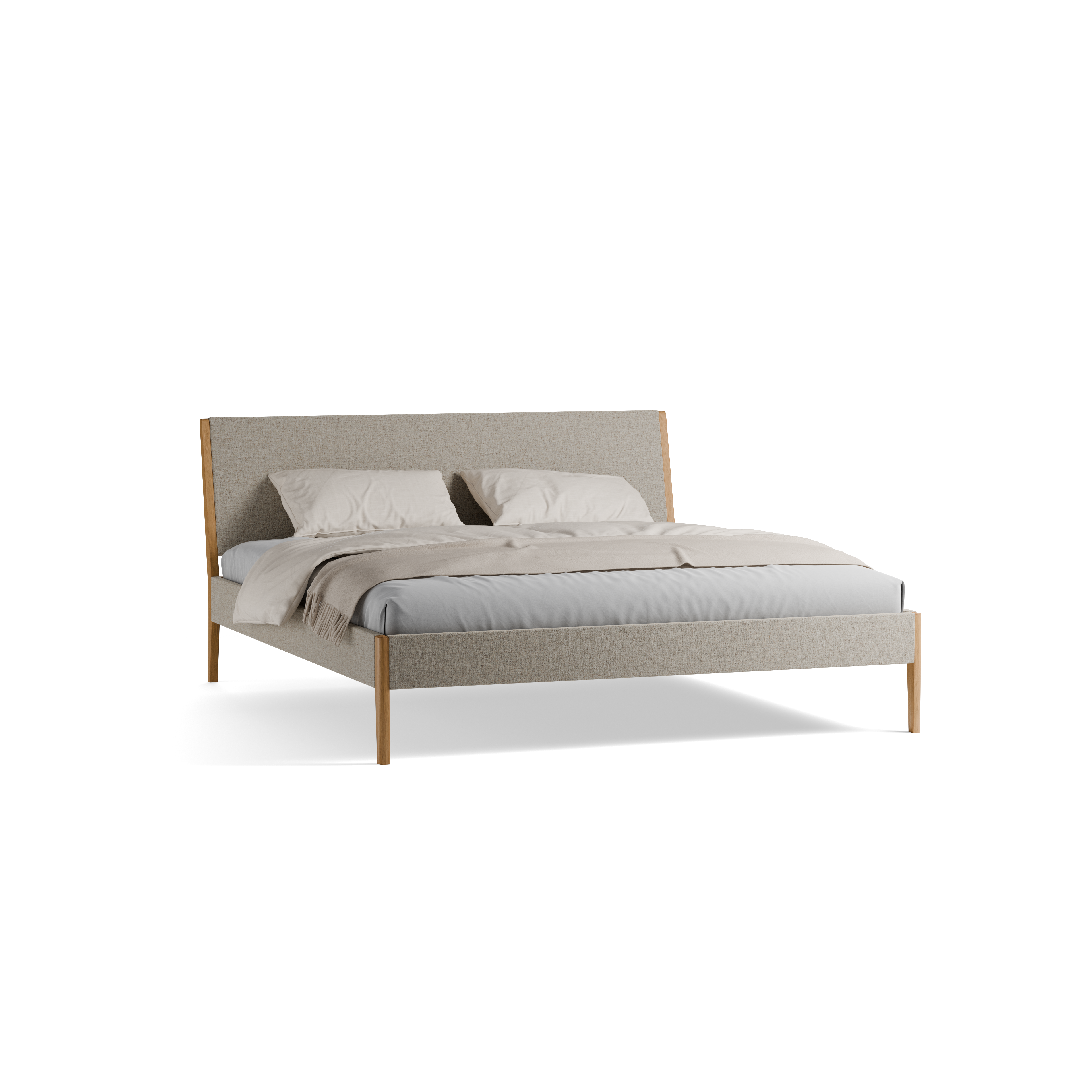 Die gepolsterten Teile von Almeno harmonieren gut mit dessen schlanken, sichtbaren Holzteilen und verleihen dem Bett eine sicht- und fühlbare Eleganz.