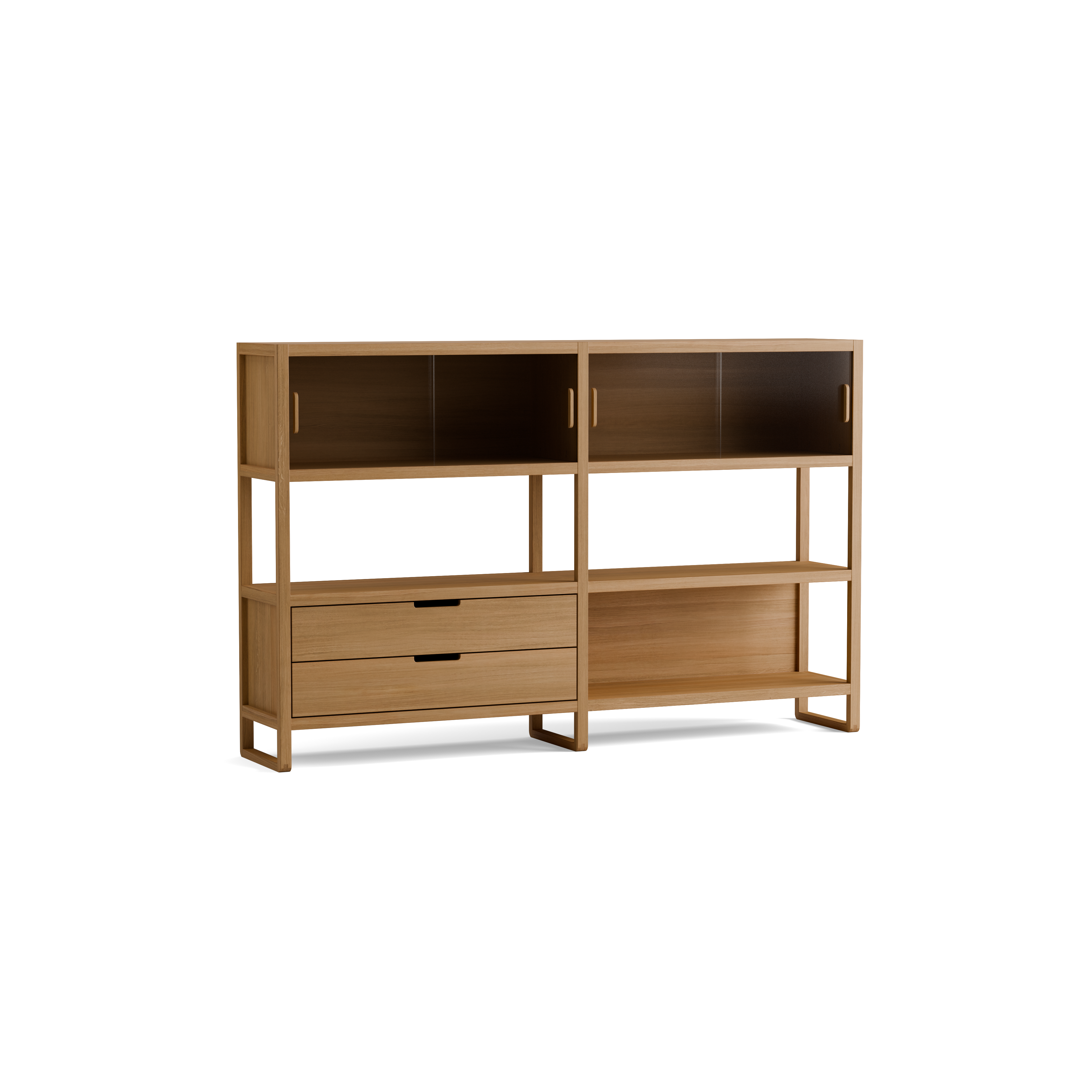 In diese Steher können verschiedene, jeweils 93 cm breite Module eingekoppelt und beliebig miteinander kombiniert werden: Schubladenmodule, Fachbretter, Module mit Schiebetüren aus Glas oder Holz. So lässt sich Quintum individuell gestalten. Man kann auch einen unserer 19 Konfigurationsvorschläge auswählen.