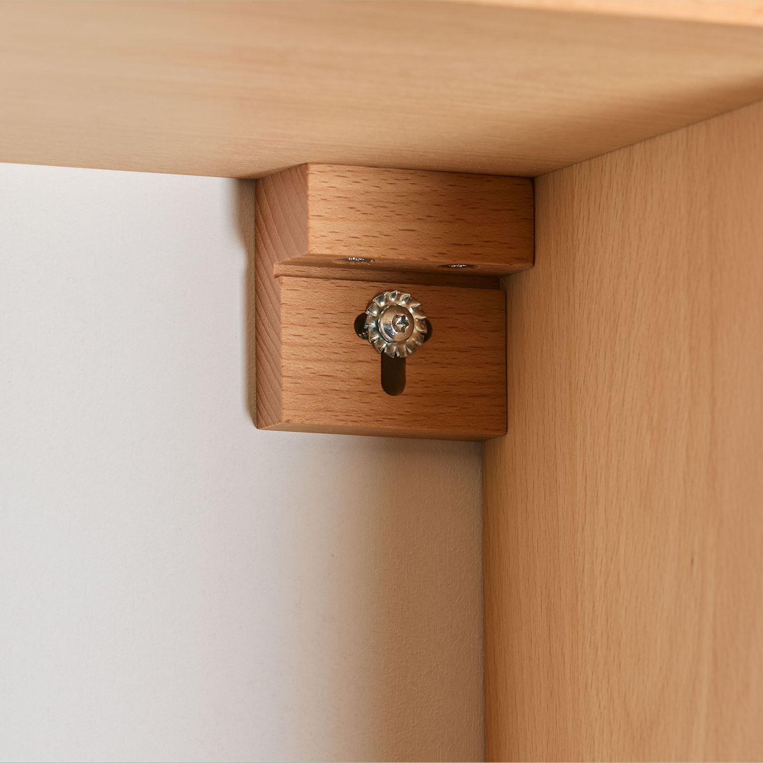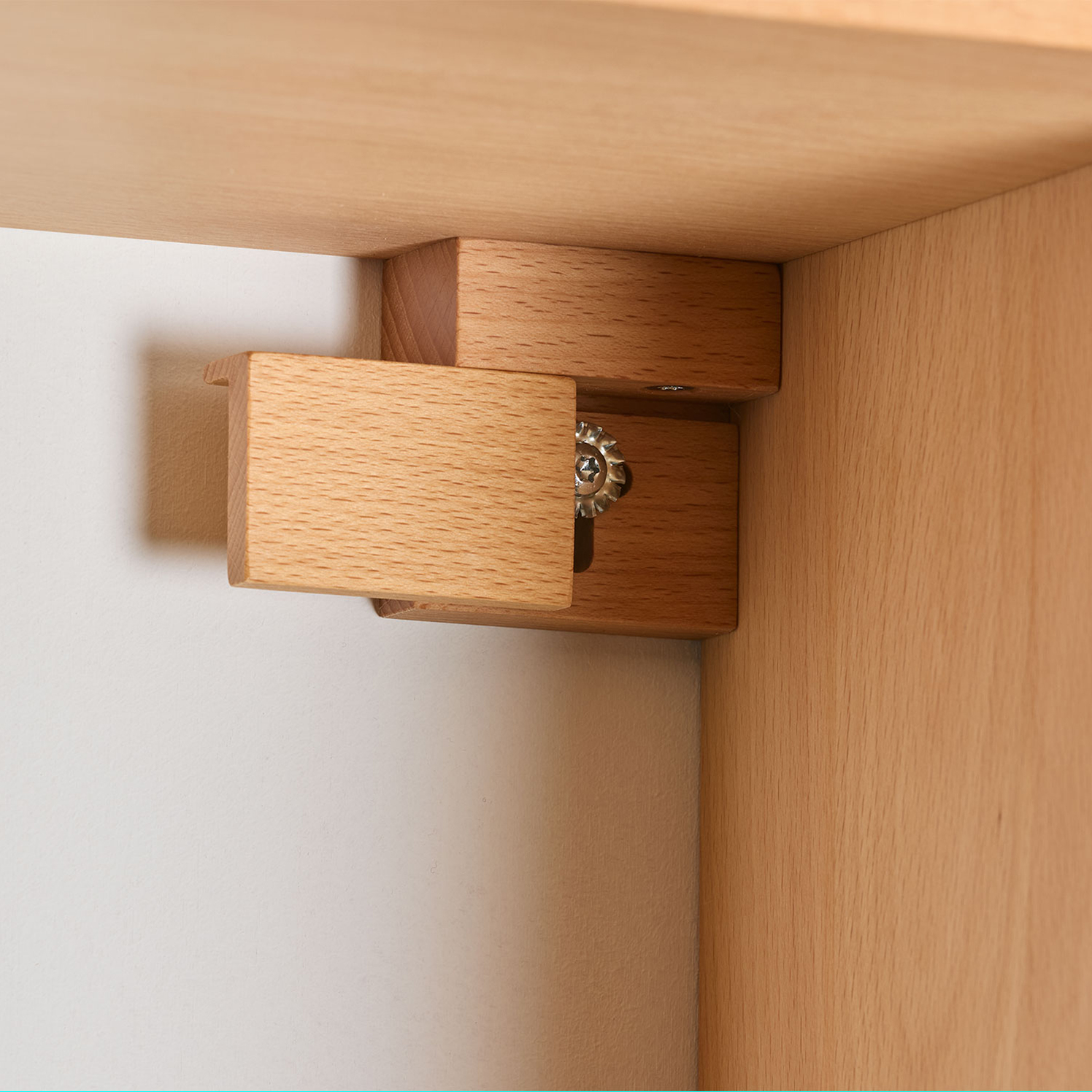 Für das Regal mit 2 Fächern ist 1 Aufhänge-Set, für alle anderen Regale sind 2 Aufhänge-Sets erforderlich. Deren Holzart kann – abgestimmt auf das Regal – in Buche oder Eiche gewählt werden.