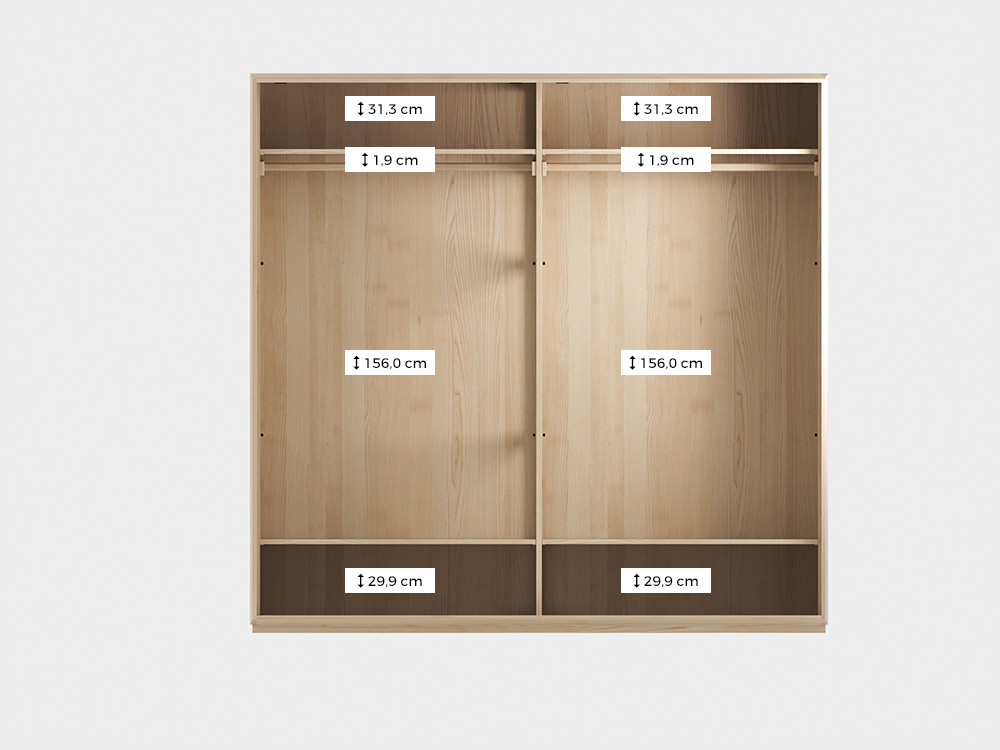 Dies hier ist eine von zehn Varianten des Kleiderschrankes Akumi, die wir für Sie gestaltet haben: eckiger Stil, Schiebetüren, Türfüllungen aus Holz, mit Grund-Innenausstattung (2 Kleiderstangen, 4 Fachbretter) – alles in Esche. Das Holz ist sehr zäh, fest und elastisch. Seine relativ helle Farbe und die eher ruhige Maserung harmoniert gut mit zeitgemäßen, klaren und reduzierten Formen im Möbelbau.