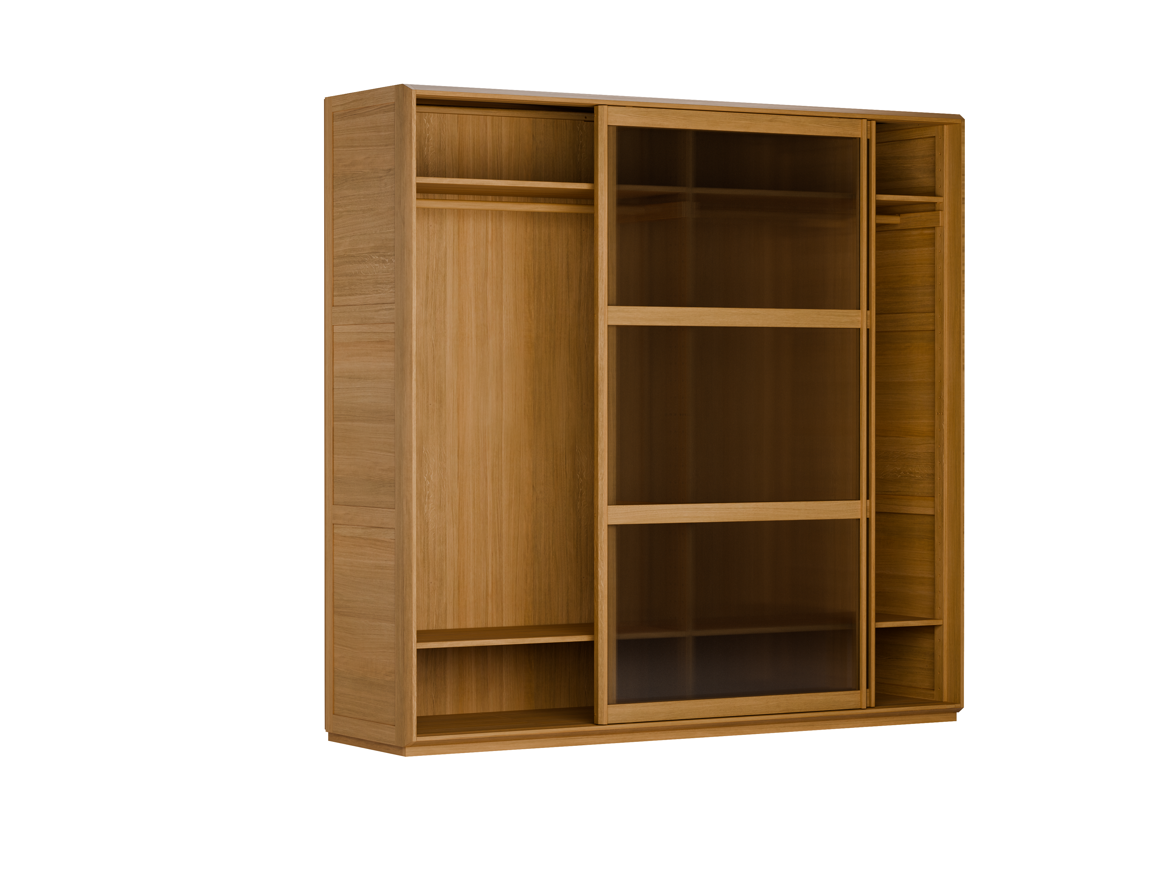 Ausschließlich gerade Linien und Kanten, optisch geschickte Abflachungen und rechte Winkel lassen diesen Schrank trotz seiner Größe elegant erscheinen. Er ist mit sanft gleitenden Schiebetüren ausgestattet, die mit großzügigen, sich über die ganze Schrankhöhe erstreckenden Griffleisten ohne weiteren Platzbedarf im Raum zu öffnen sind.