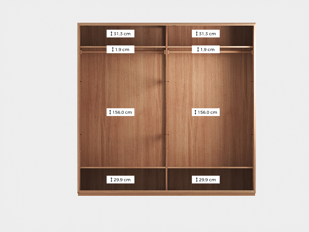 Bitte beachten Sie: Die auf den fotografierten Wohnszenen abgebildete Inneneinrichtung dient als Inspiration. In dieser Variante enthalten sind 2 Kleiderstangen und 4 Fachbretter (Details entnehmen Sie bitte dem Innenleben-Plan). Möchten Sie Ihren Schrank mit weiterer Innenausstattung, wie Laden oder Hosenrechen, ausstatten, nutzen Sie bitte unseren Online-Planer.