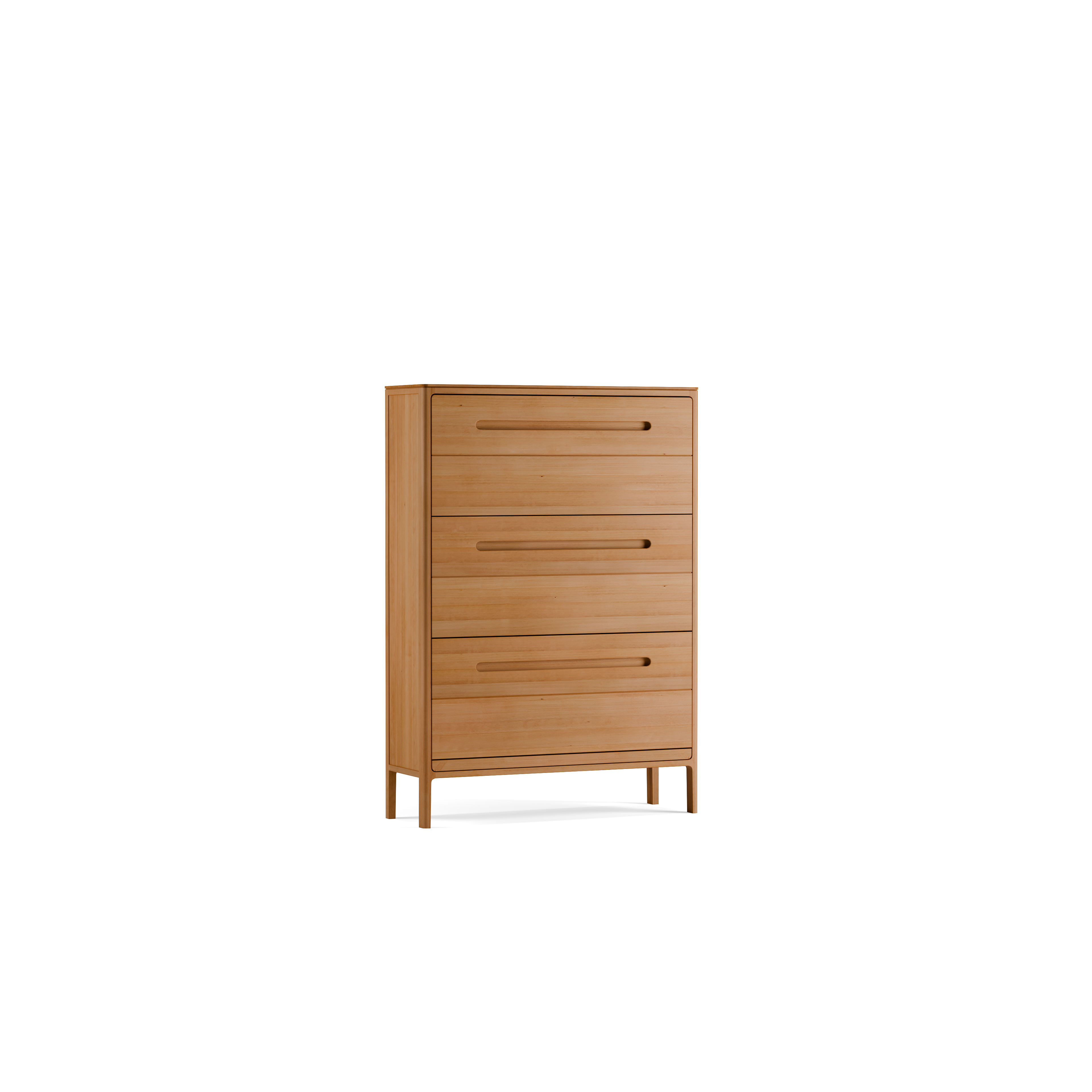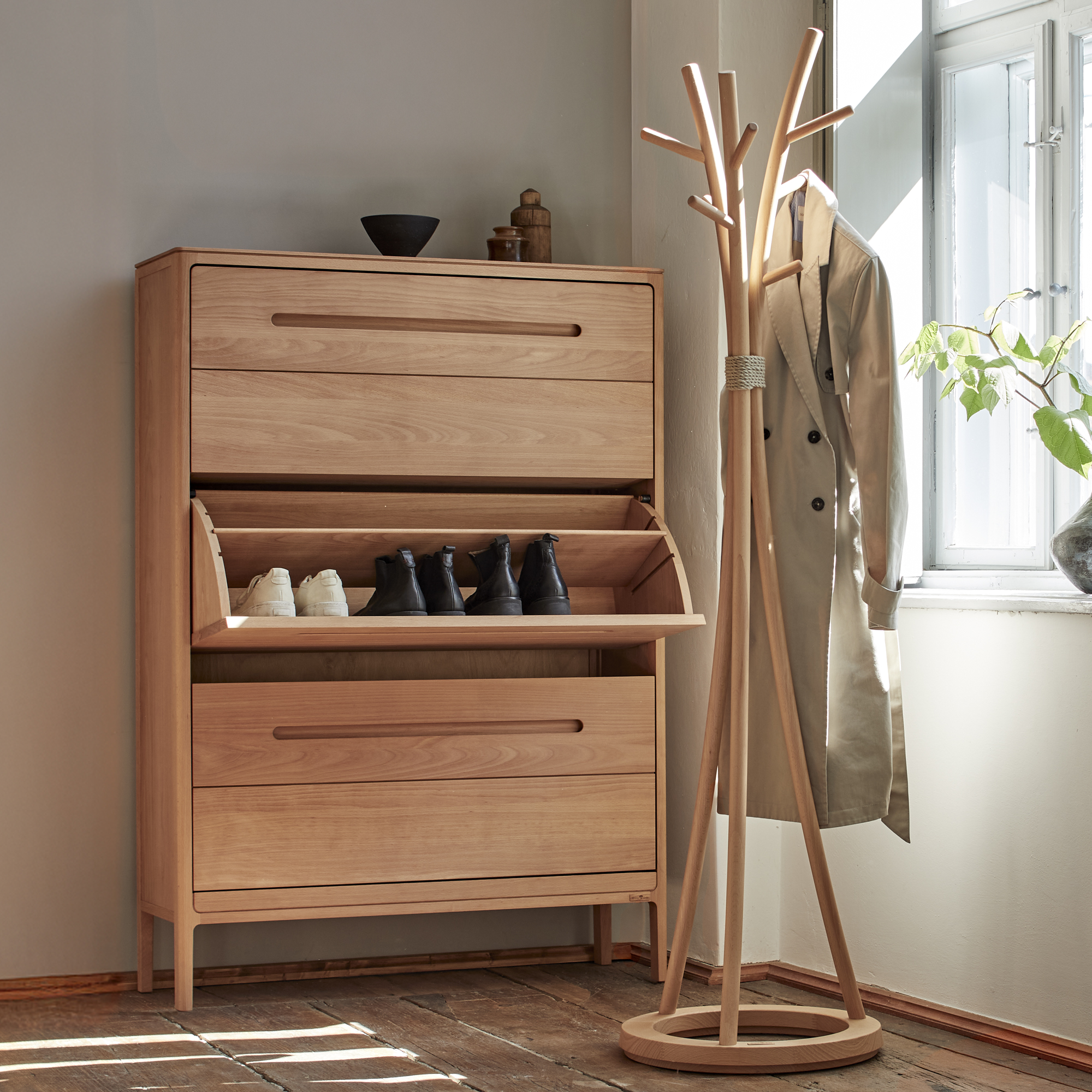 Die Schuhschränke tragen alle Gestaltungsmerkmale der Tenso-Serie: zarte, elegante, finessenreiche Anmutung; auf ein funktionelles Minimum reduzierte Holzdimensionen; schlichte, klare Linienführung; feine Schattenfugen gliedern die Front; gerundete Ecken, Kanten und Übergänge; sauber gefräste, optisch und haptisch „weiche“ Griffrillen an den Klappfächern.