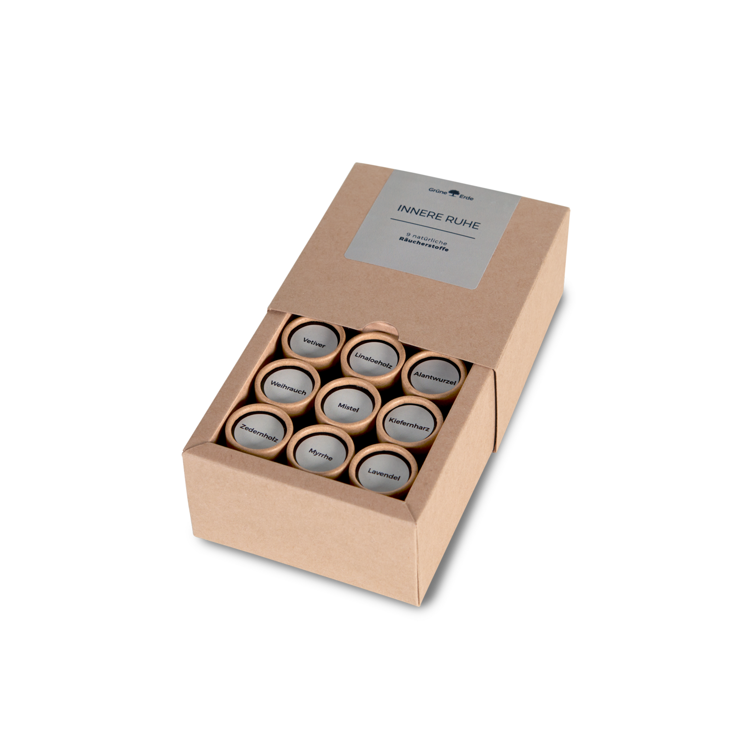 Die Box Innere Ruhe beinhaltet Weihrauch, Kiefernharz, Linaloeholz, Alant, Mistel, Vetiver, Lavendel, Zedernholz und Myrrhe.
