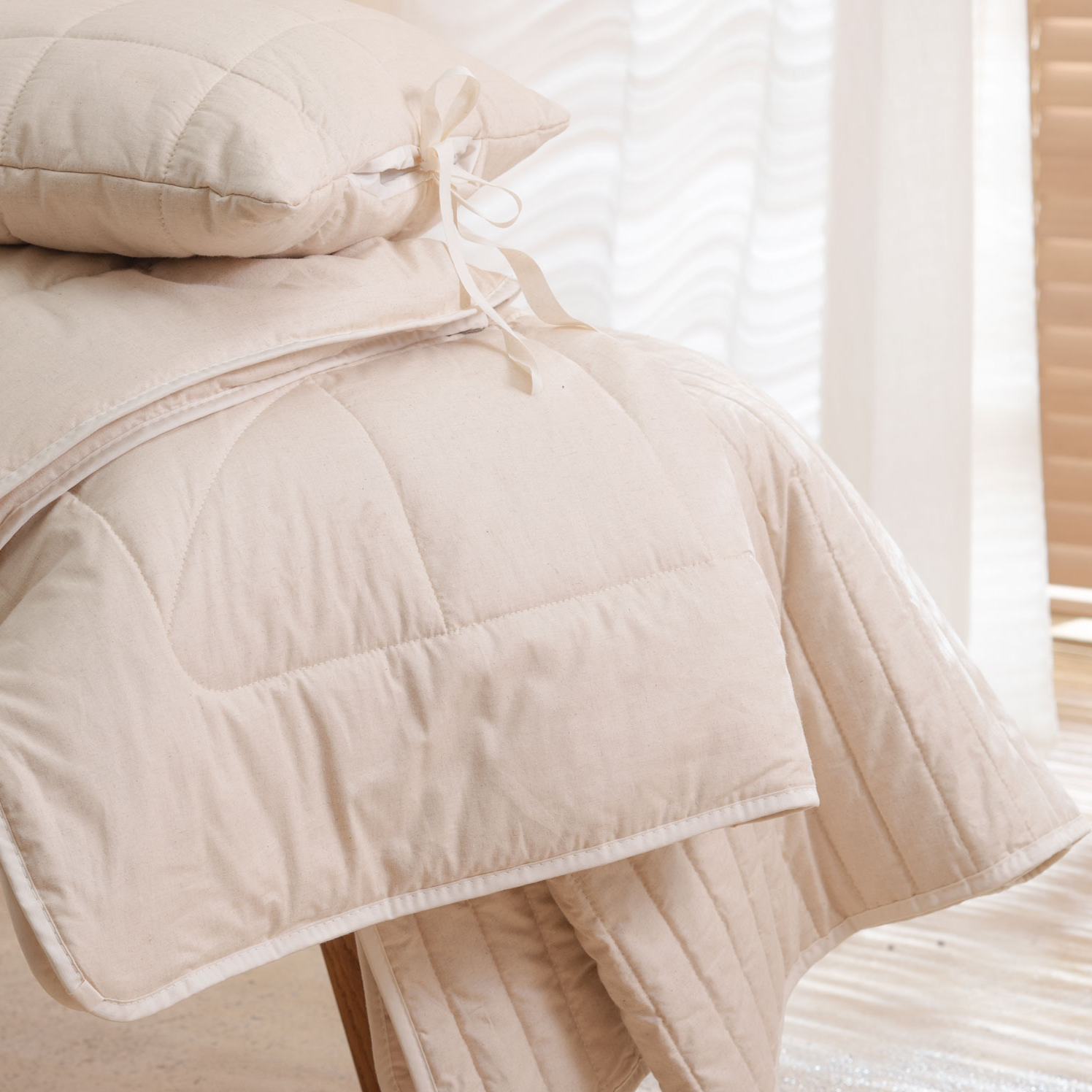 Der hochwertige Bezug ist aus naturbelassenem, ungefärbtem, ungebleichtem Baumwoll-Leinengewebe in elegantem Beige-Ton genäht. Aufgrund seiner "griffigen" Oberfläche wirkt das Gewebe kühlend. Die Füllung ist ein leichtes – nur 100 g/m2 – Vlies aus wertvollem Leinen, mit einem Baumwoll-Anteil von 30 %.