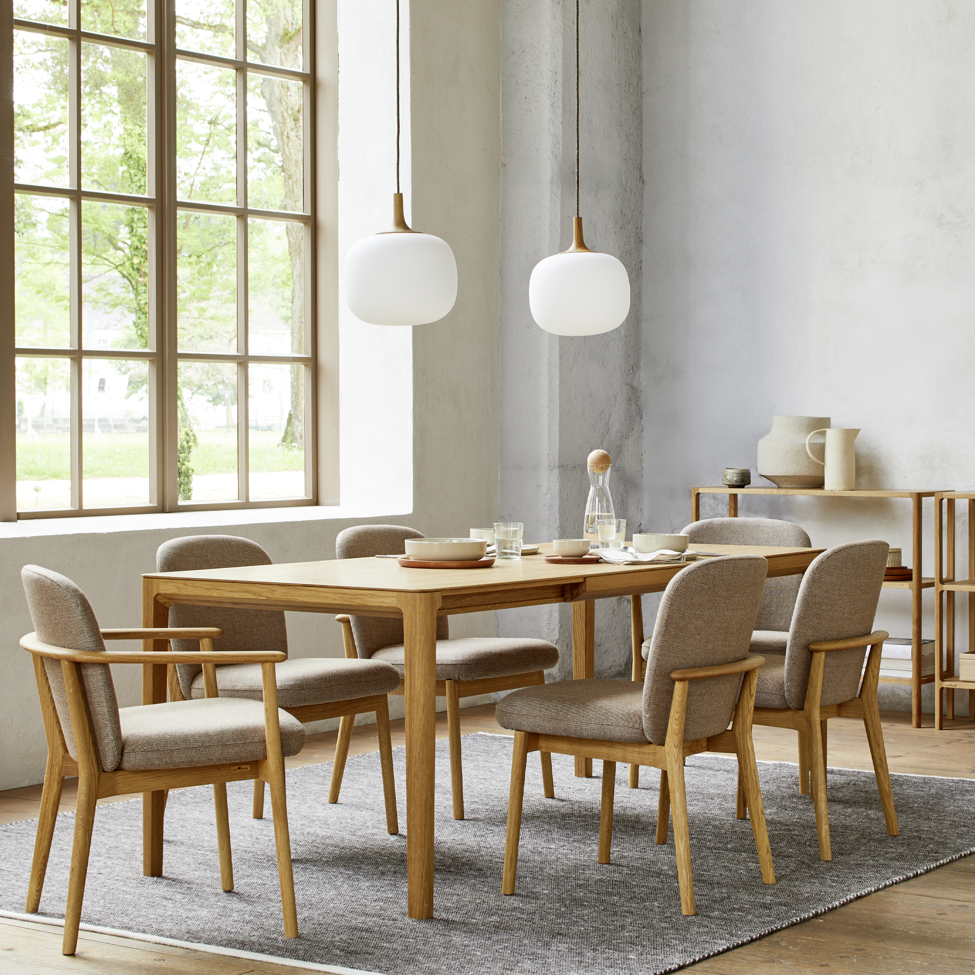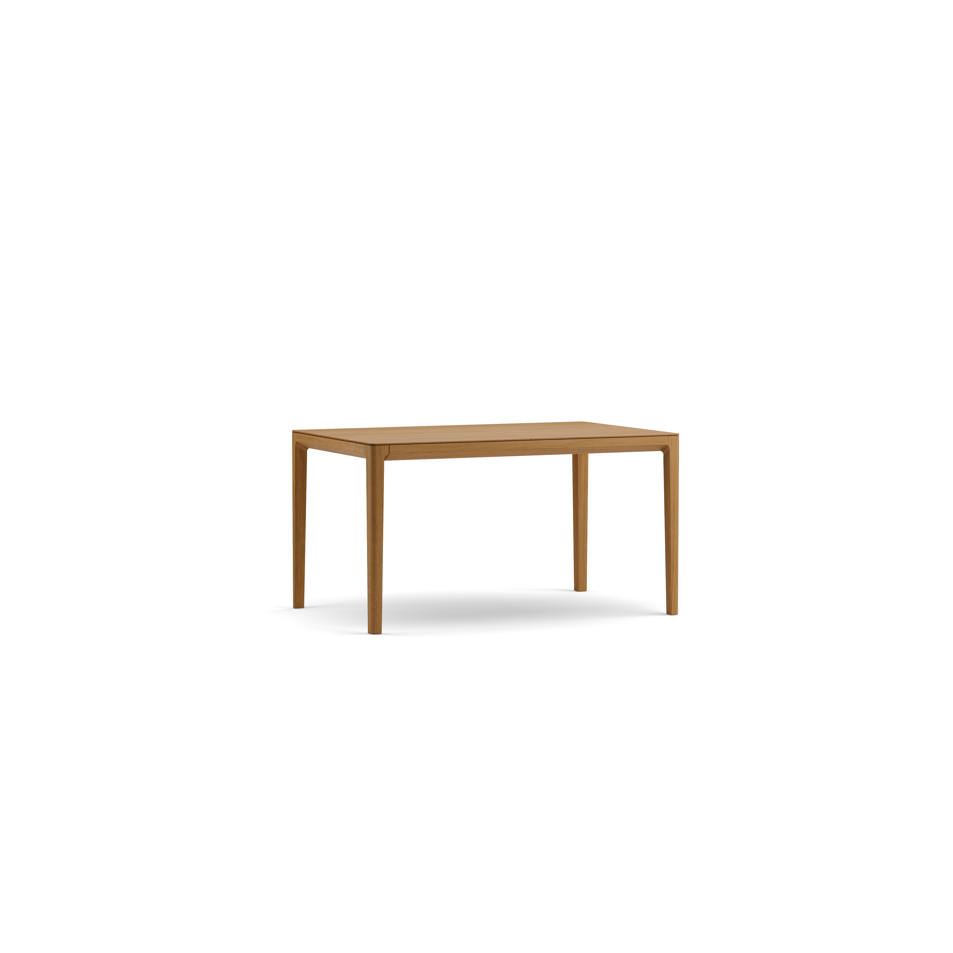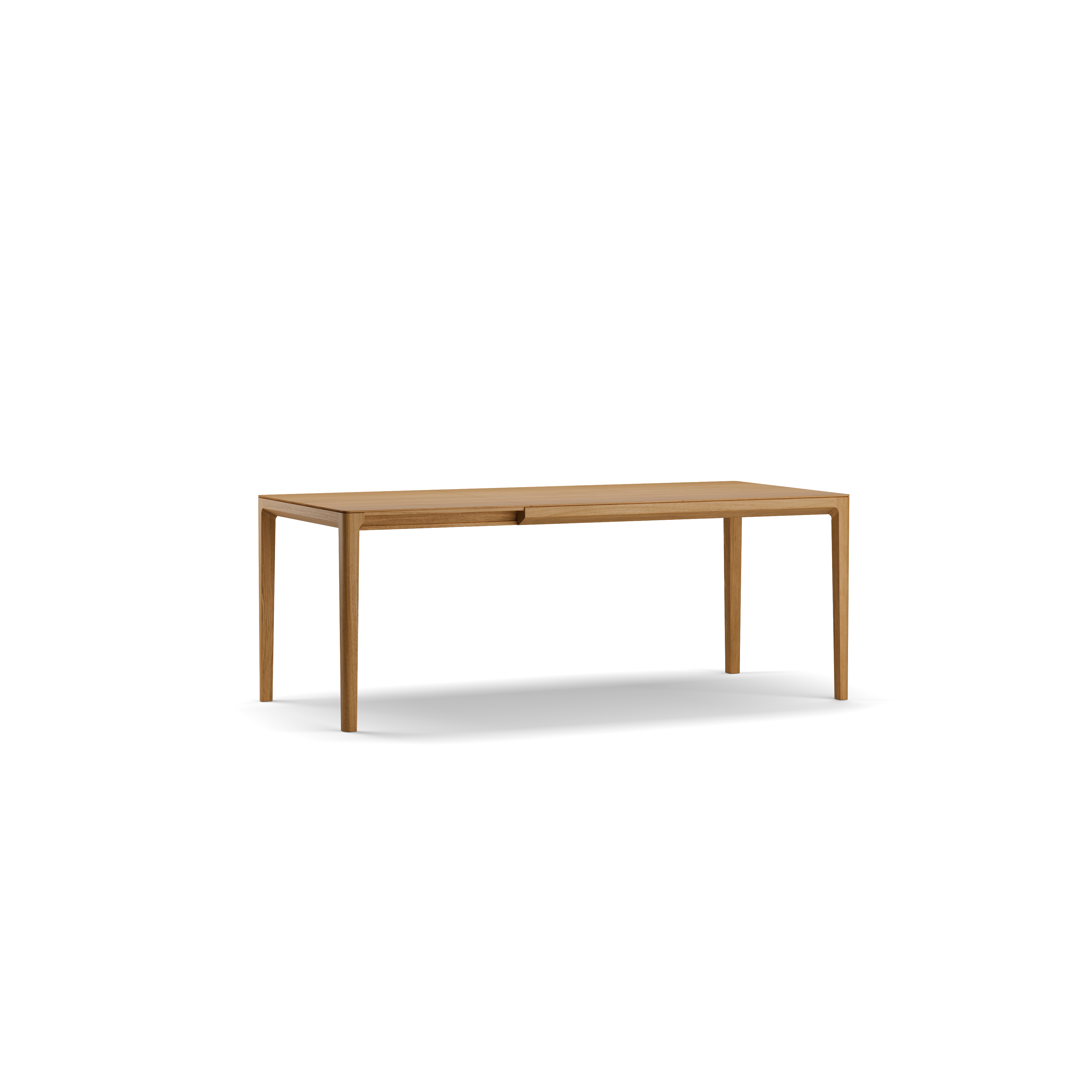 Eleganz und Leichtigkeit des bestehenden Fixtisches Tenso blieben erhalten. Ebenso die außen gerundeten, innen kantigen, schlanken Tischbeine. Sie sind an den Ecken positioniert, was Tenso Tiefe und Weite verleiht. An ihrem oberen Ende gehen die Beine mit einem Schwung in die abgeschrägte Zarge über. Darauf sitzt, durch eine reizvolle Schattenfuge abgesetzt und scheinbar schwebend, die optisch zarte Tischplatte.