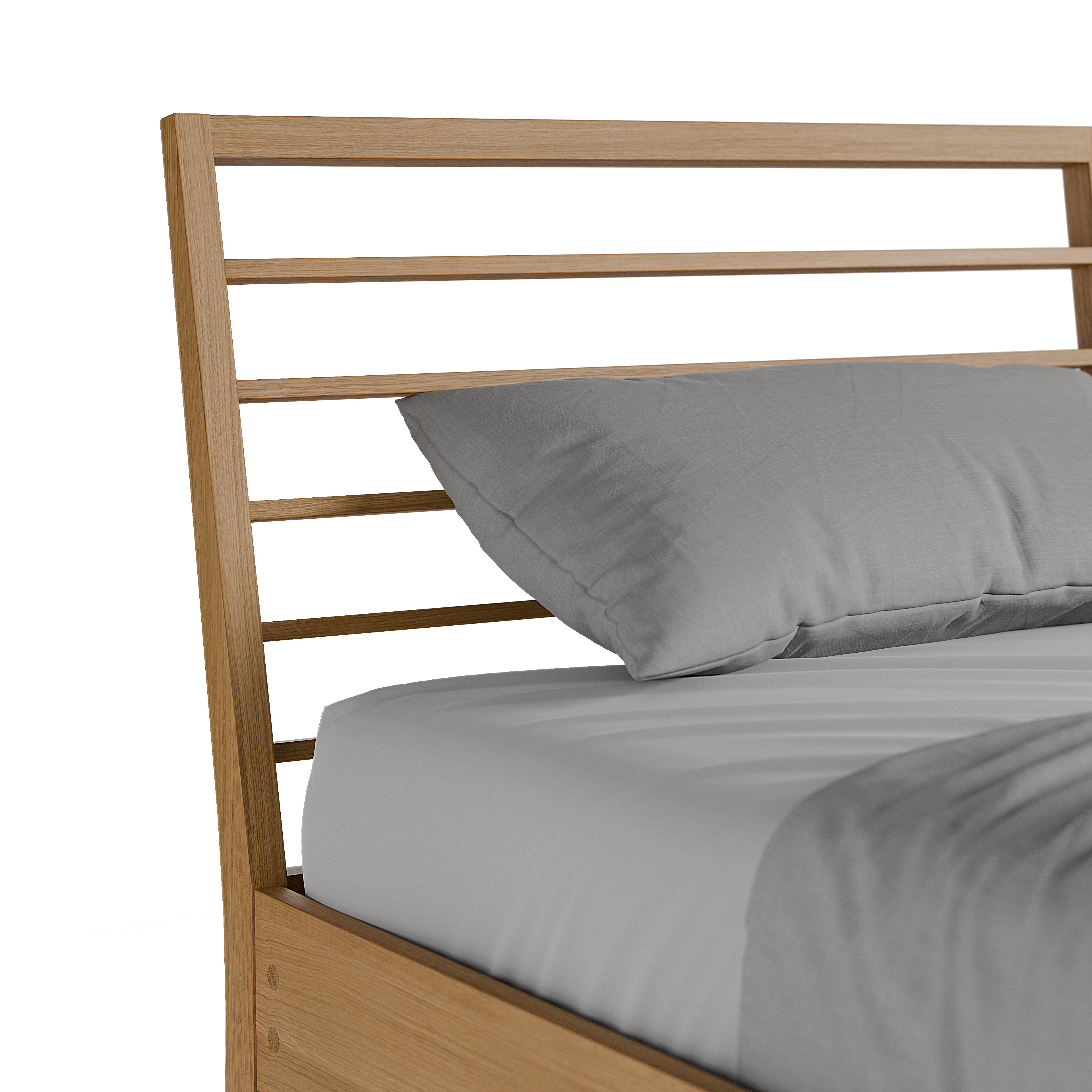 Almeno ist das beliebteste Bett von Grüne Erde. Auch, weil es unser vielfältigstes ist. Sie können es in mehreren Holzarten und Modellvarianten wählen, wie hier mit einem horizontalen Sprossenbetthaupt: optisch leicht, elegant und feingliedrig.