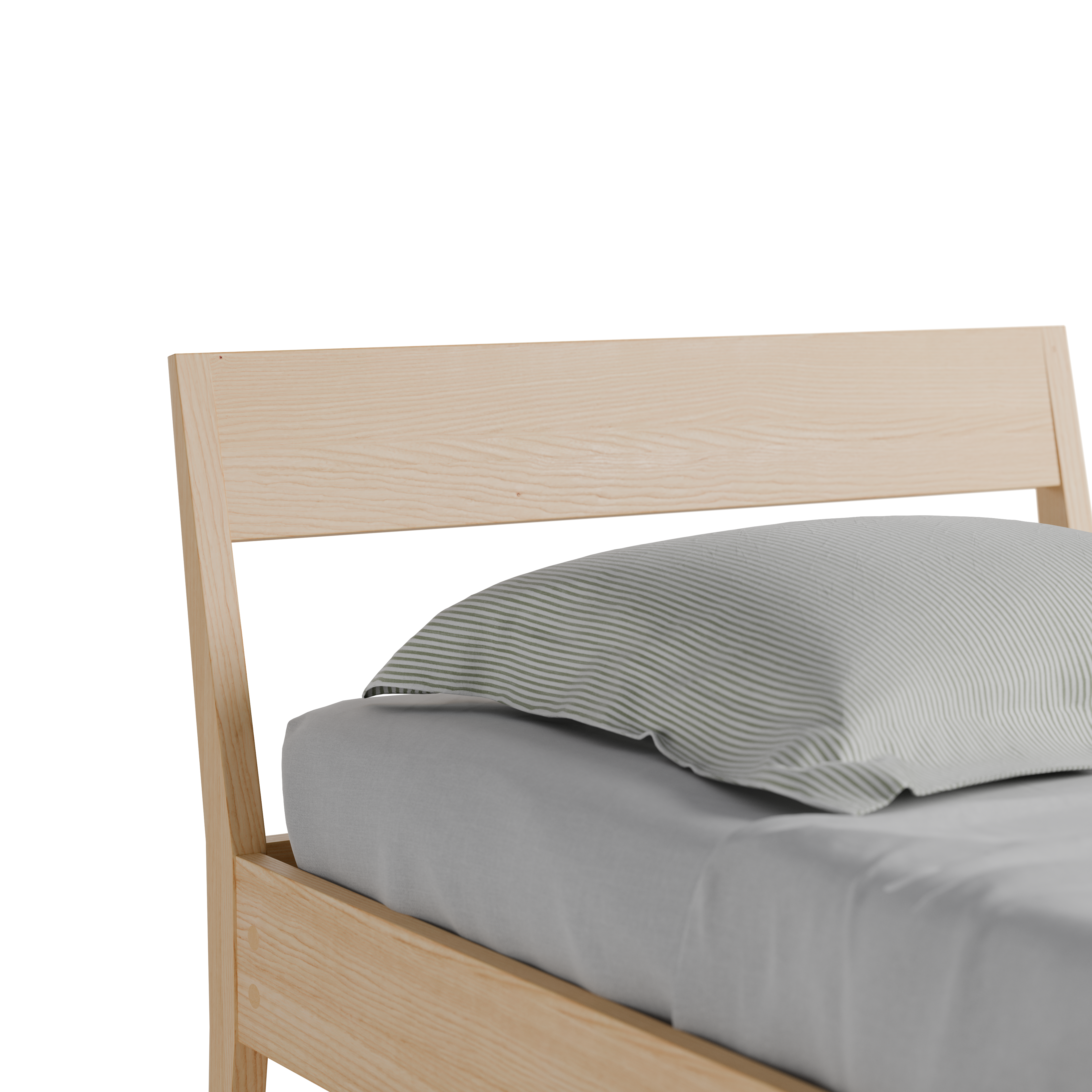Almeno ist das beliebteste Bett von Grüne Erde. Auch, weil es unser vielfältigstes ist. Sie können es in mehreren Holzarten und Varianten wählen: ganz "basic" ohne Betthaupt, als Polsterbett, mit Sprossenbetthaupt oder – wie hier – mit einem Steg-Betthaupt.