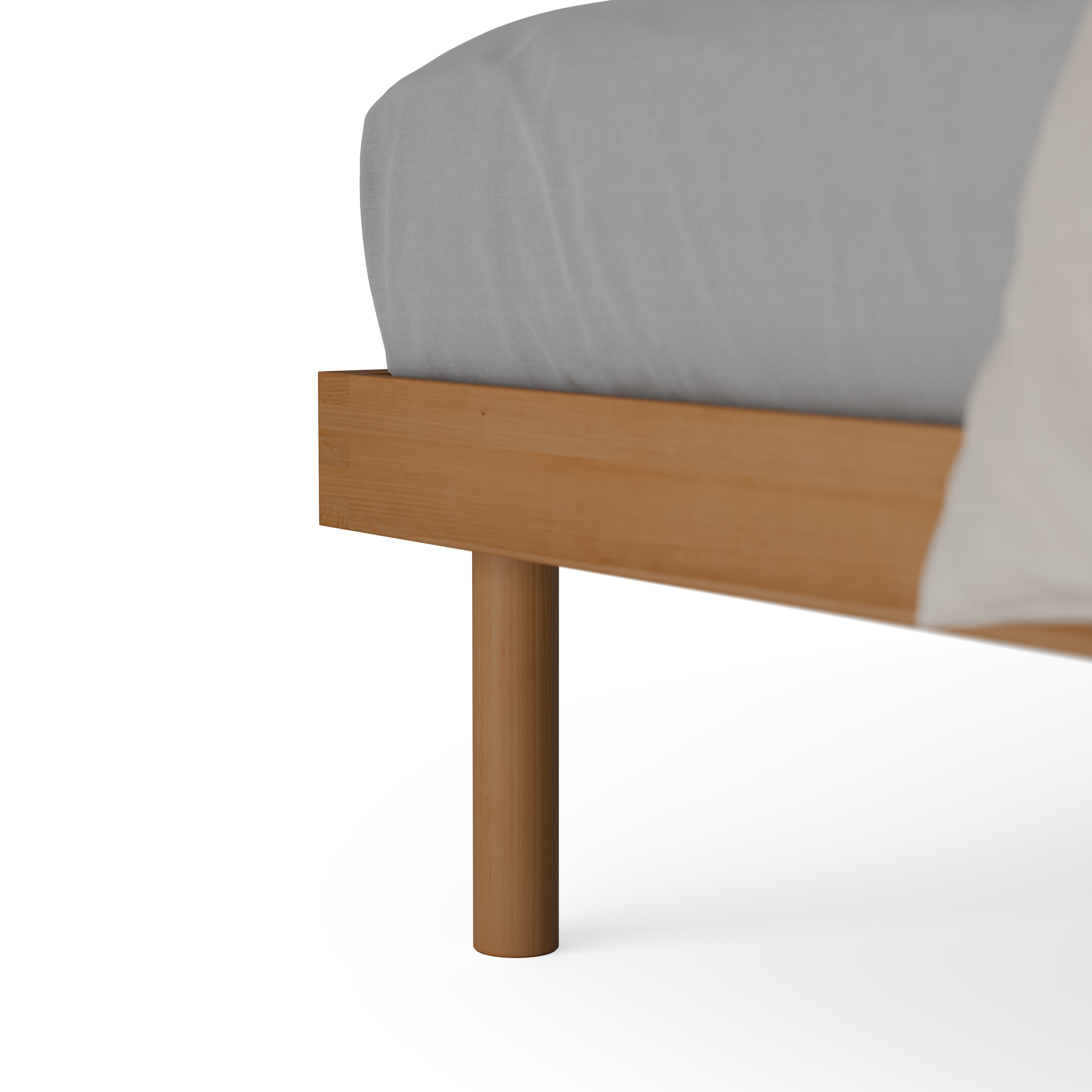 Der 8 cm hohe Bettrahmen und die zylindrischen, 22 cm hohen Füße werden von genial einfachen, bei Bedarf wieder lösbaren Zapfen & Keil-Steckverbindungen fest zusammengehalten. Das Bett kann ohne Qualitäts- und Funktionsverlust sowie ohne Werkzeug wiederholt zusammengebaut und zerlegt werden, etwa bei einem Wohnungswechsel.
