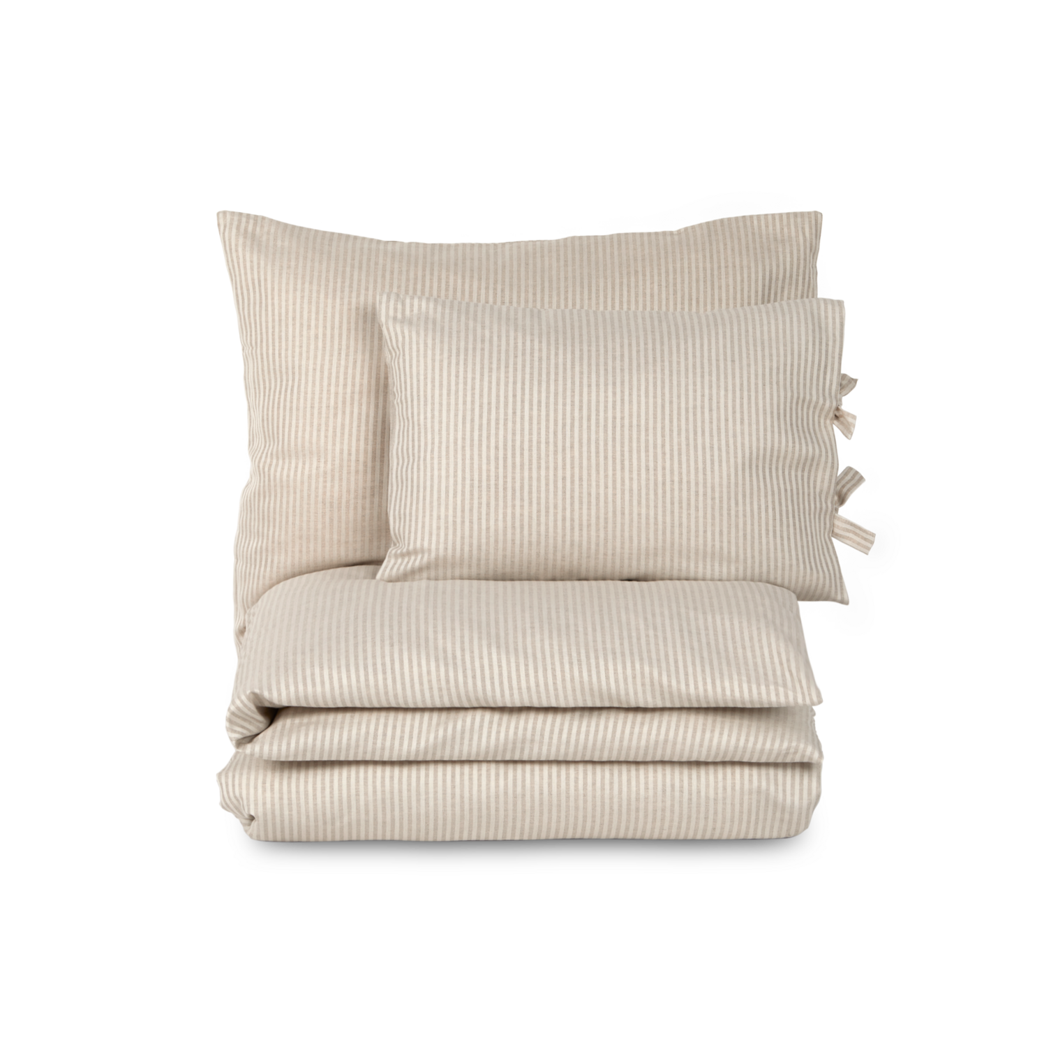 Die zwei Naturmaterialien – Leinen kbA (dunkle Streifen) und Baumwolle kbA (helle Streifen) – werden in aufwendiger Jacquard-Bindung verwebt und sind streng ökologisch gefärbt bzw. bei der Bettwäsche in Natur gänzlich ungefärbt. Verschluss mit breiten Bändern, die zu schönen schmetterlingsförmigen Knoten gebunden werden können.