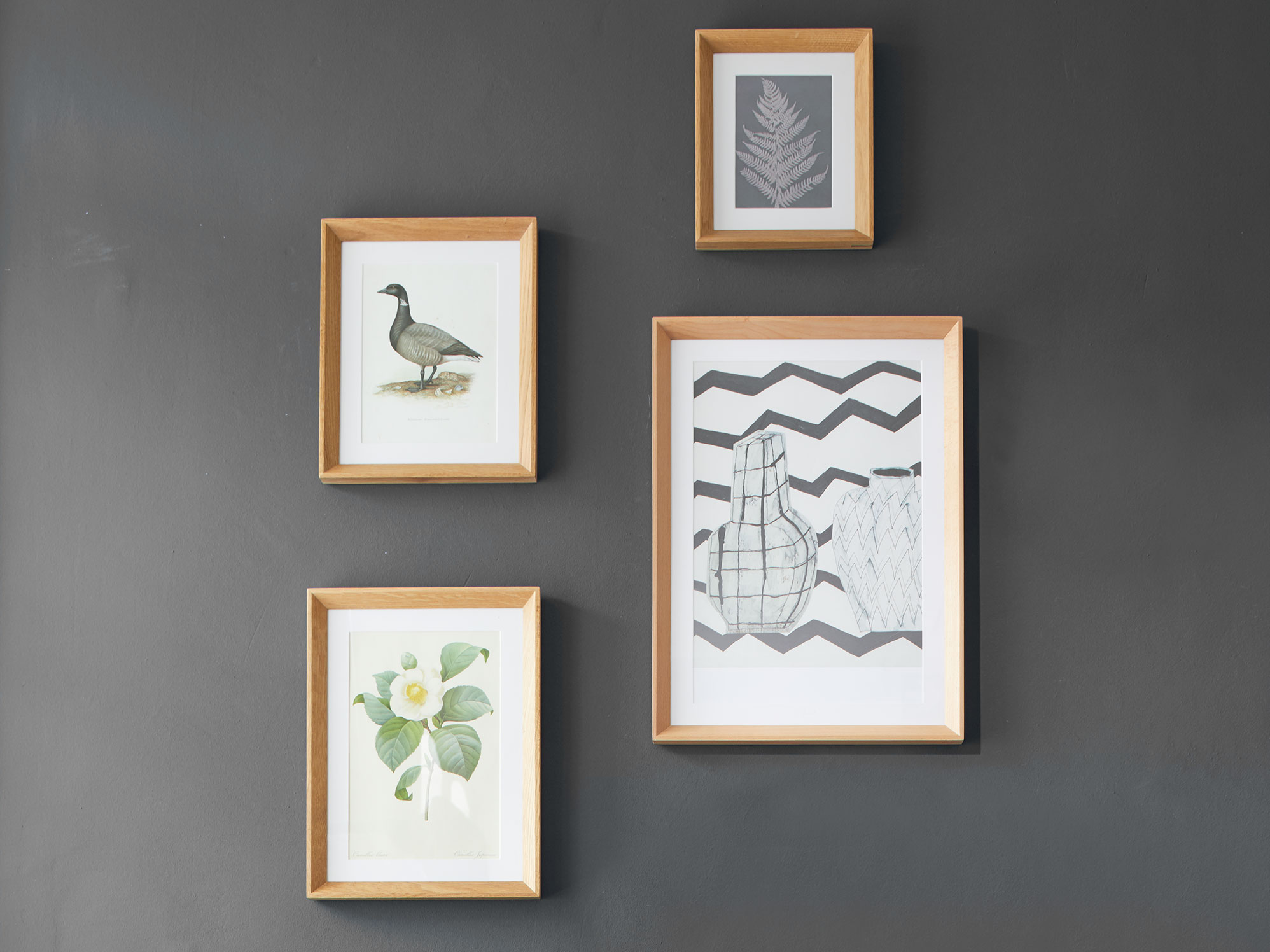 In Buche oder Eiche, Vollholz, Eckverbindungen fachmännisch auf Gehrung gestoßen, metallfrei, sorgfältig verleimt, naturgeölt, Rückwand 1,5 mm Starkkarton, Passepartout aus weißem Karton, in 5 Größen, mit Glas. Vista kann hoch oder quer aufgehängt werden. Kleinmaterial zur Montage liefern wir mit.