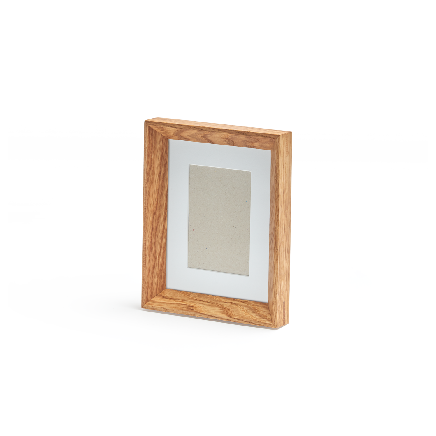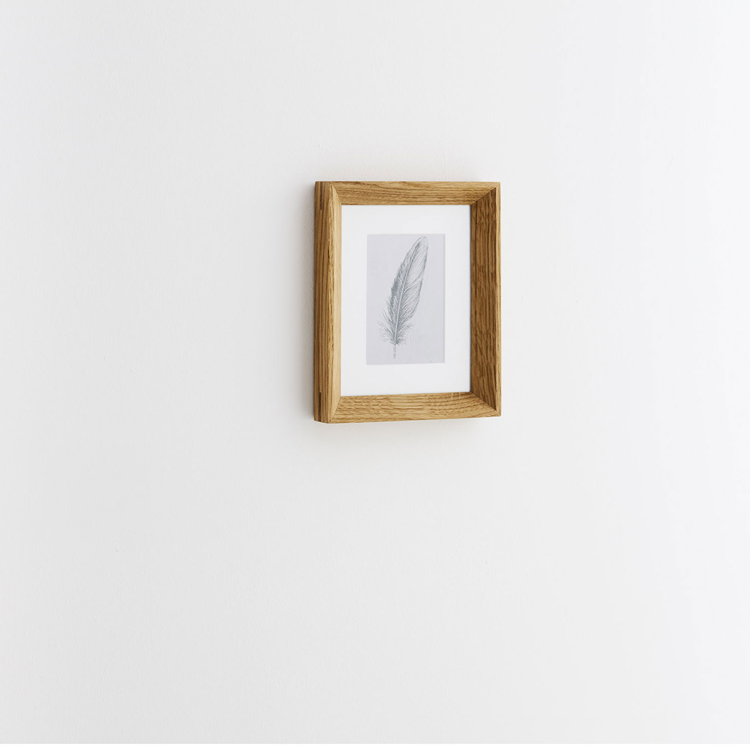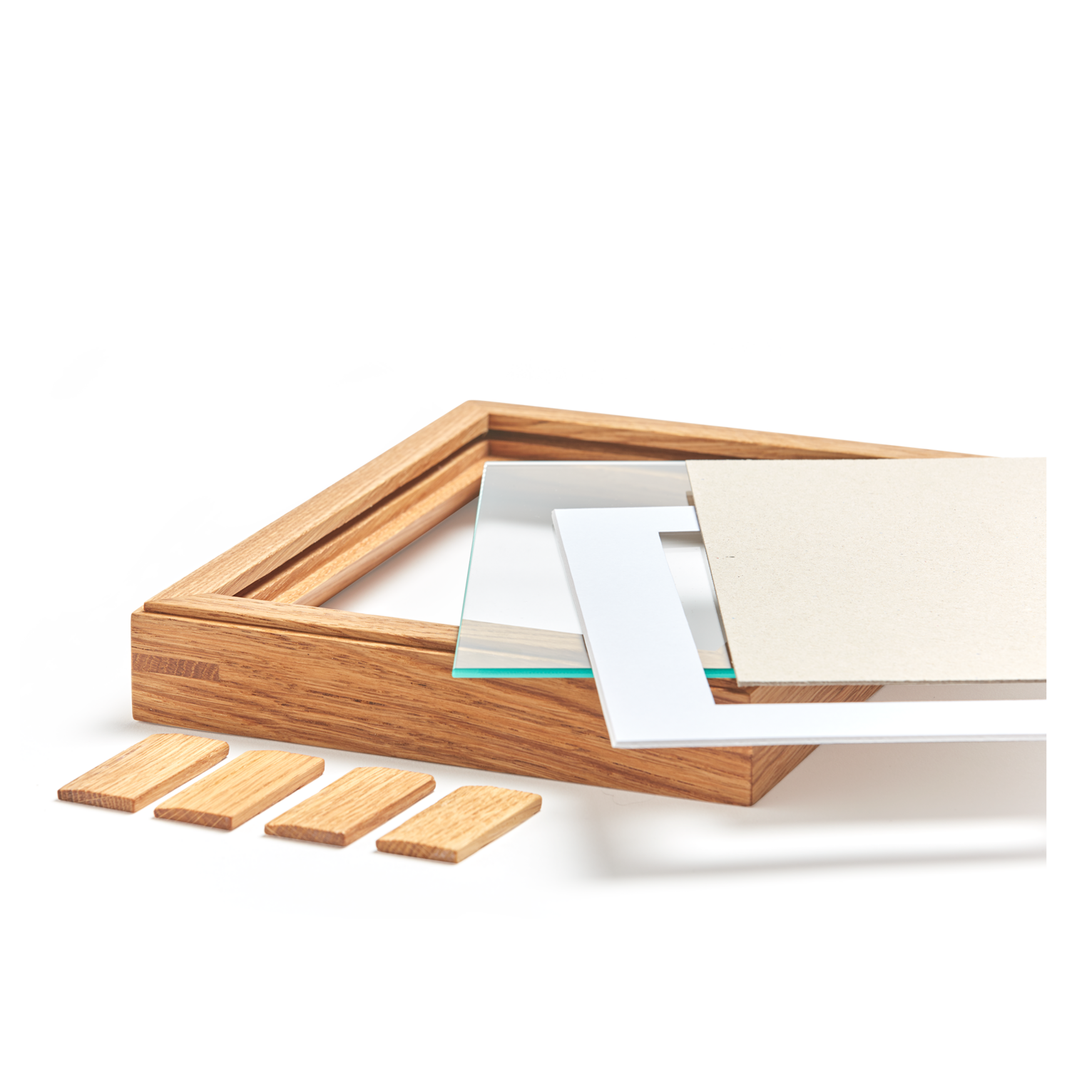In Buche oder Eiche, Vollholz, Eckverbindungen fachmännisch auf Gehrung gestoßen, metallfrei, sorgfältig verleimt, naturgeölt, Rückwand 1,5 mm Starkkarton, Passepartout aus weißem Karton, in 5 Größen, mit Glas. Vista kann hoch oder quer aufgehängt werden. Kleinmaterial zur Montage liefern wir mit.