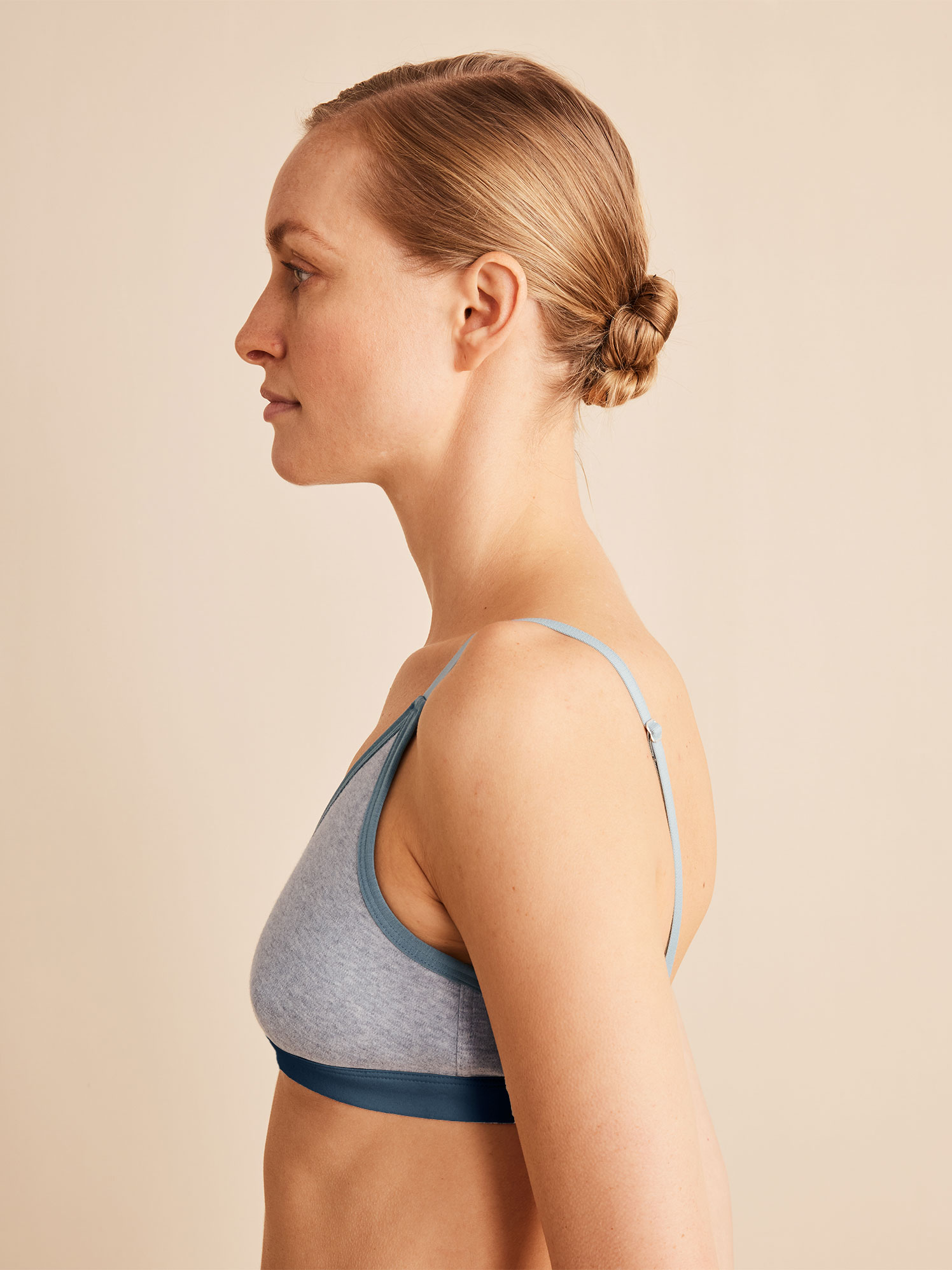 Das Modell in den harmonisch abgestimmten Blau- und Petroltönen ist kaum spürbar und besonders sanft zur Haut. Es schmiegt sich an und drückt nicht. Die Bralette in stabiler Baumwoll-Qualität überzeugt zur Gänze ohne Elasthan. Die verstellbaren Träger sorgen für einen guten Halt, der metallfreie Verschluss für ein angenehmes Tragegefühl. Für das gewisse Etwas sorgt der in Kontrast gesetzte, weiche Gummibund.