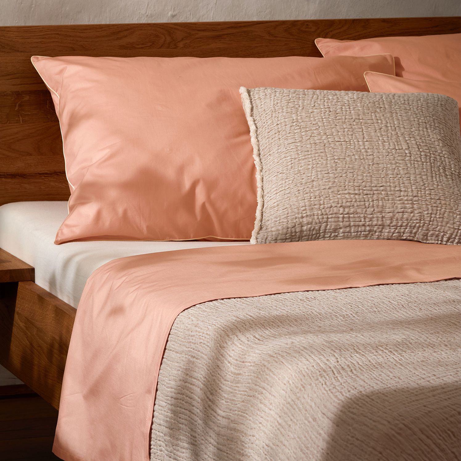 Die Bettwäsche Edna begeistert mit ihrer besonderen Leichtigkeit und edler Haptik aus hochwertigem Perkal. Die feine, dicht gewebte Baumwoll-Qualität zeichnet sich durch ihre glatte Oberfläche und ihre besonders atmungsaktive Struktur aus – ideal für erholsame Nächte und ein angenehmes Schlafklima. Der Deckenbezug überzeugt mit schlichter Eleganz ohne Paspelierung, während die Kissenbezüge mit zarten Paspeln in Kontrast die klassische Formensprache stilvoll abrunden. Das durchdachte Konzept ermöglicht es, Decken- und Kissenbezüge nach Belieben zu kombinieren und dabei stets ein harmonisches und stilvoll elegantes Gesamtbild zu schaffen.