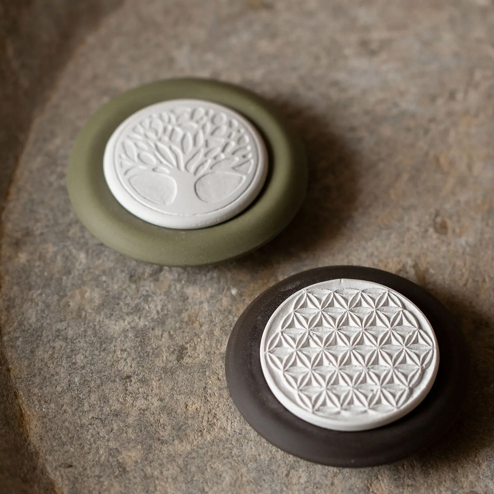 Diese Duftsteine sind eine praktische und optisch attraktive Möglichkeit, Räume in angenehme Düfte zu hüllen oder in einzelnen Wohnbereichen eine angenehme Atmosphäre zu schaffen. Bestehend aus zwei Teilen: einem saugfähigen Oberteil aus hochwertigem Gips und einem dicht gebrannten Unterteil aus edlem Basaltton (wasser- und öldicht, sowie spülmaschinengeeignet). Auf das Oberteil geträufelte ätherische Öle saugen sich in den offenporigen Gips und verbreiten dann über Verdunstung ihren Duft im Raum.