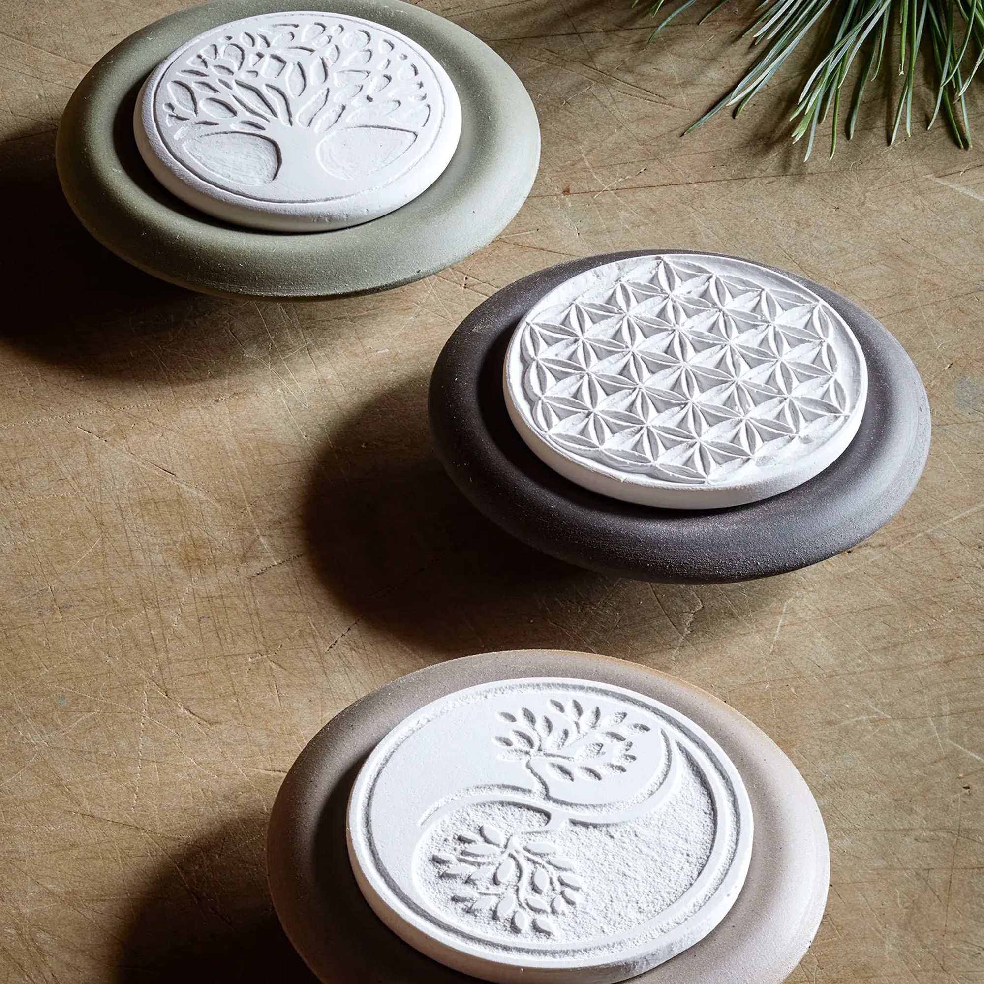 Diese Duftsteine sind eine praktische und optisch attraktive Möglichkeit, Räume in angenehme Düfte zu hüllen oder in einzelnen Wohnbereichen eine angenehme Atmosphäre zu schaffen. Bestehend aus zwei Teilen: einem saugfähigen Oberteil aus hochwertigem Gips und einem dicht gebrannten Unterteil aus edlem Basaltton (wasser- und öldicht, sowie spülmaschinengeeignet). Auf das Oberteil geträufelte ätherische Öle saugen sich in den offenporigen Gips und verbreiten dann über Verdunstung ihren Duft im Raum.