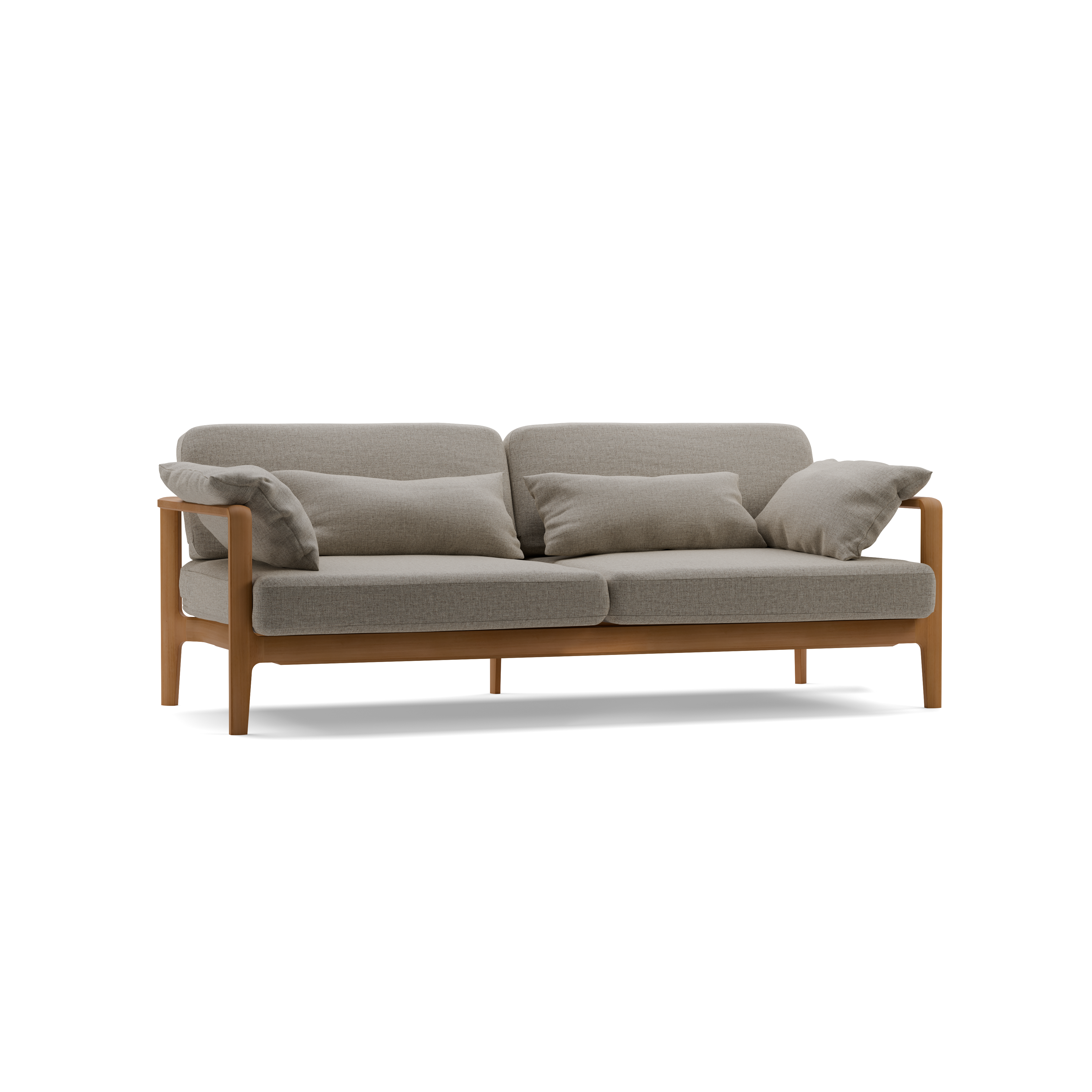 Der elegante, schlanke, feinsinnige Sofarahmen aus fix verleimtem Massivholz – mit sanften, verrundeten, fließenden Übergängen und Verbindungen – umfängt die Polsterelemente relingartig und gibt dem Sofa auch eine reizvolle Rückenansicht.