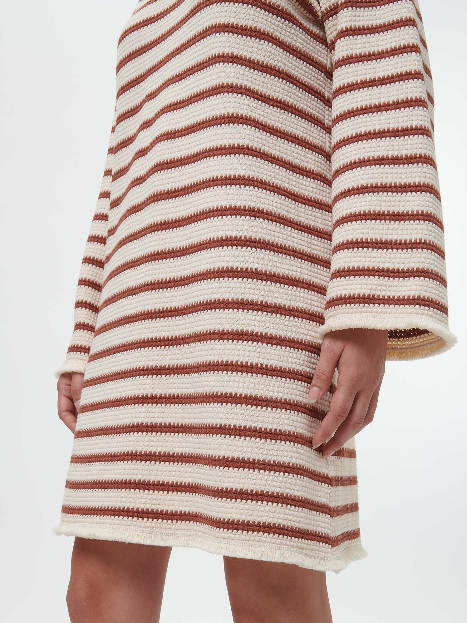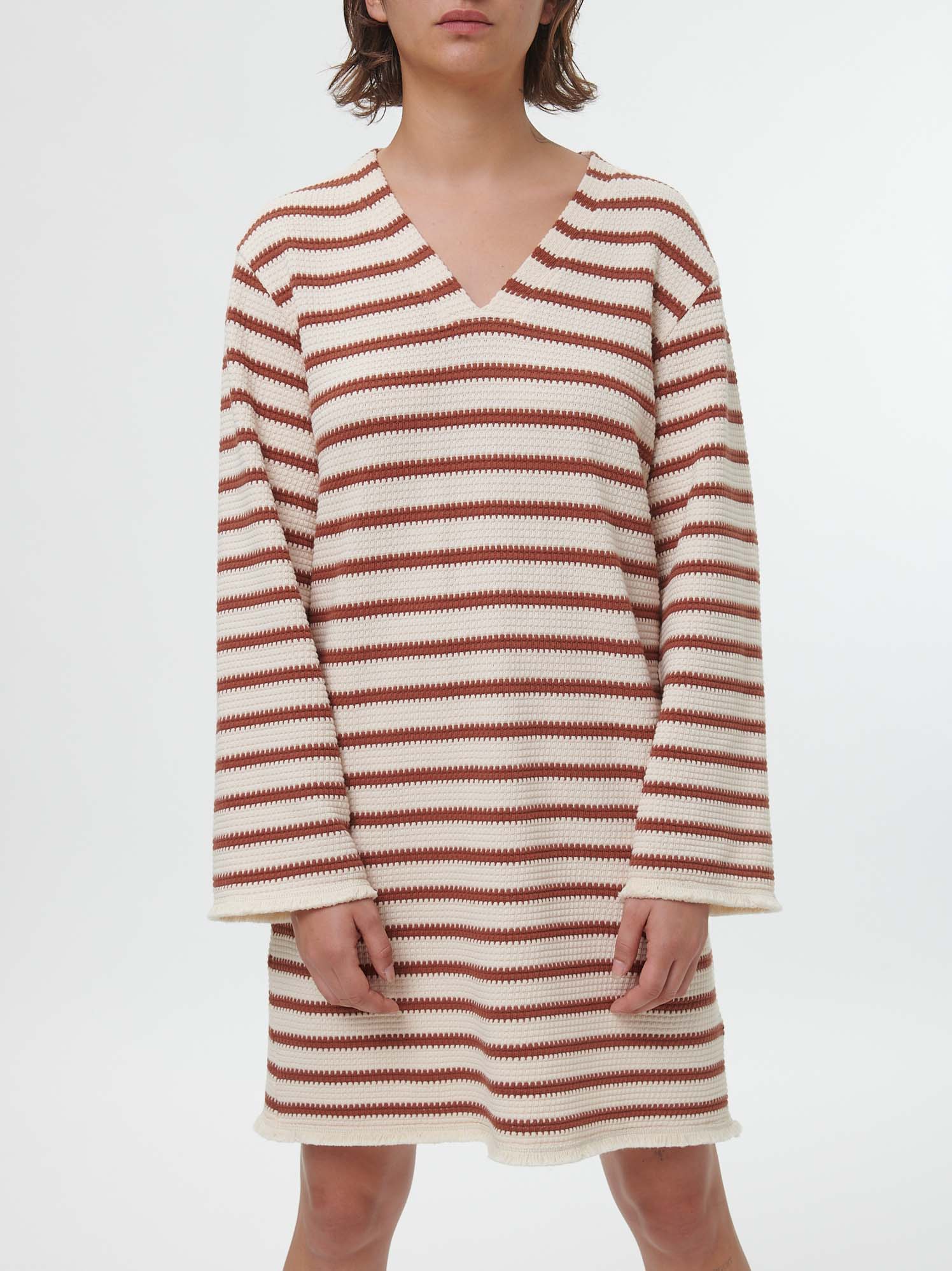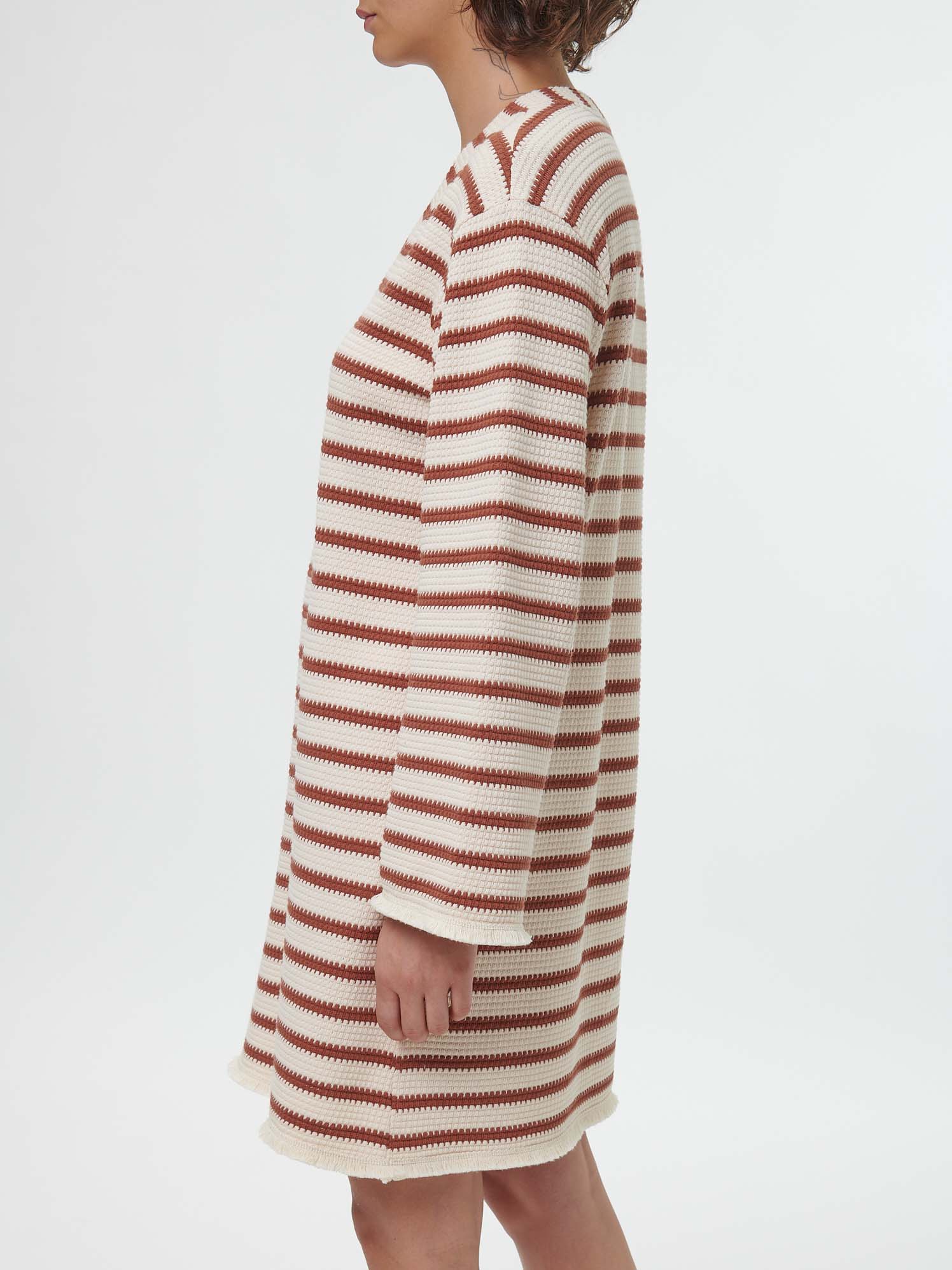Tunika-Kleid in hochwertiger Jersey-Jacquard-Qualität: Neben dem weichen Griff besticht das Modell mit einem modernem Blockstreifen-Dessin, während zarte Fransen am Saum einen charmanten Akzent setzen. Die lockere Schnittführung in leichter A-Linie wird mit einer femininen V-Ausschnittblende und einer ausgestellten Ärmellänge abgerundet. Weitere Details: hochwertige Logo-Patch im Innenteil.