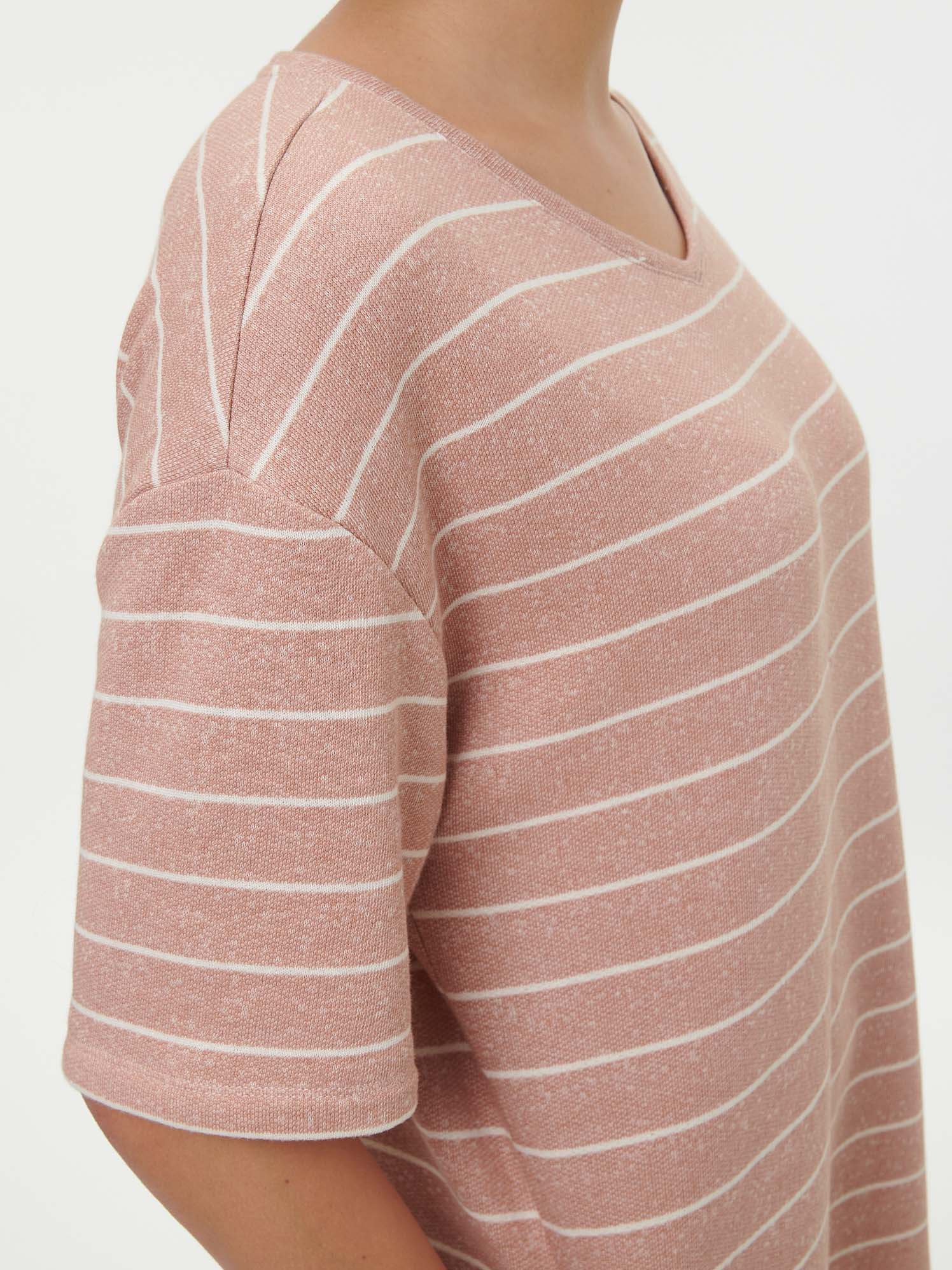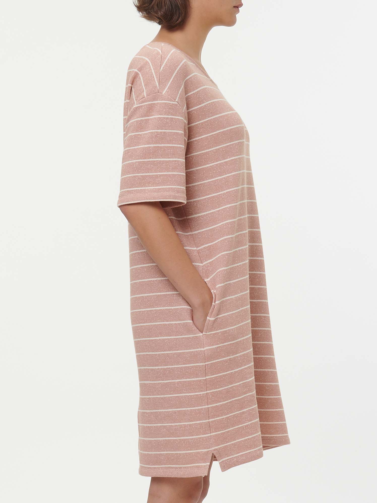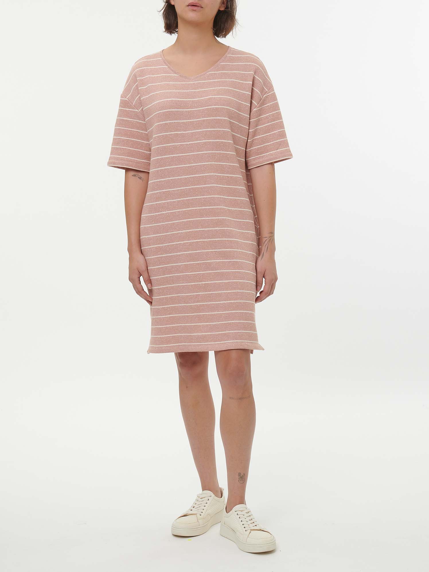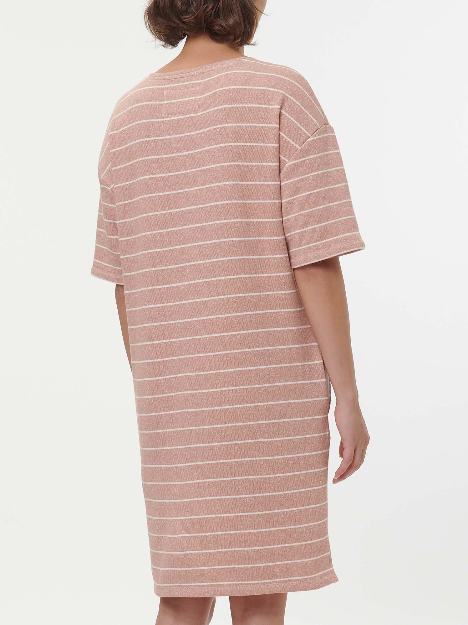 Lässig geschnittenes Sweatshirt-Kleid mit Ringel-Dessinierung in dezenter Melange-Optik. Der V-Ausschnitt und die kurzen Ärmel unterstreichen den entspannten Boxy-Schnitt, während die weiche French-Terry-Qualität für angenehmen Tragekomfort sorgt. Weitere Details: praktische Aufhängung im Innenteil und kleine Seitenschlitze am Saum.