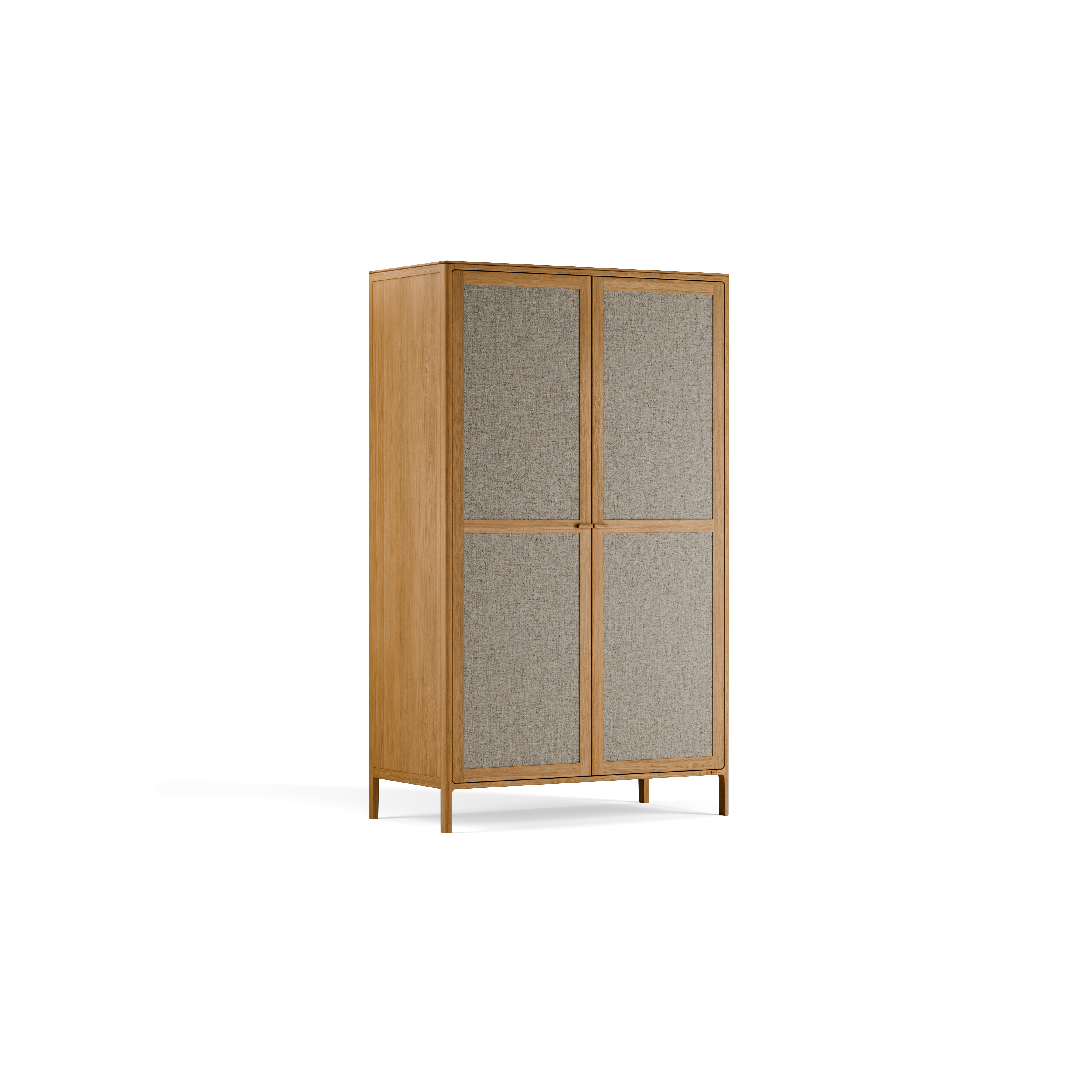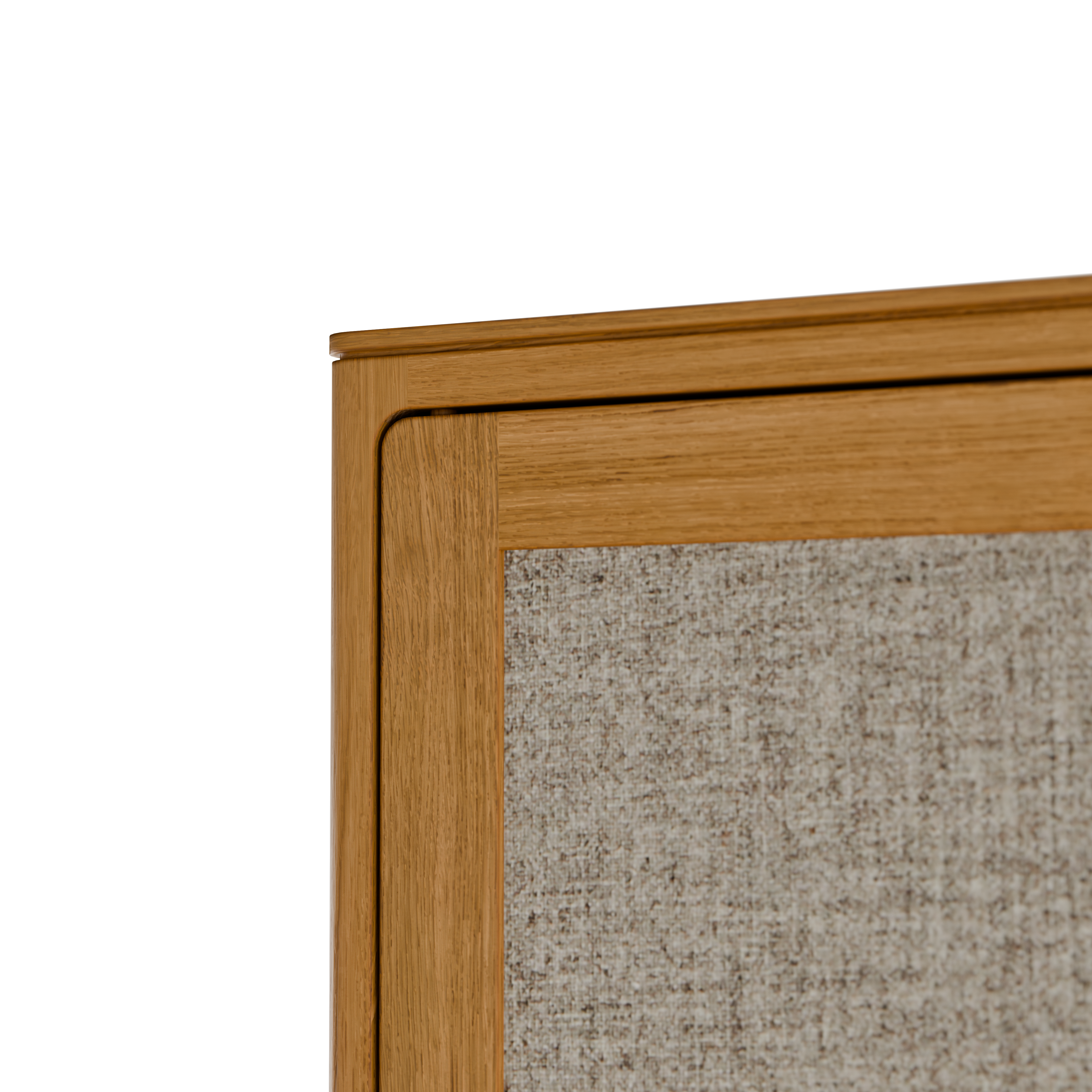 Rahmen und Füße: Massivholz; Holzfüllungen der Türen, sowie Seiten- und Rückwände: verwindungsfestes Schichtholz (Pappel), Deckfurnier in der Holzart des Rahmens; Stofffüllungen: 100 % Schurwolle (Schaf), IVN NATURTEXTIL BEST-zertifiziert.