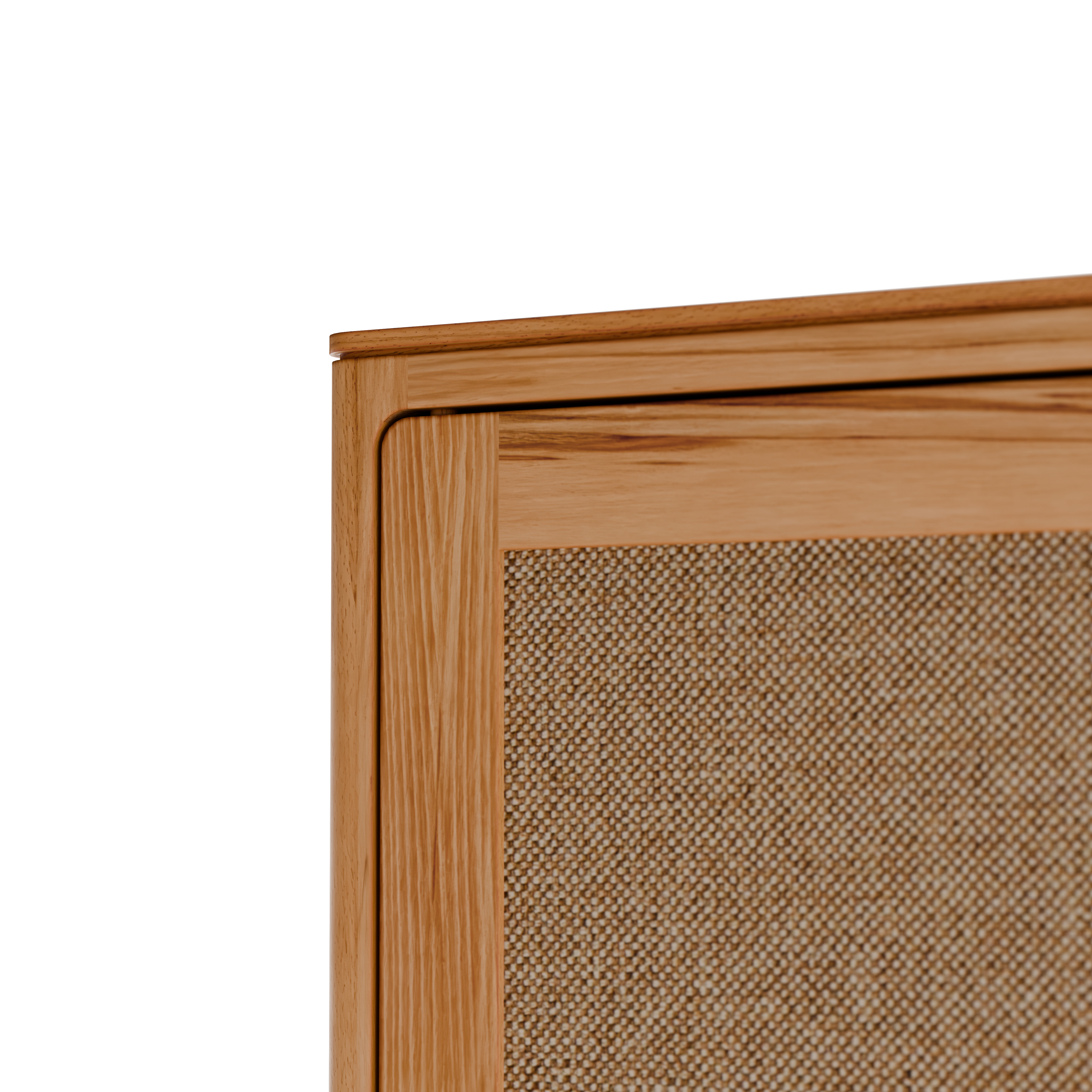 Rahmen und Füße: Massivholz; Holzfüllungen der Türen, sowie Seiten- und Rückwände: verwindungsfestes Schichtholz (Pappel), Deckfurnier in der Holzart des Rahmens; Stofffüllungen: 100 % Schurwolle (Schaf), IVN NATURTEXTIL BEST-zertifiziert.