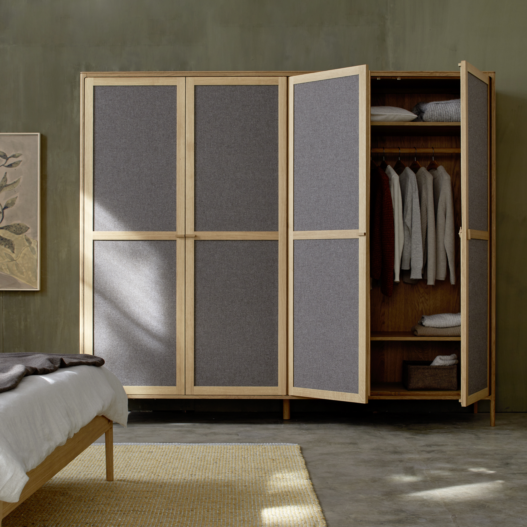Rahmen und Füße: Massivholz; Holzfüllungen der Türen, sowie Seiten- und Rückwände: verwindungsfestes Schichtholz (Pappel), Deckfurnier in der Holzart des Rahmens; Stofffüllungen: 100 % Schurwolle (Schaf), IVN NATURTEXTIL BEST-zertifiziert.