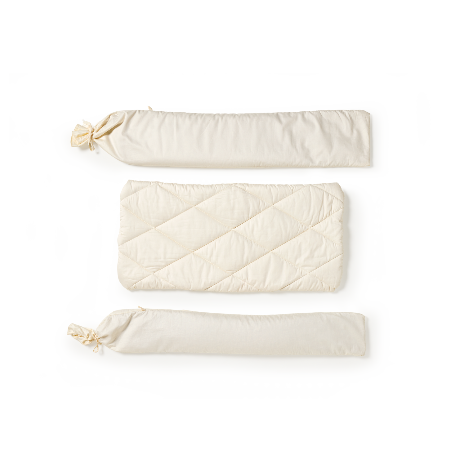 In der mit Baumwoll-Vlies rautenförmig versteppten Kissenhülle aus Baumwoll-Inlett stecken zwei Beutel – gefüllt mit Dinkelspelzen bzw. Hirseschalen. Damit bietet das Kissen zwei verschiedene Liegezonen: eine für den Nacken, eine für den Kopf. Beide Materialien sind rieselfreudig und kleinteilig, passen sich daher sehr gut an.
