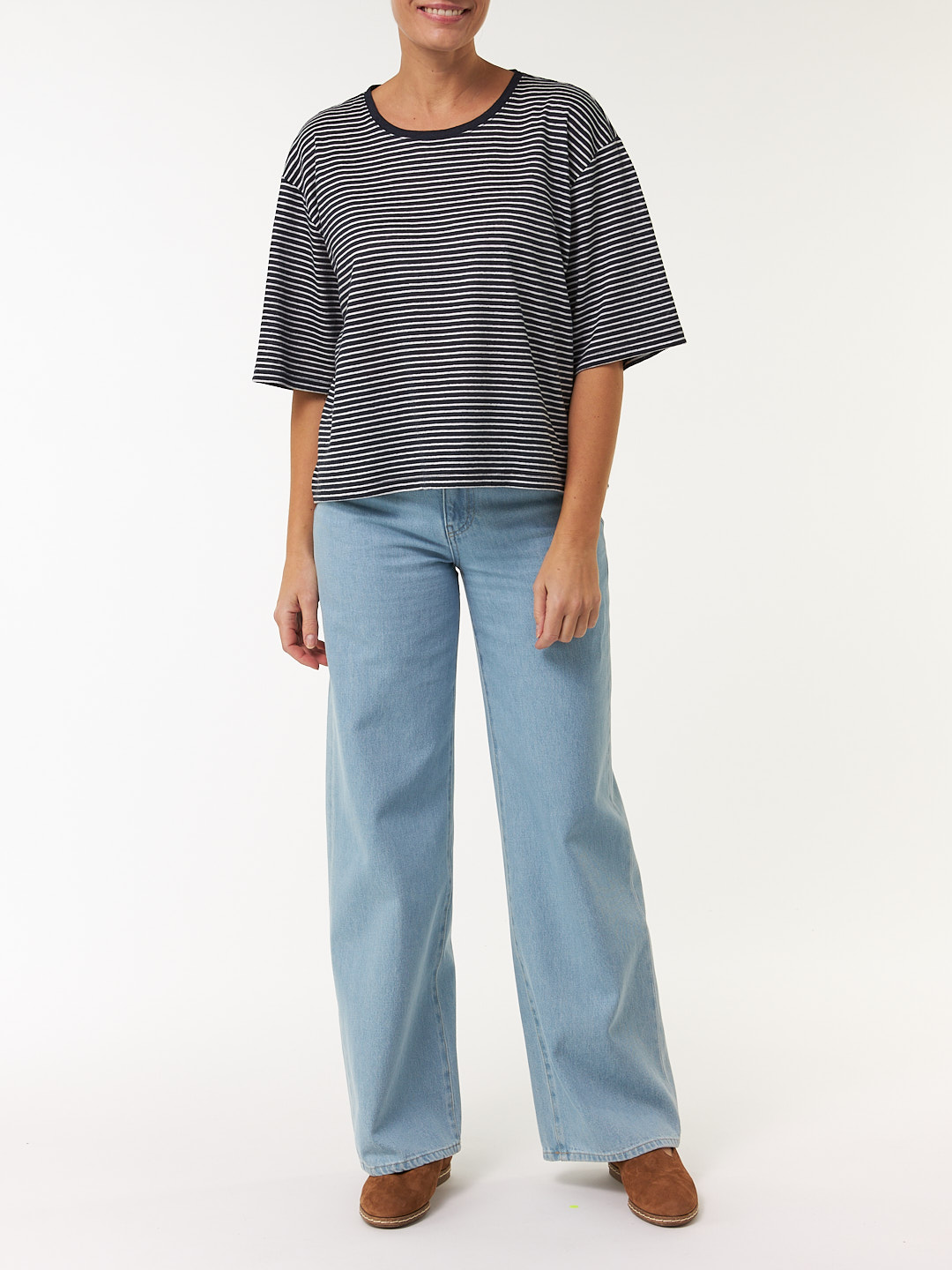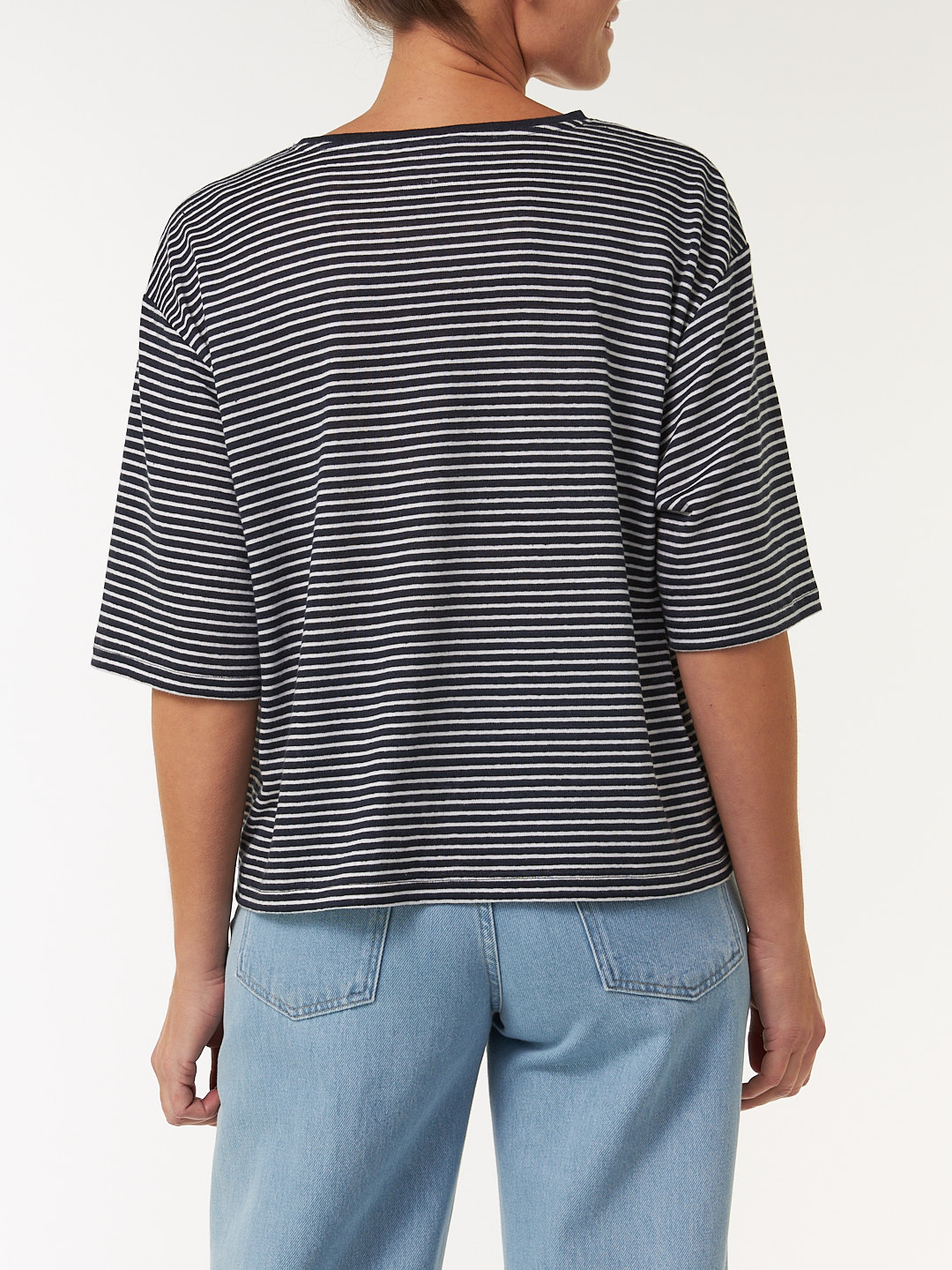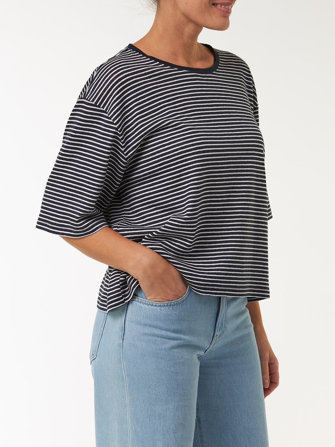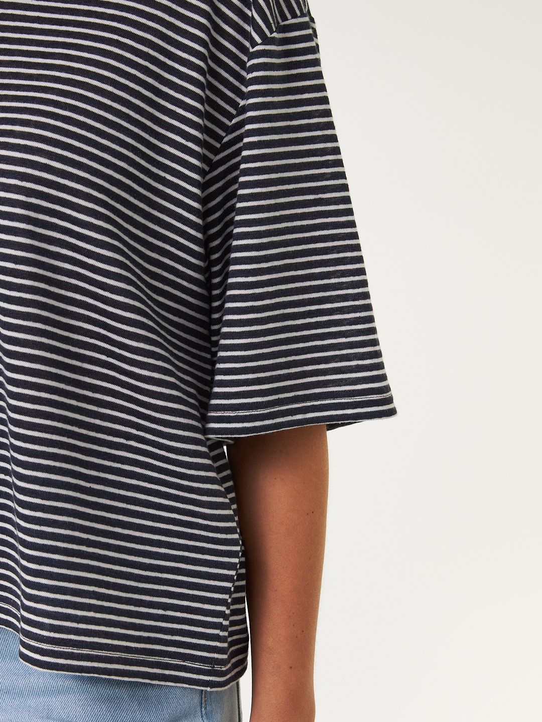 Lässig geschnittenes Loose-Shirt in hochwertiger Leinen-Baumwoll-Jersey-Qualität. Die feine Ringel-Dessinierung erhält durch eine kontrastfarbene Halsleiste einen modernen Akzent. Mit überschnittenen Schultern und kurzärmeligem, sehr legerem Schnitt entsteht ein besonders entspannter Look mit natürlicher Leichtigkeit.