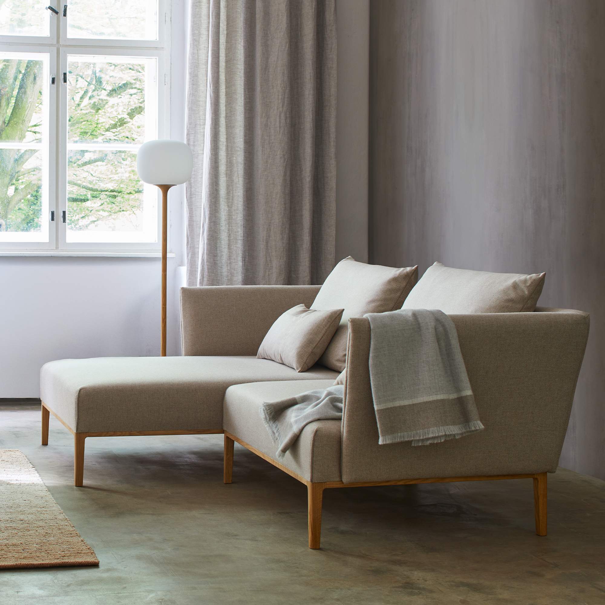 Lorea Lounge-Sofas wahren trotz ihrer Maße aufgrund der optisch zurückhaltenden, schlanken Lehnen und des zarten Holzkorpus stets Eleganz. Die bequeme Naturpolsterung und große Kissen sorgen für ebenso hohen wie ungezwungenen Sitz- und Liegekomfort. Gestaltungselement mit Augenzwinkern: die „gedoppelte“ Armlehne.
