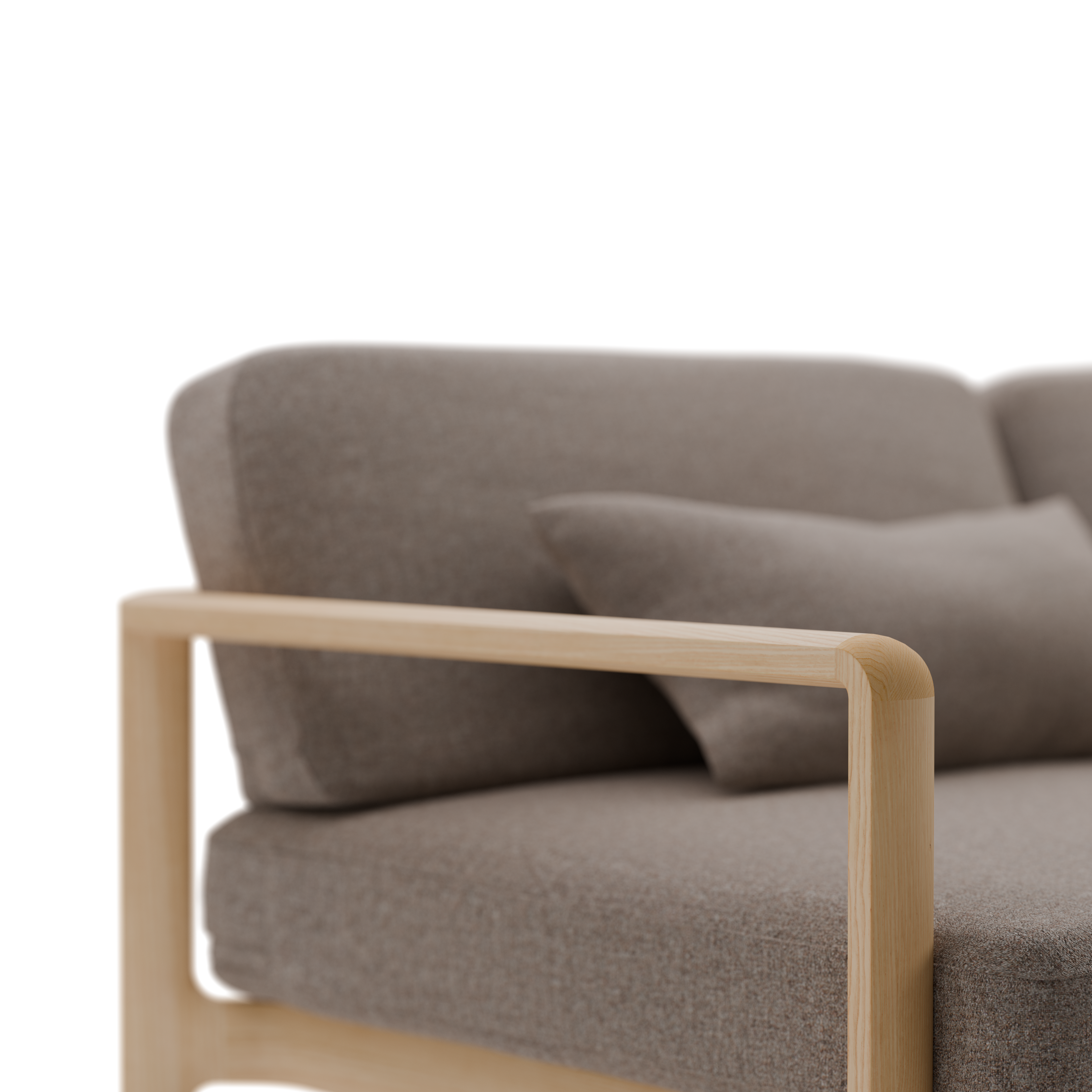 Der elegante, schlanke, feinsinnige Sofarahmen aus fix verleimtem Massivholz – mit sanften, verrundeten, fließenden Übergängen und Verbindungen – umfängt die Polsterelemente relingartig und gibt dem Sofa auch eine reizvolle Rückenansicht.