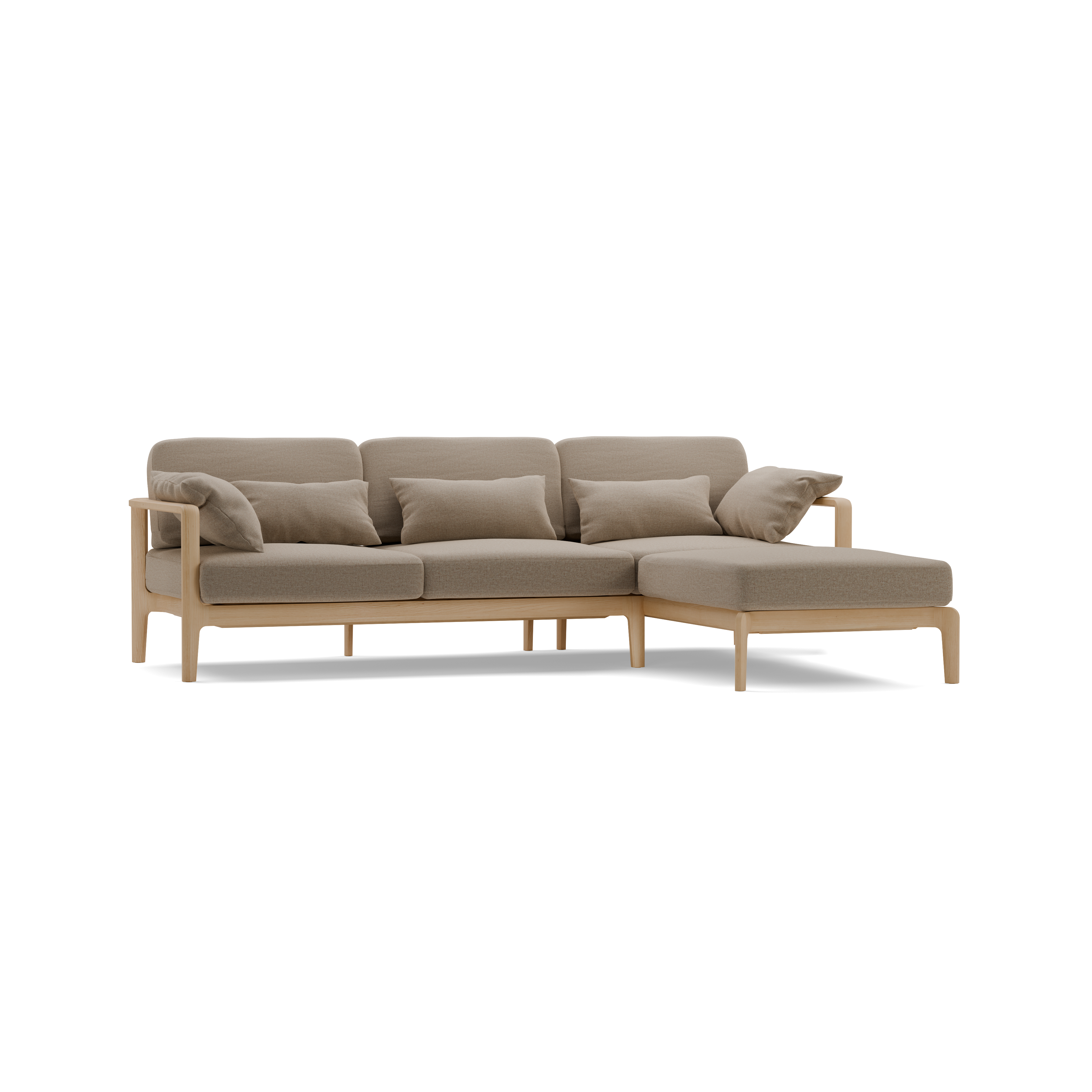 Der elegante, schlanke, feinsinnige Sofarahmen aus fix verleimtem Massivholz – mit sanften, verrundeten, fließenden Übergängen und Verbindungen – umfängt die Polsterelemente relingartig und gibt dem Sofa auch eine reizvolle Rückenansicht.