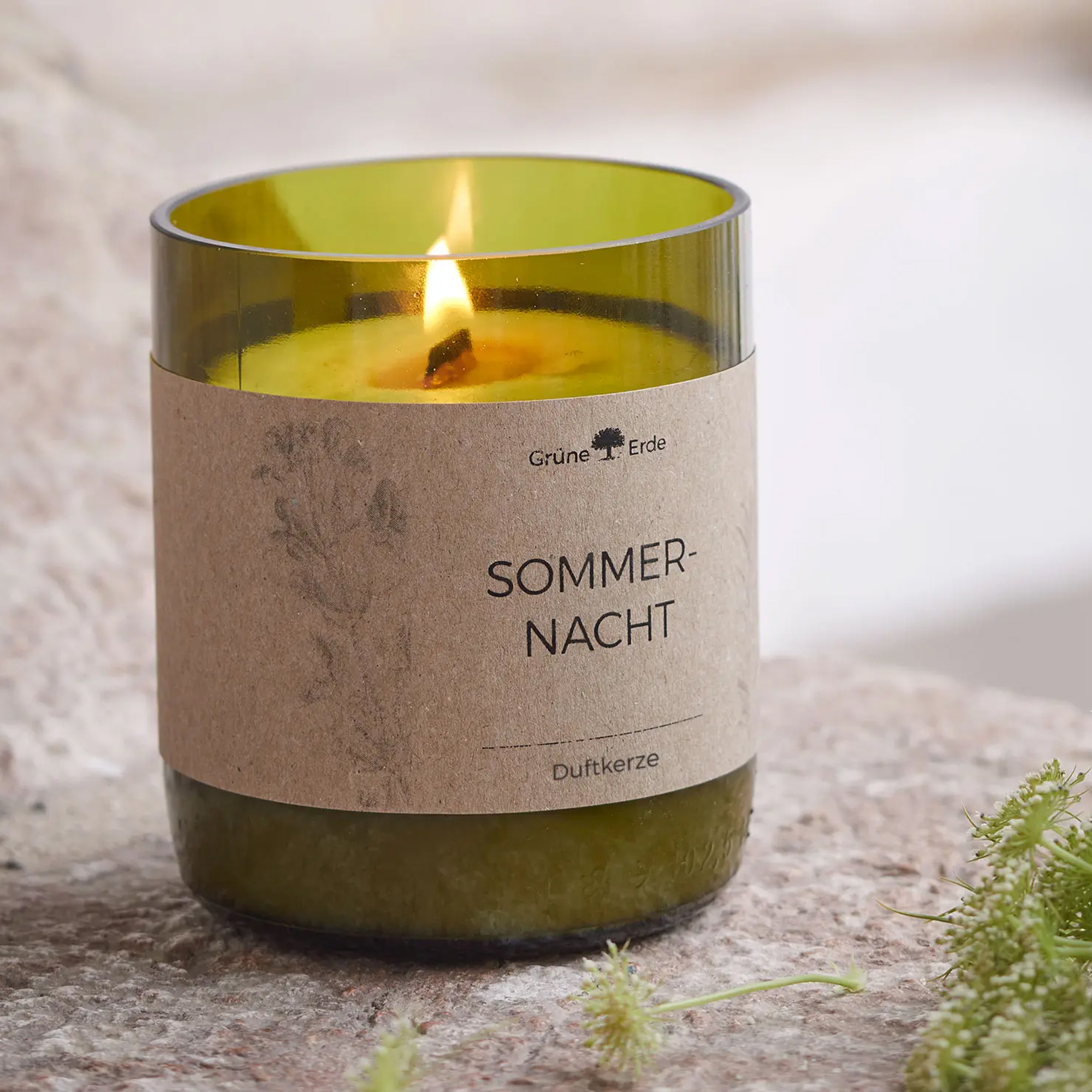 Natürliche Duftkerzen aus Rapswachs in einer grünen rezyklierten Glasflasche