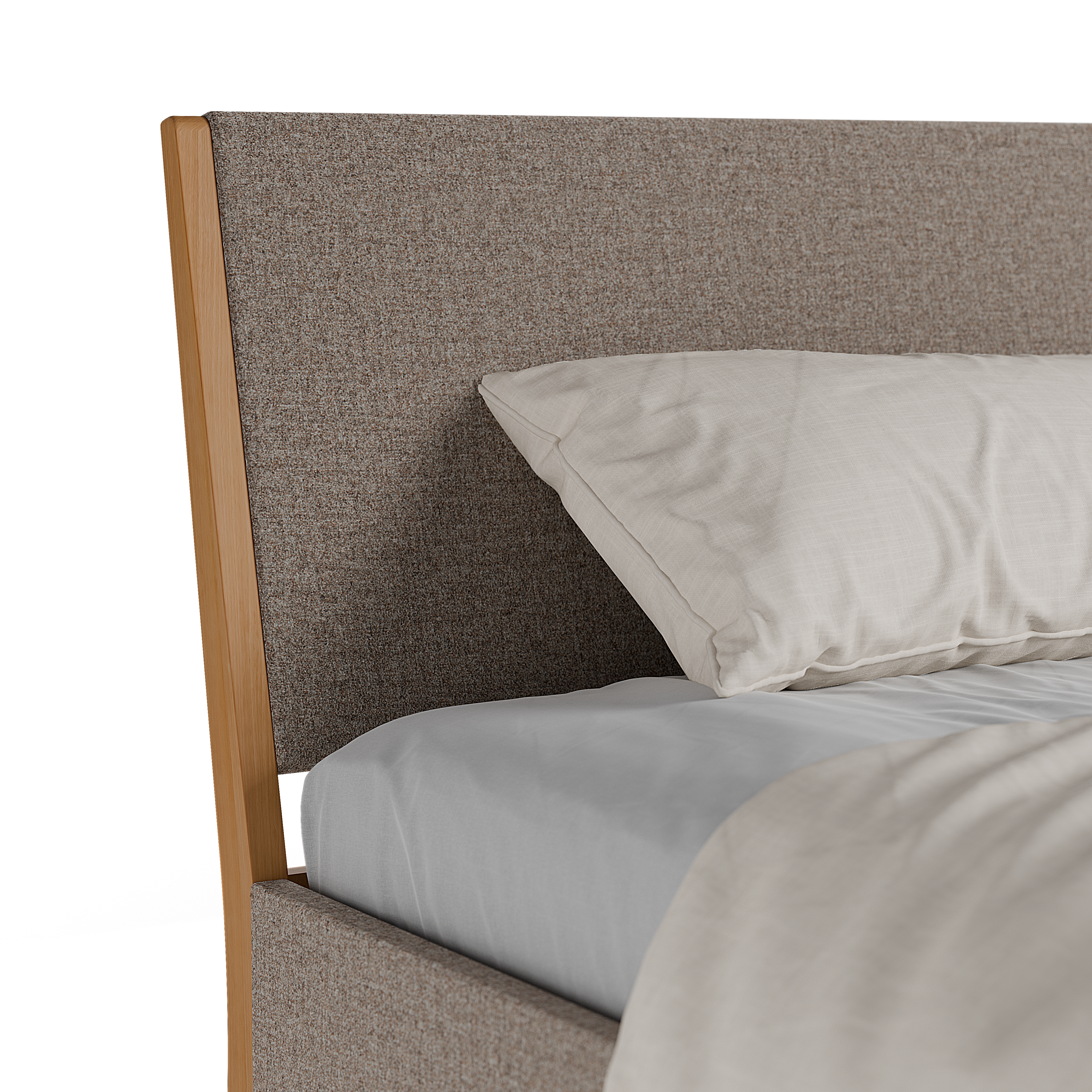 Die gepolsterten Teile von Almeno harmonieren gut mit dessen schlanken, sichtbaren Holzteilen und verleihen dem Bett eine sicht- und fühlbare Eleganz.