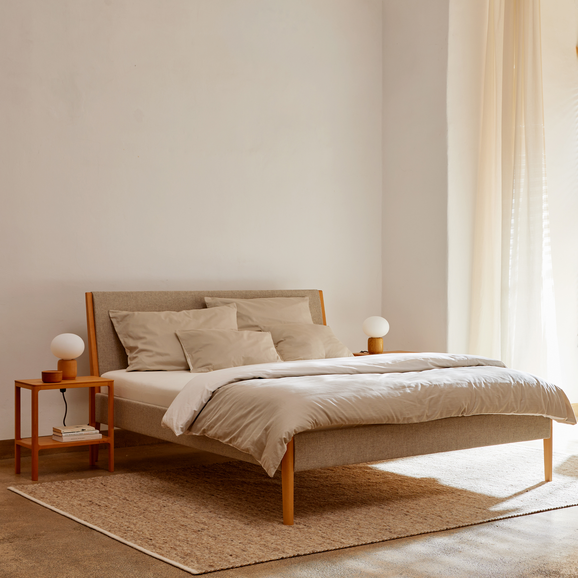 Die gepolsterten Teile von Almeno harmonieren gut mit dessen schlanken, sichtbaren Holzteilen und verleihen dem Bett eine sicht- und fühlbare Eleganz.