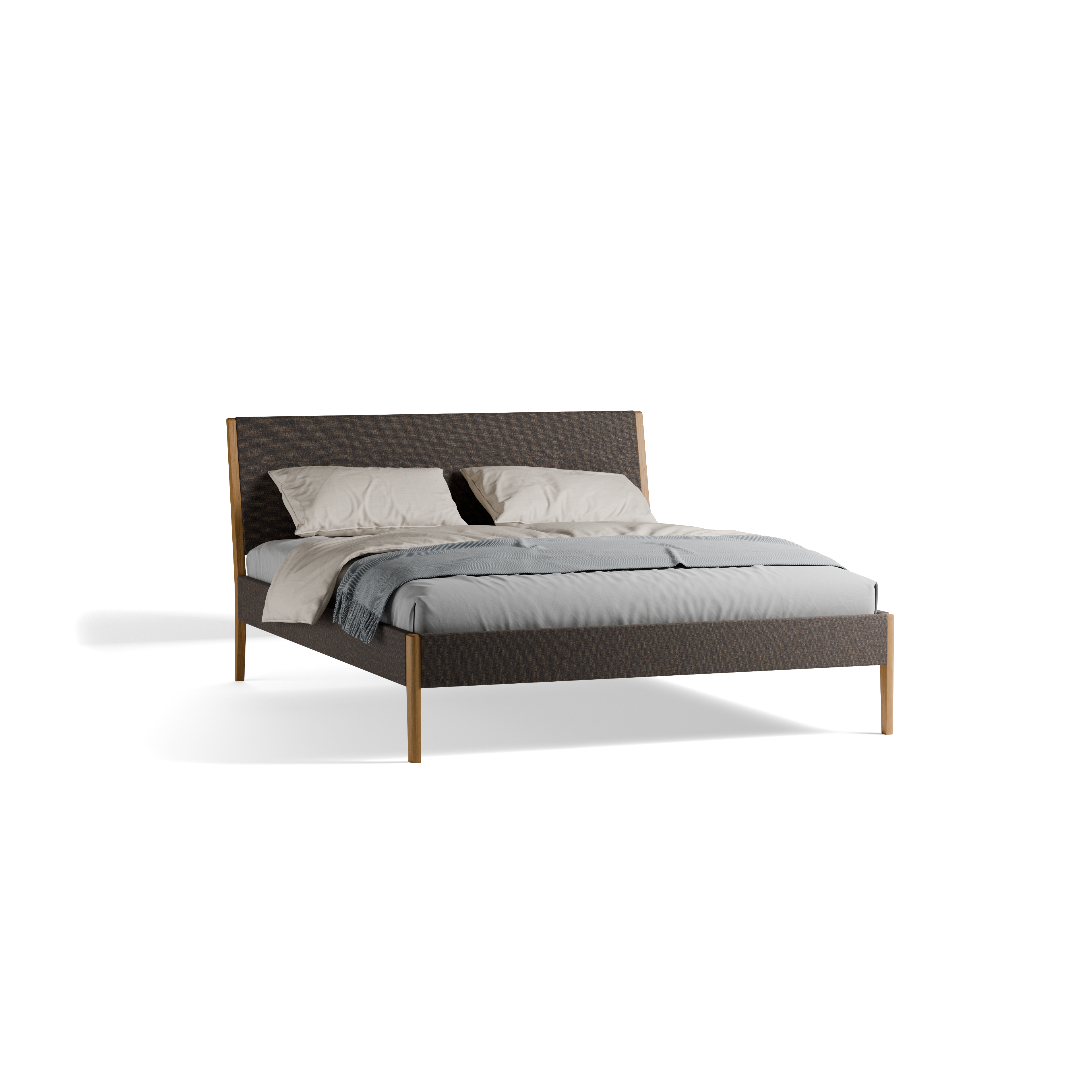 Die gepolsterten Teile von Almeno harmonieren gut mit dessen schlanken, sichtbaren Holzteilen und verleihen dem Bett eine sicht- und fühlbare Eleganz.