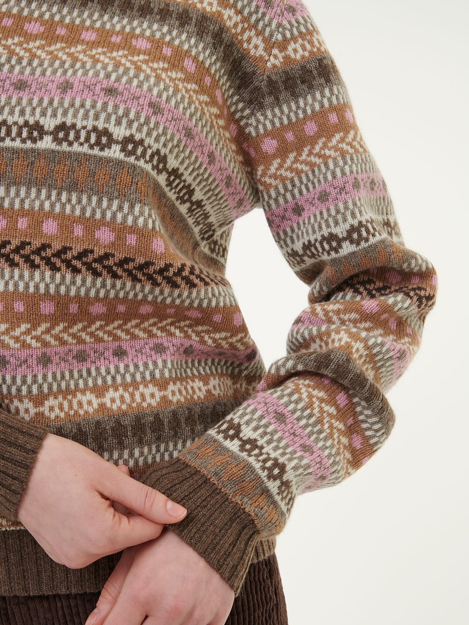 Edle Yakwolle, wertvolles Kamelhaar und wärmende Schurwolle werden kombiniert und es entsteht ein anschmiegsam-weicher Begleiter für die kühlere Jahreszeit. Das nordisch inspirierte Dessin wird mit ungefärbten Naturgarnen perfektioniert, der klassische Schnitt mit den breiten Ripp-Details an den Abschlüssen lockert die Silhouette auf.
