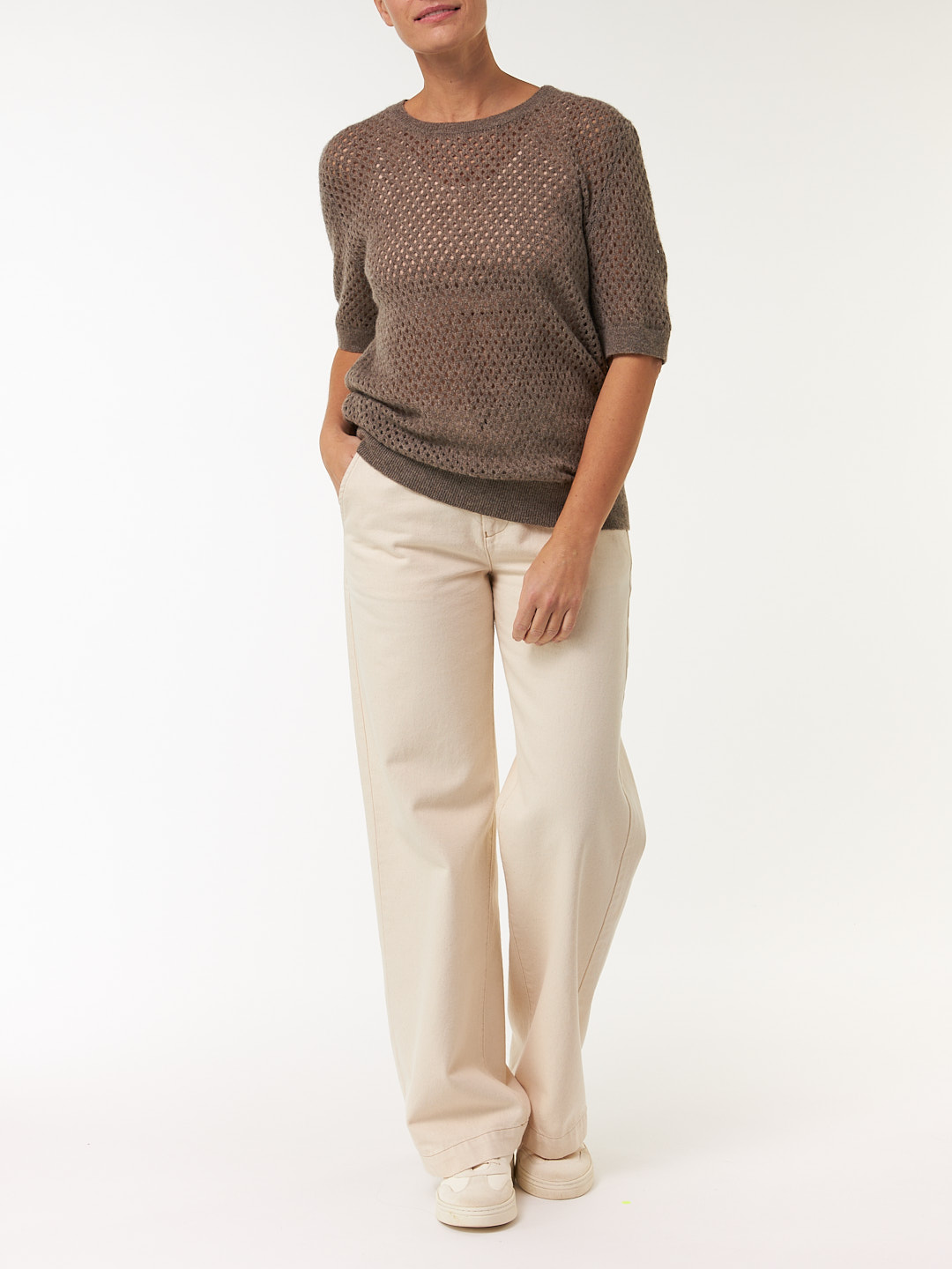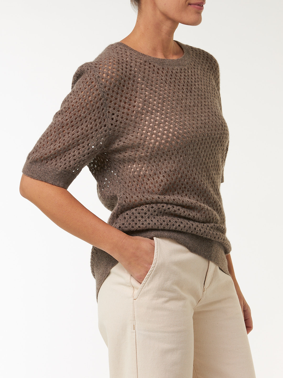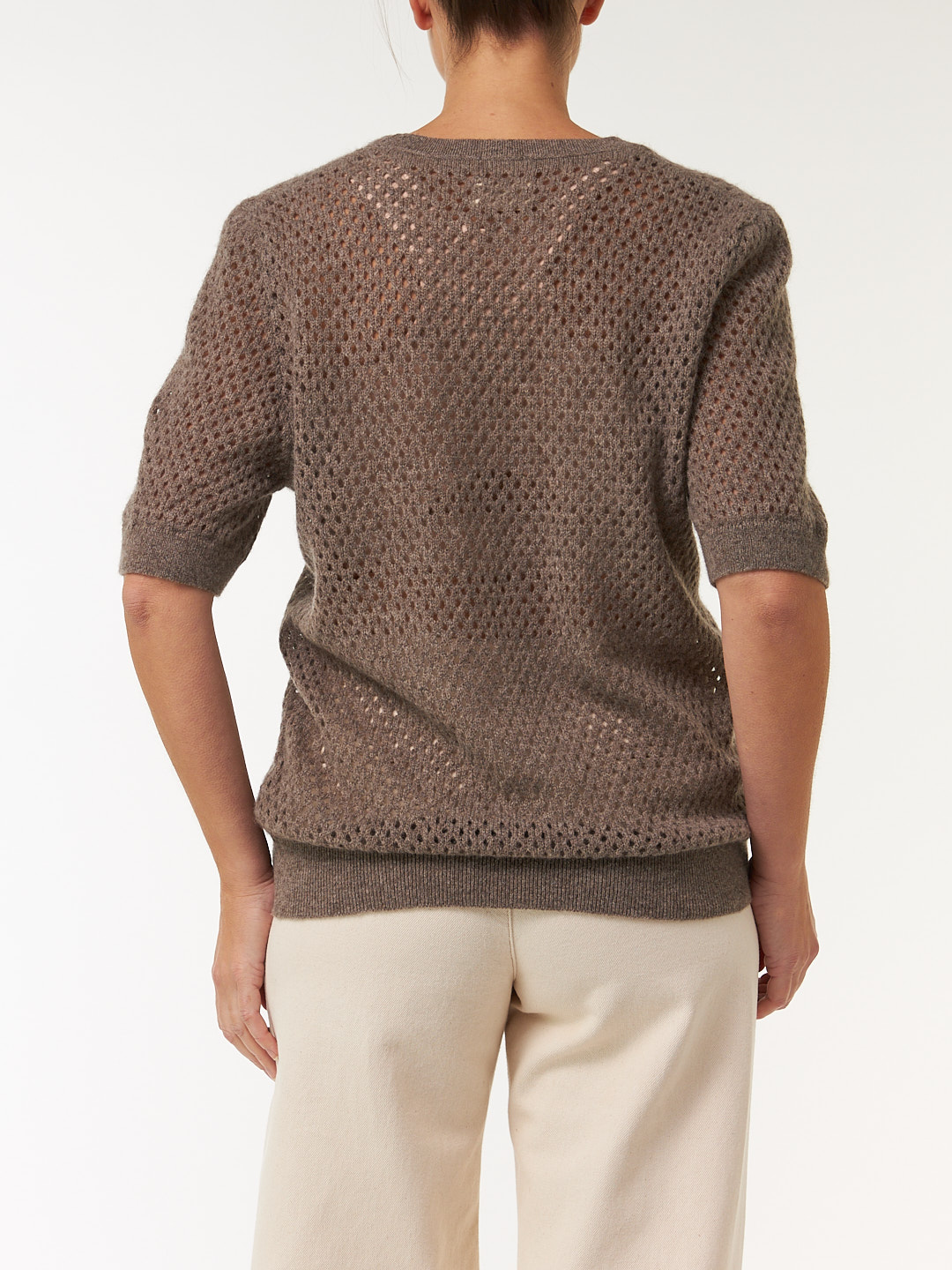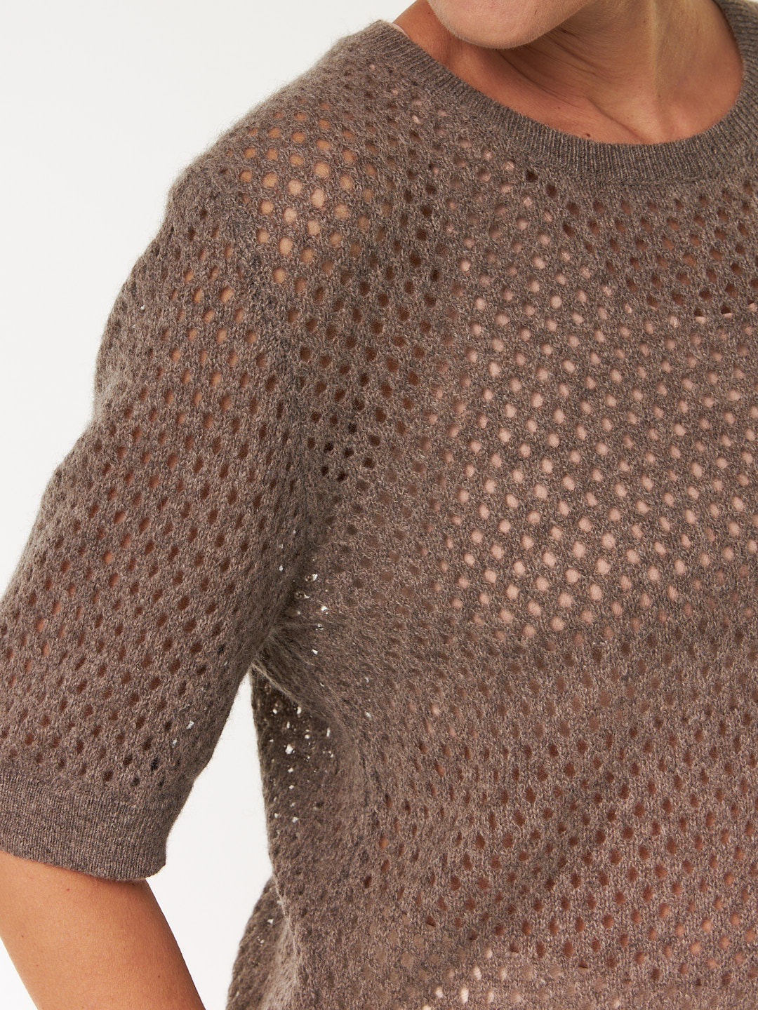 Der Kurzarm-Pullover aus edlem Yakhaar besticht mit einer feinen Mesh-Struktur. Die lockere, luftige Passform wird mit kleinen Details – wie Rippbündchen an Saum und Ärmelabschluss  – harmonisch abgerundet.