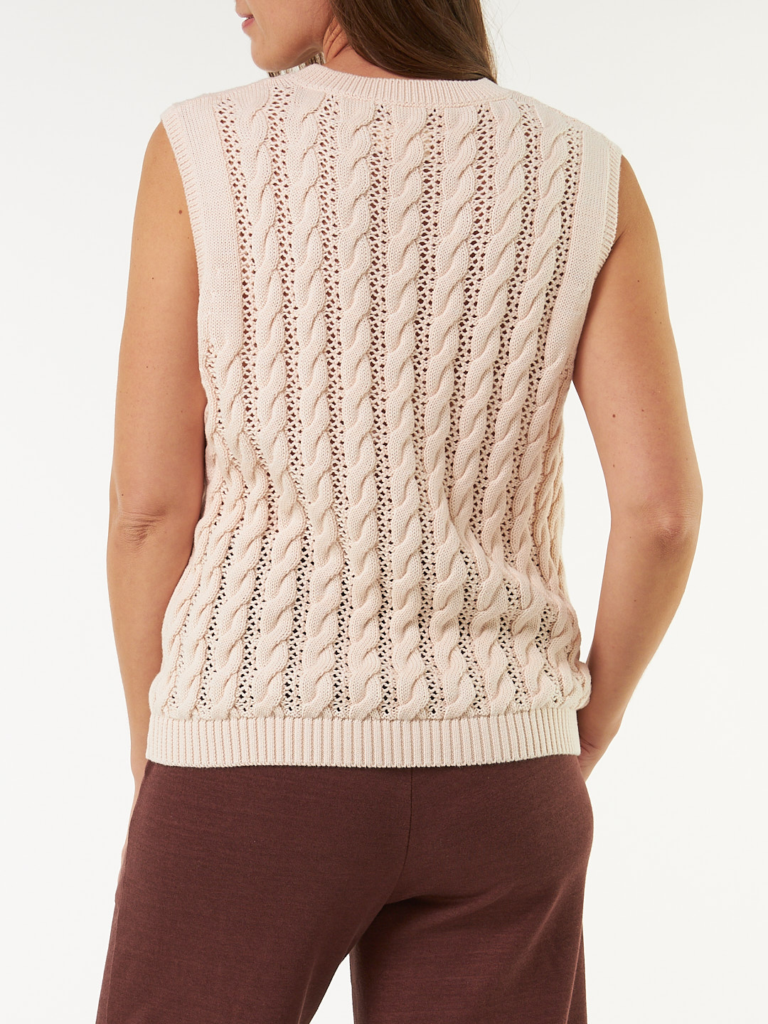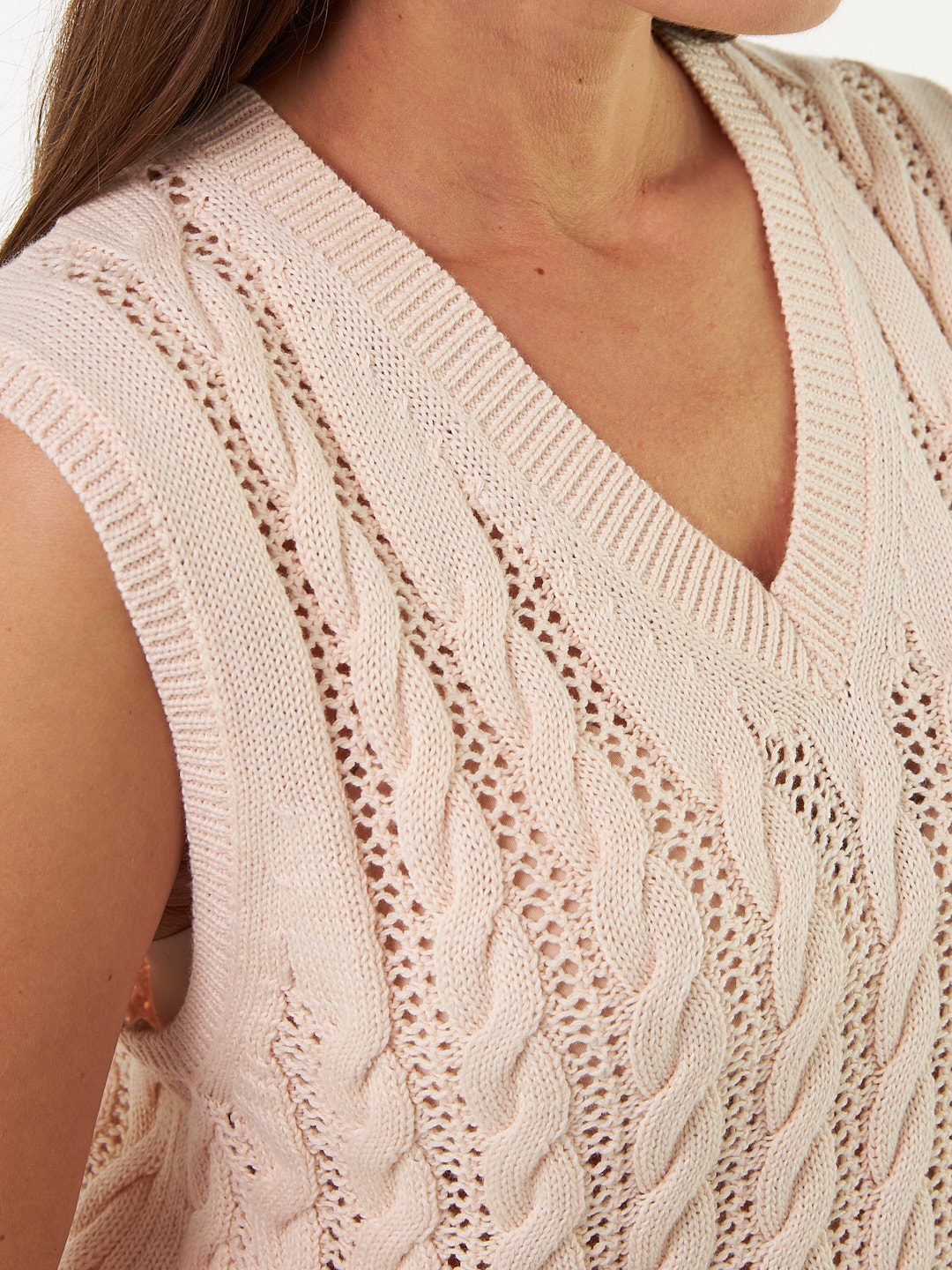 Zeitloser Pullunder überzeugt mit Loch- und Zopfmuster, die für einen modernen und lebendigen Look sorgen. Der tiefe V-Ausschnitt verleiht dem Pullunder eine elegante Note, während das hochwertige Naturmaterial ein angenehm-weiches Tragegefühl schenkt. Breite Rippbündchen an den Abschlüssen runden die figurumspielende Silhouette harmonisch ab.