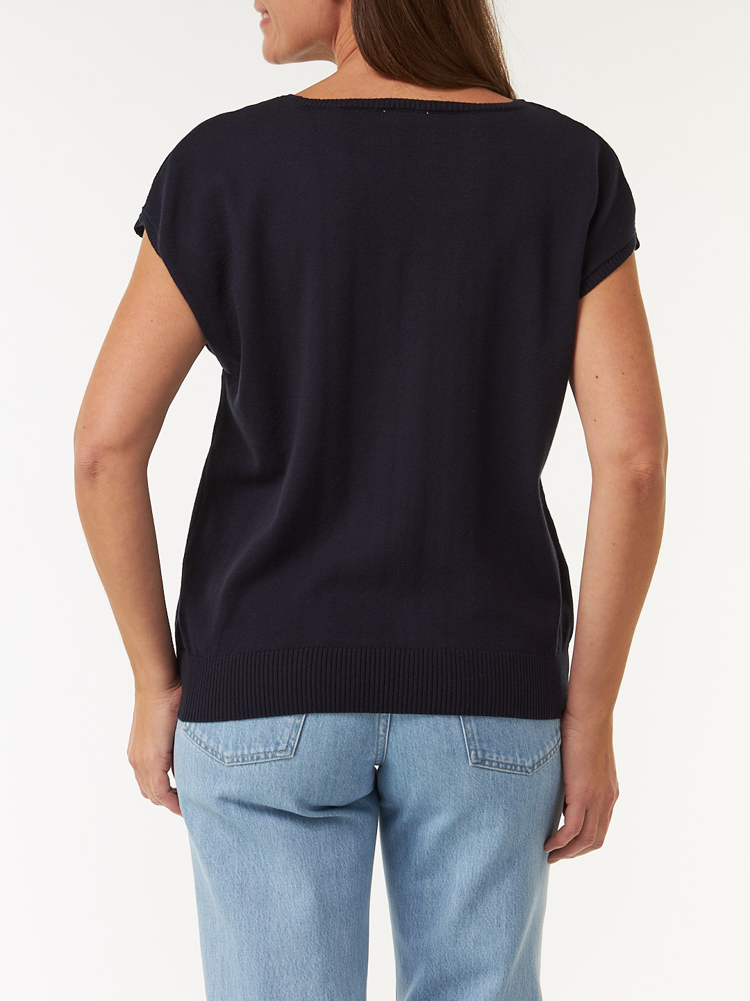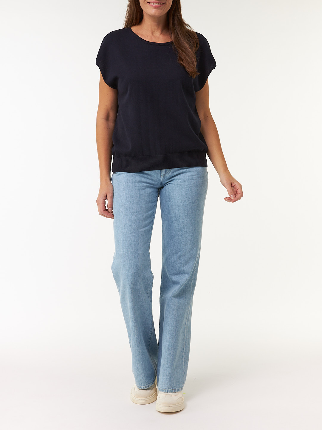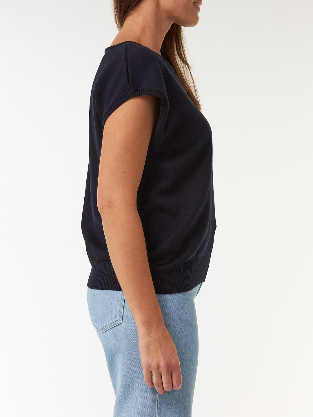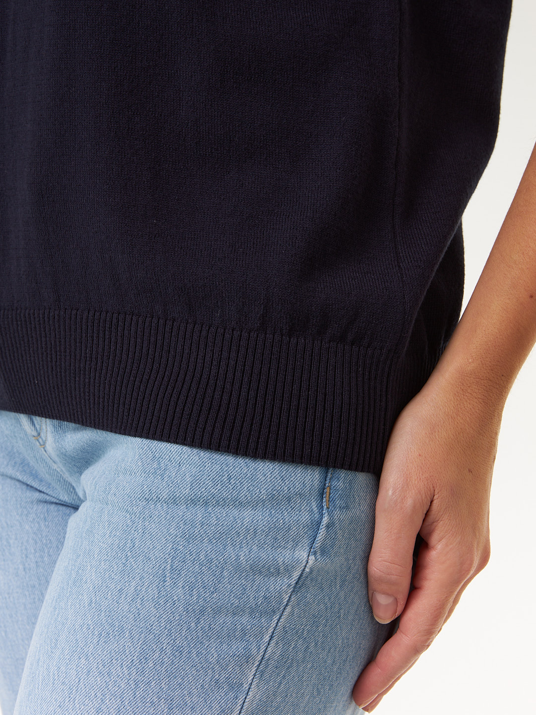 Das ärmellose Stricktop überzeugt durch hochwertige Pima-Baumwolle – sanft zur Haut, anschmiegsam und weich. Überschnittene Schultern und kontrastfarbene Rippbündchen an den Abschlüssen prägen den legeren Schnitt und verleihen dem Top eine moderne, komfortable Silhouette.