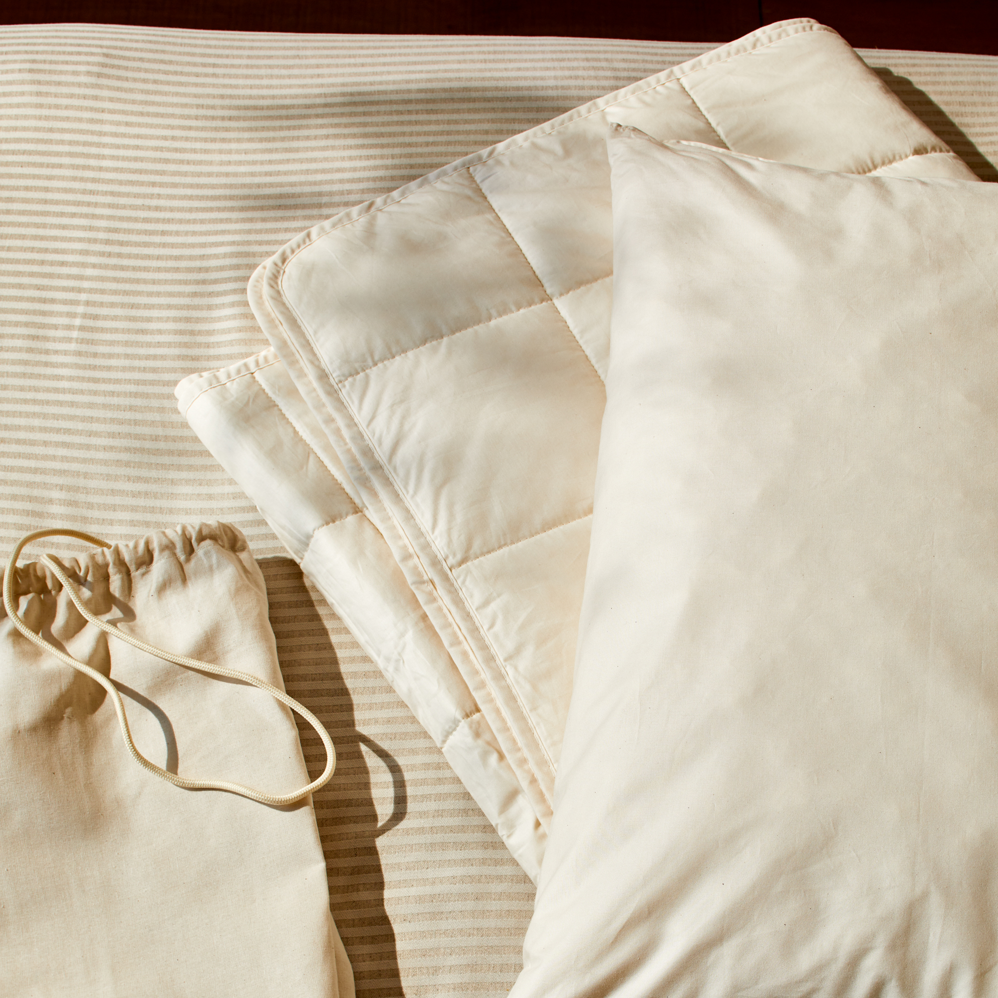 Reiseset Pur – Schafschurwollkissen & Baumwolldecke im Tragebeutel
