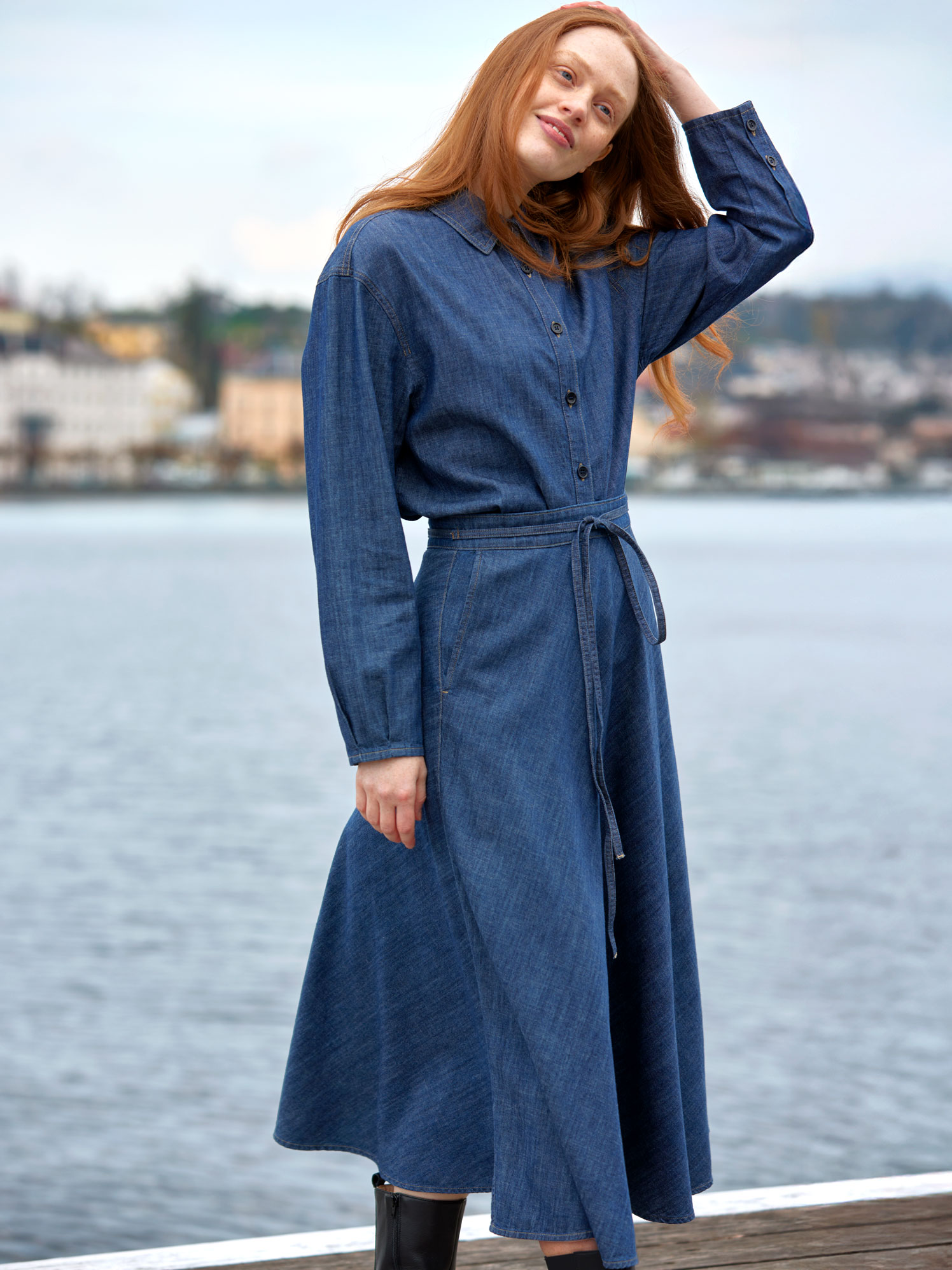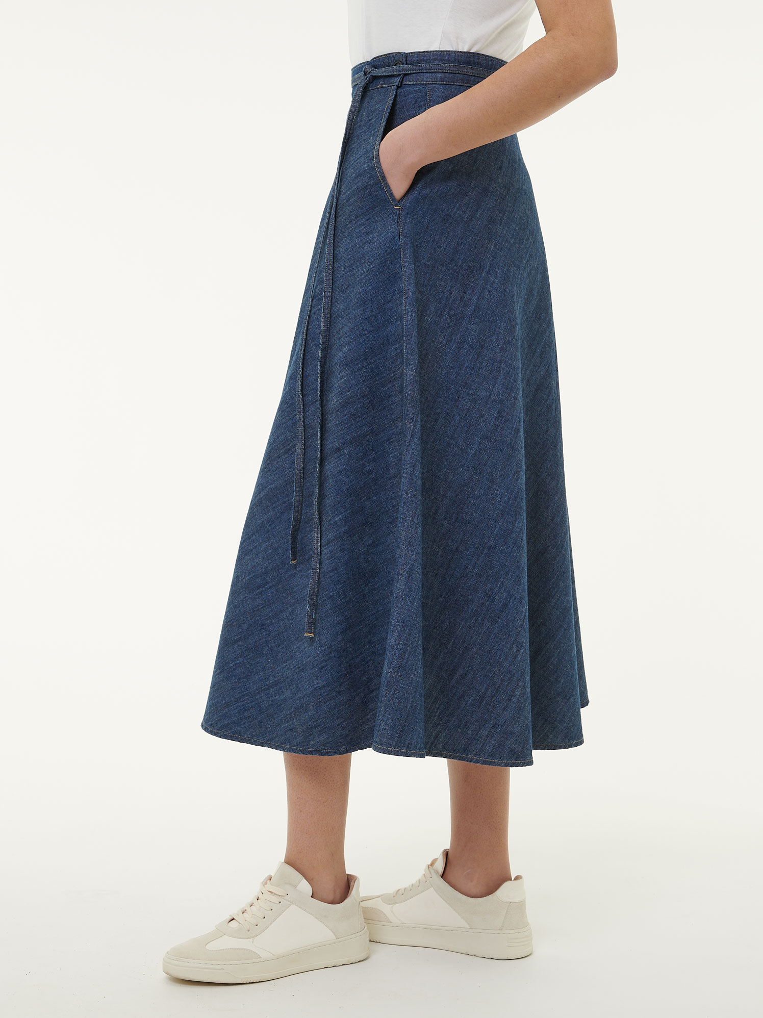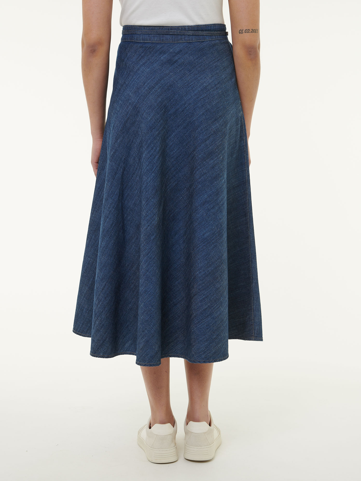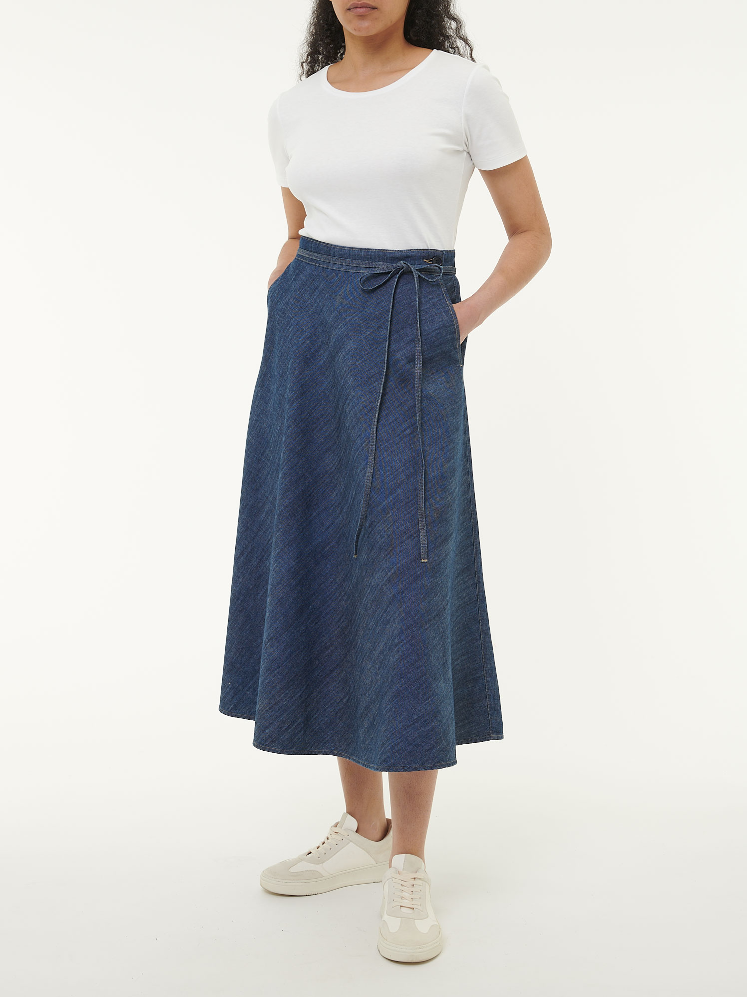 Unkomplizierter Maxi-Rock aus hochwertigem Light Denim: Das Modell in A-Linie hat zwei seitliche Eingriffstaschen auf der Vorderseite, ein seitlichen, in die Tasche integrierten Knopfverschluss zum An- und Ausziehen sowie einen schmalen Bindegürtel.