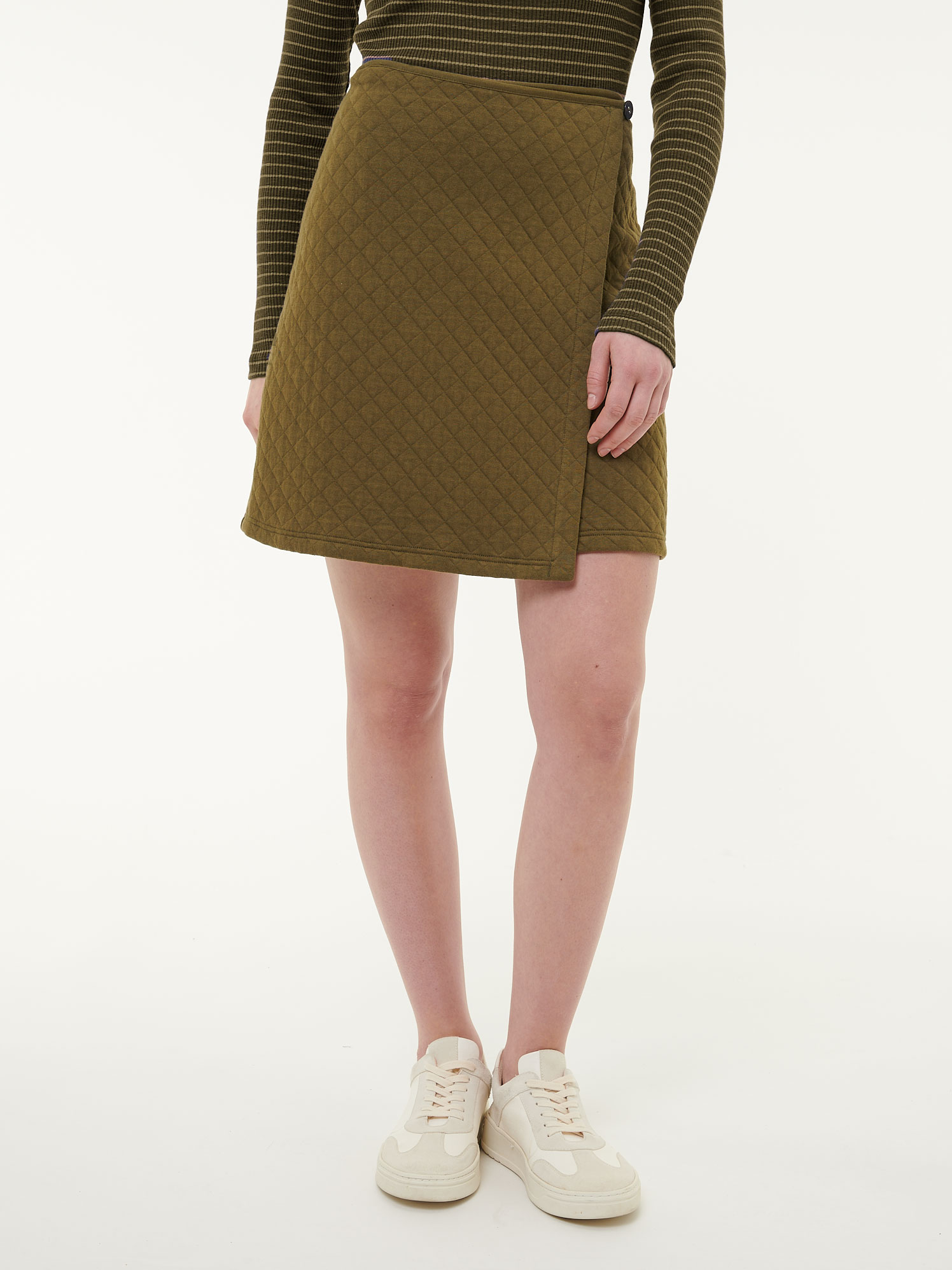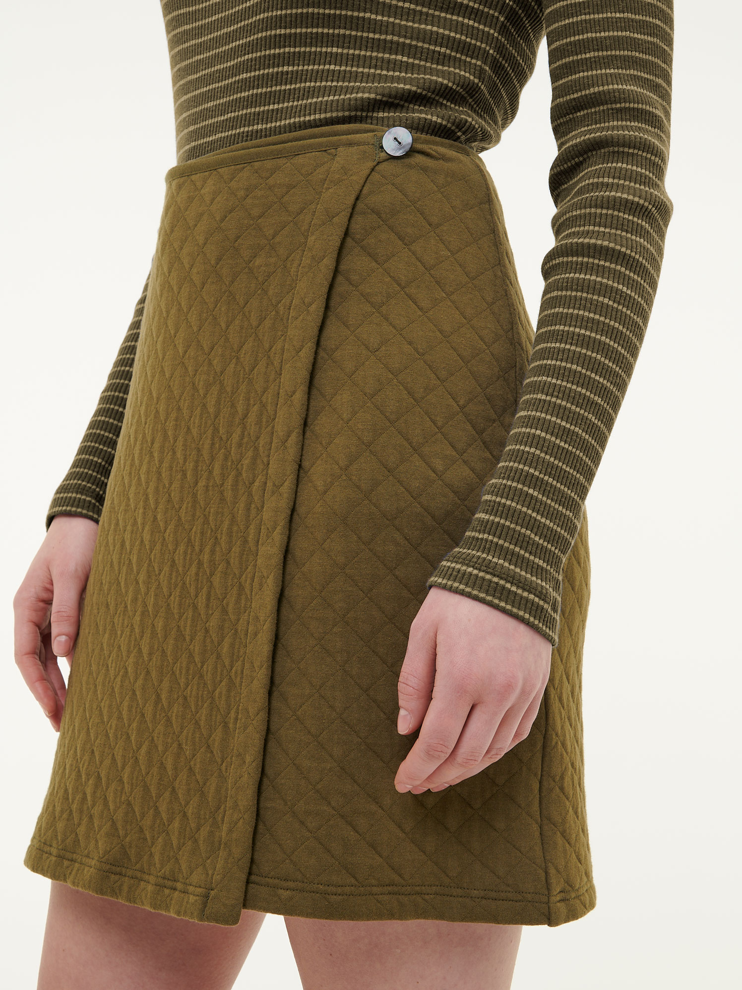 Echter Wickelrock in softem Kaktus-Grün: luftig, bequem und angenehm-weich im Griff. Ohne Bund gearbeitet, aber Kanteneinfassung mit Perlmuttknopf und einem Gegenknopf im Untertritt sorgen für sicheren Halt, während das weiche Naturmaterial – reine Baumwolle kbA, GOTS-zertifiziert – in doubliertem Strukturjersey Natürlichkeit und Qualität verspricht.